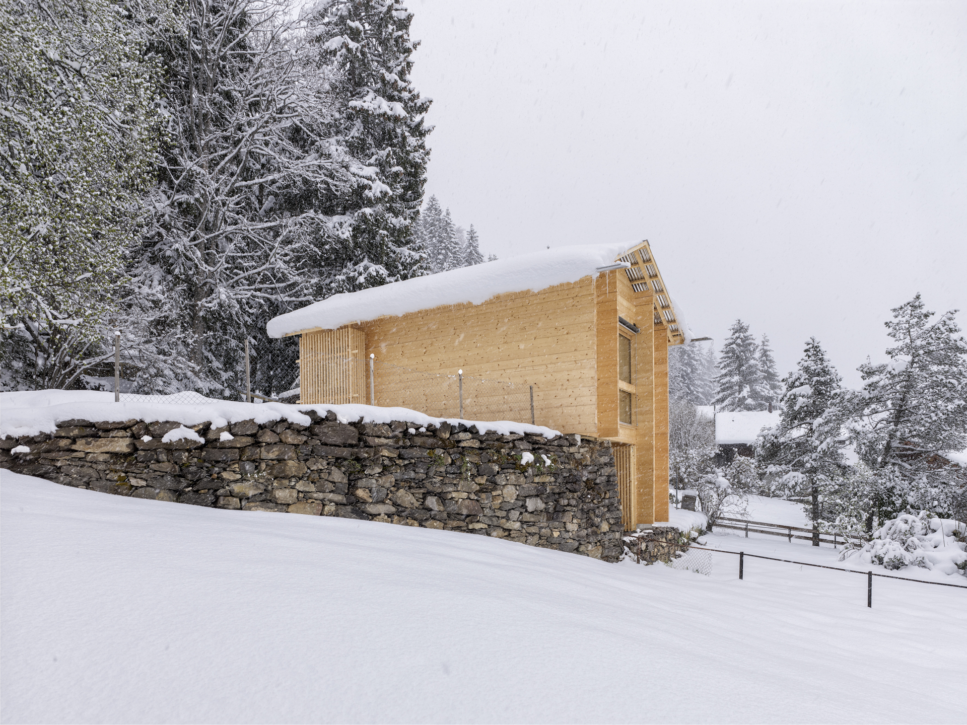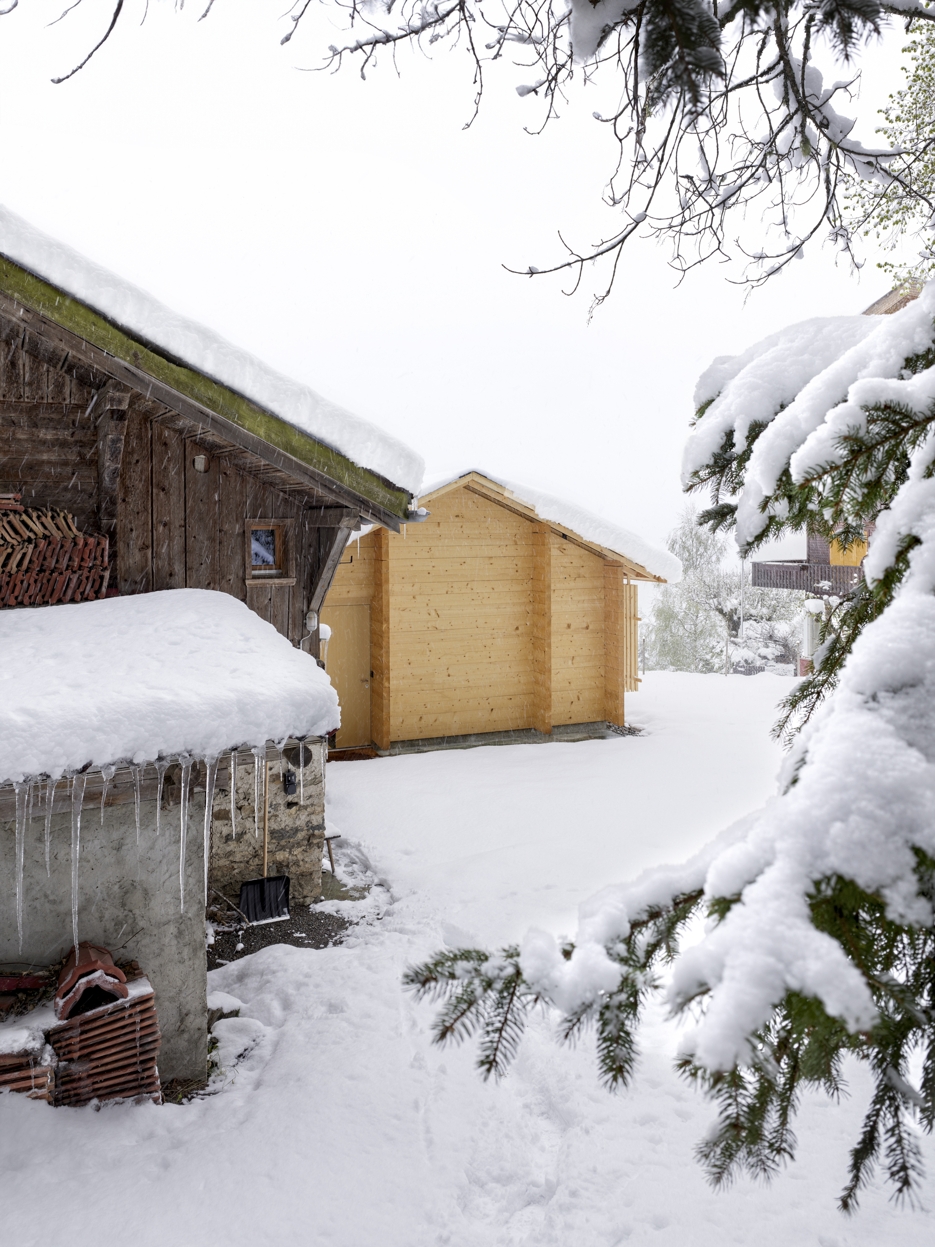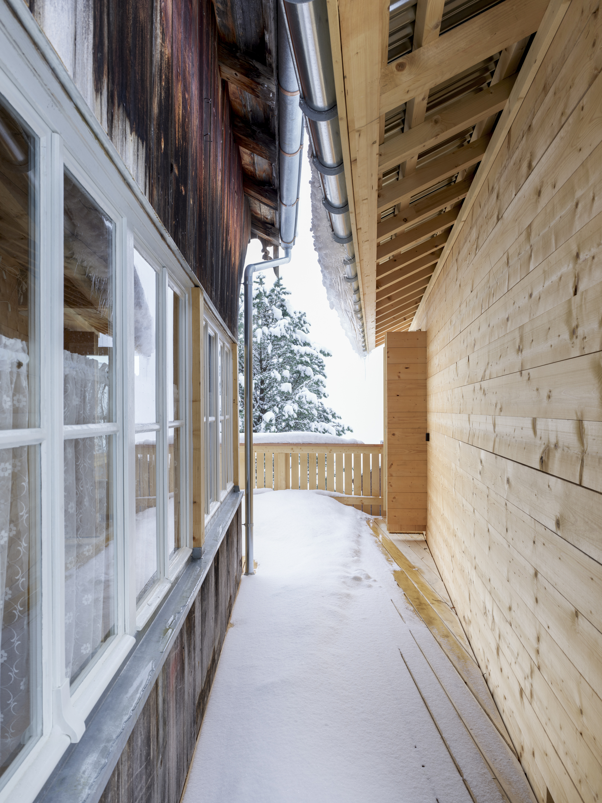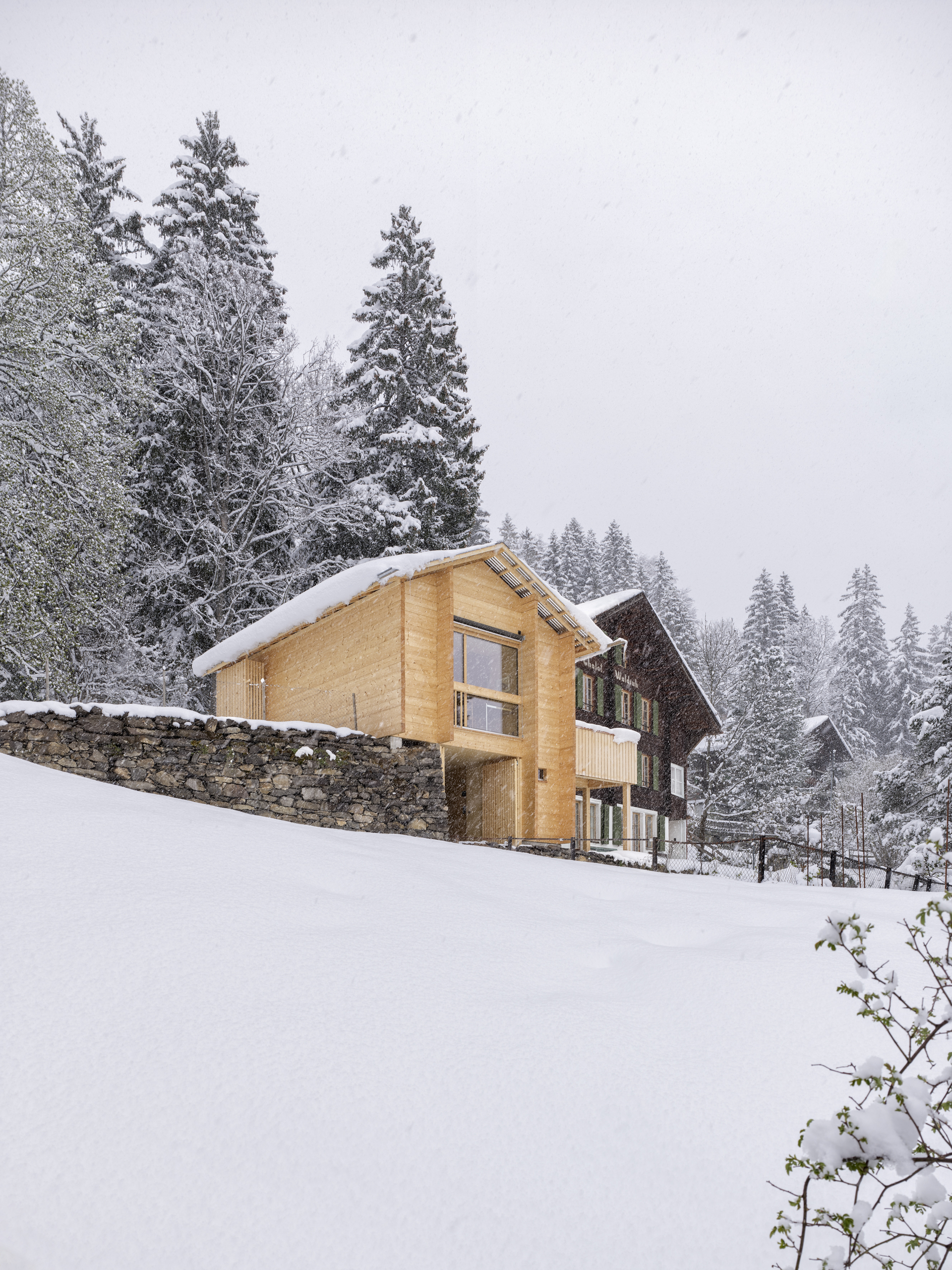 Als Erweiterung zum Mehrgenerationenhaus wurde das Ferienhaus Waldruh an der Stelle des ehemaligen Stalles mit einem zusätzlichen Schlafzimmer ergänzt. Sie bauliche Nähe der Gebäude entspricht der Struktur des Ortes und vermittelt spannungsvoll zum spektakulären Bergpanorama. Die traditionelle Fleckenbauweise und die archaische Formsprache suchen in ihrer Einfachheit die Nähe zu den alten Scheunen des Dorfes und werden sich mit den Jahren in die Patina des Ortsbildes einfügen.