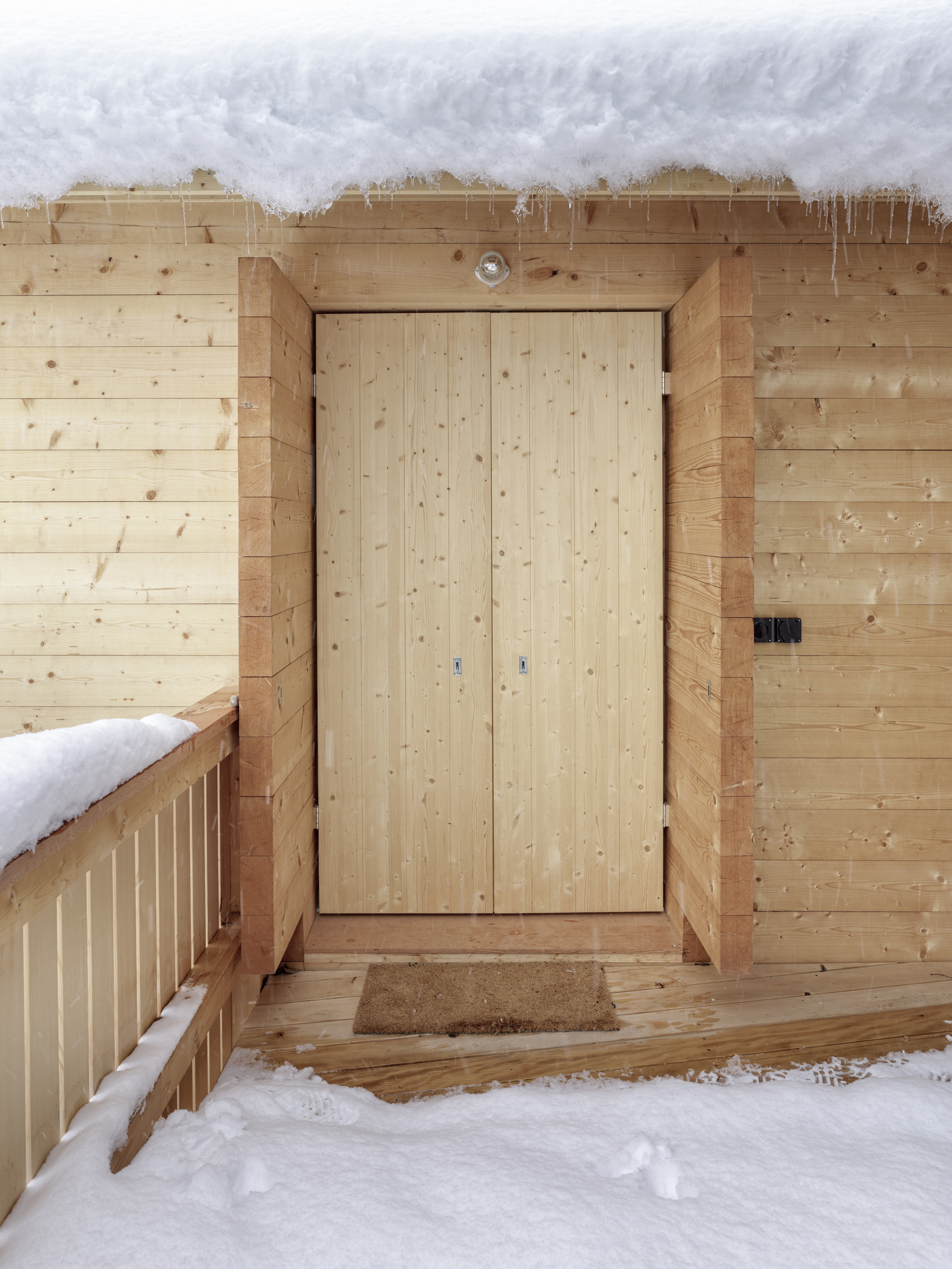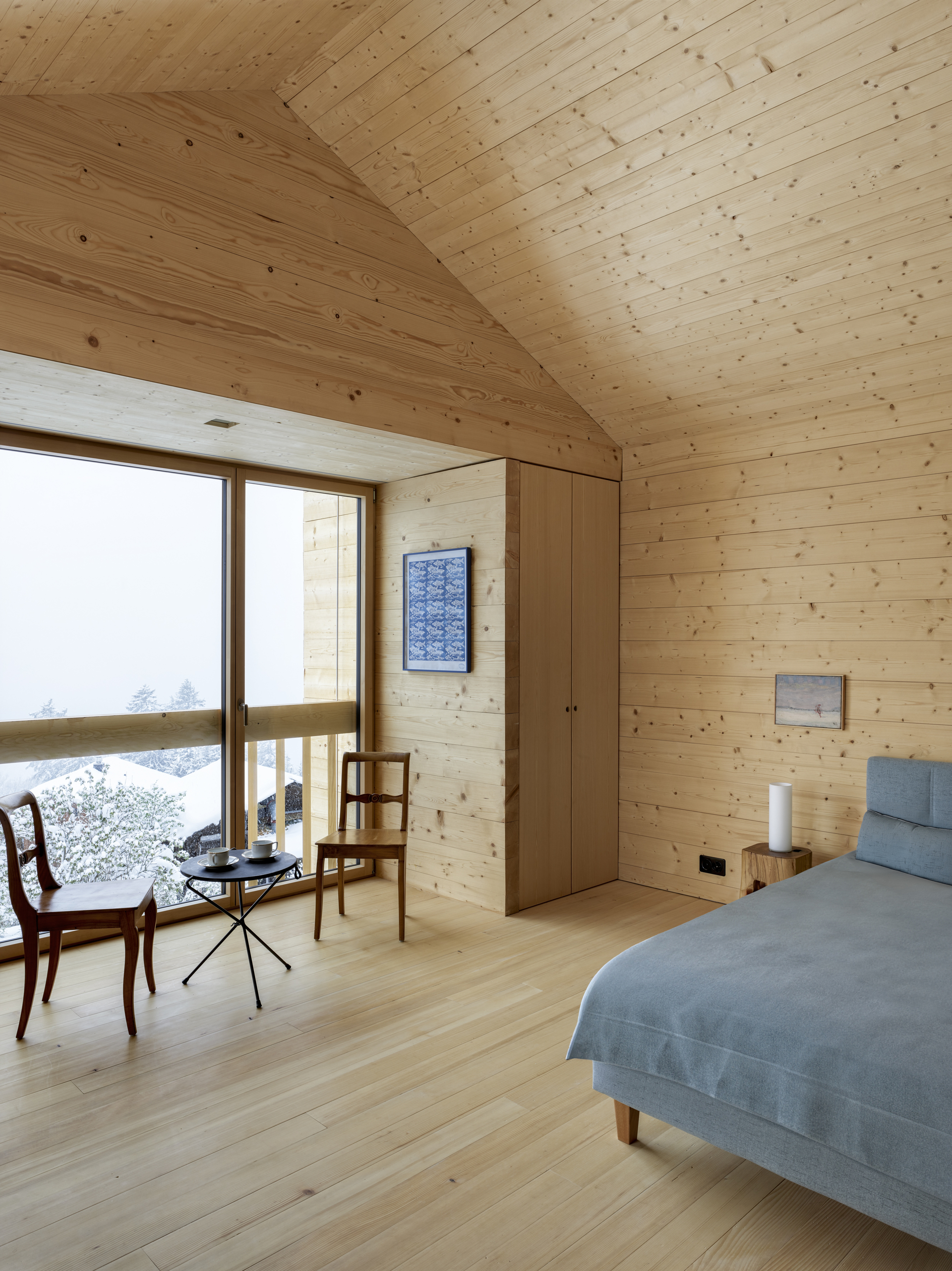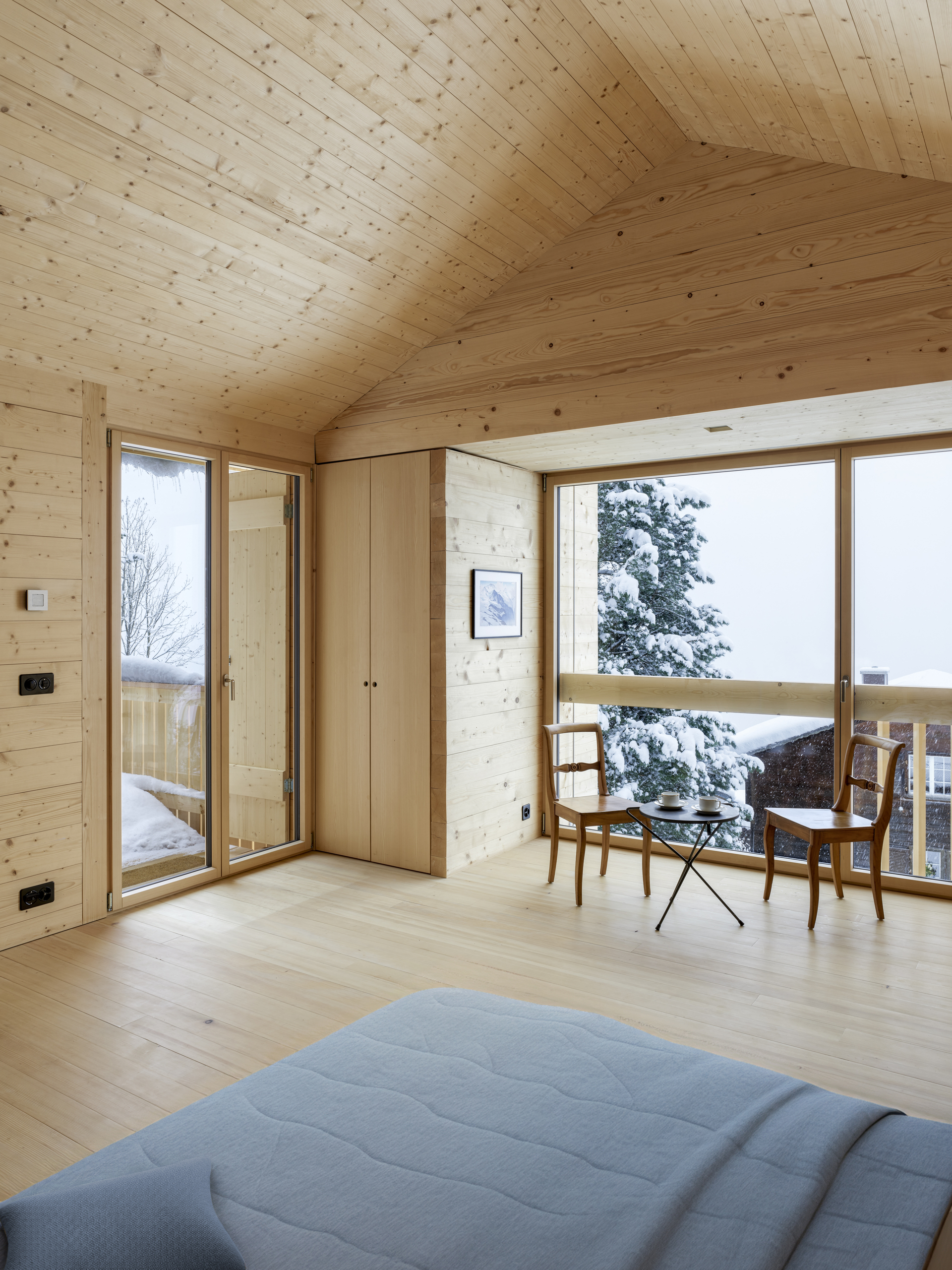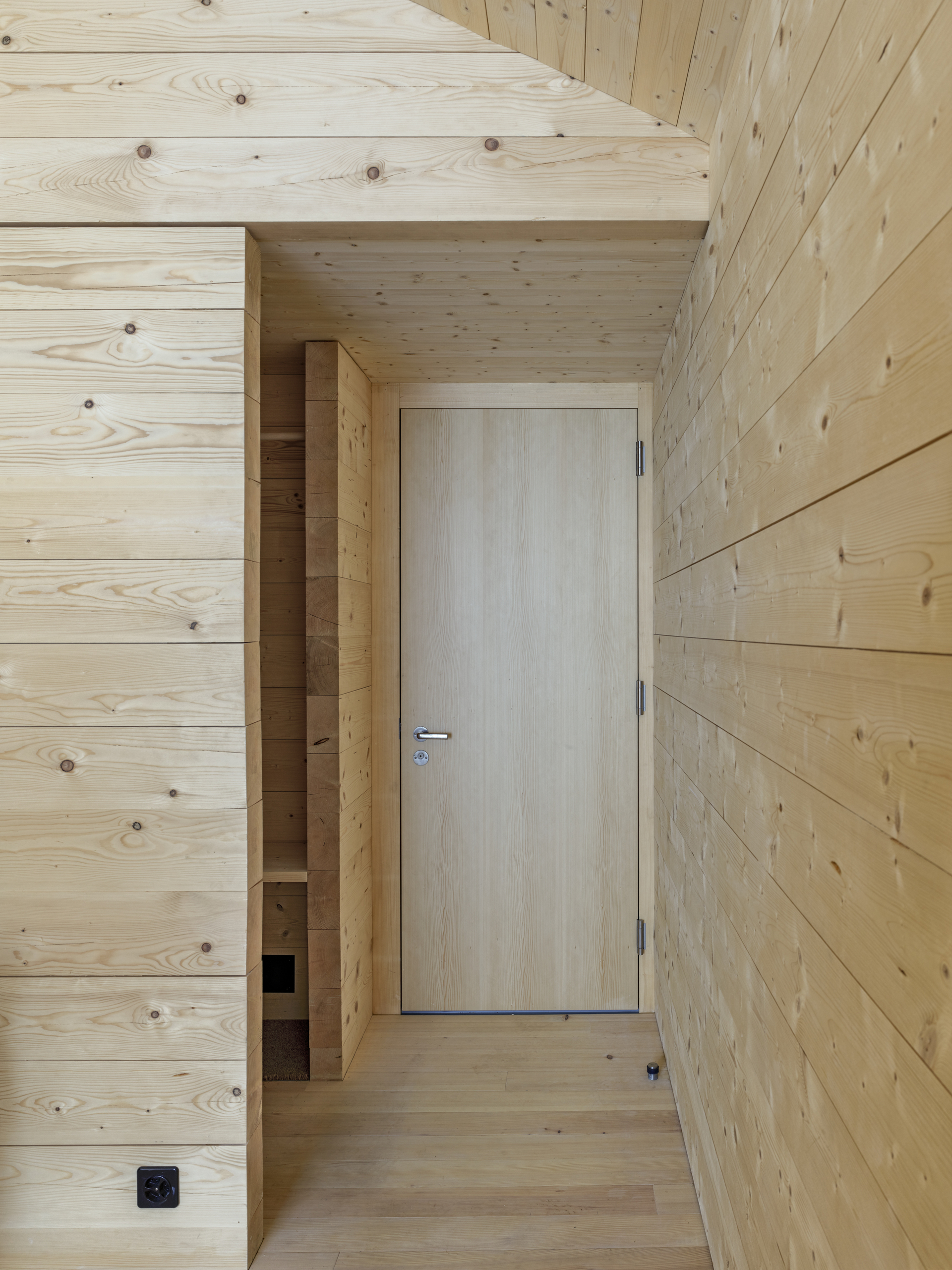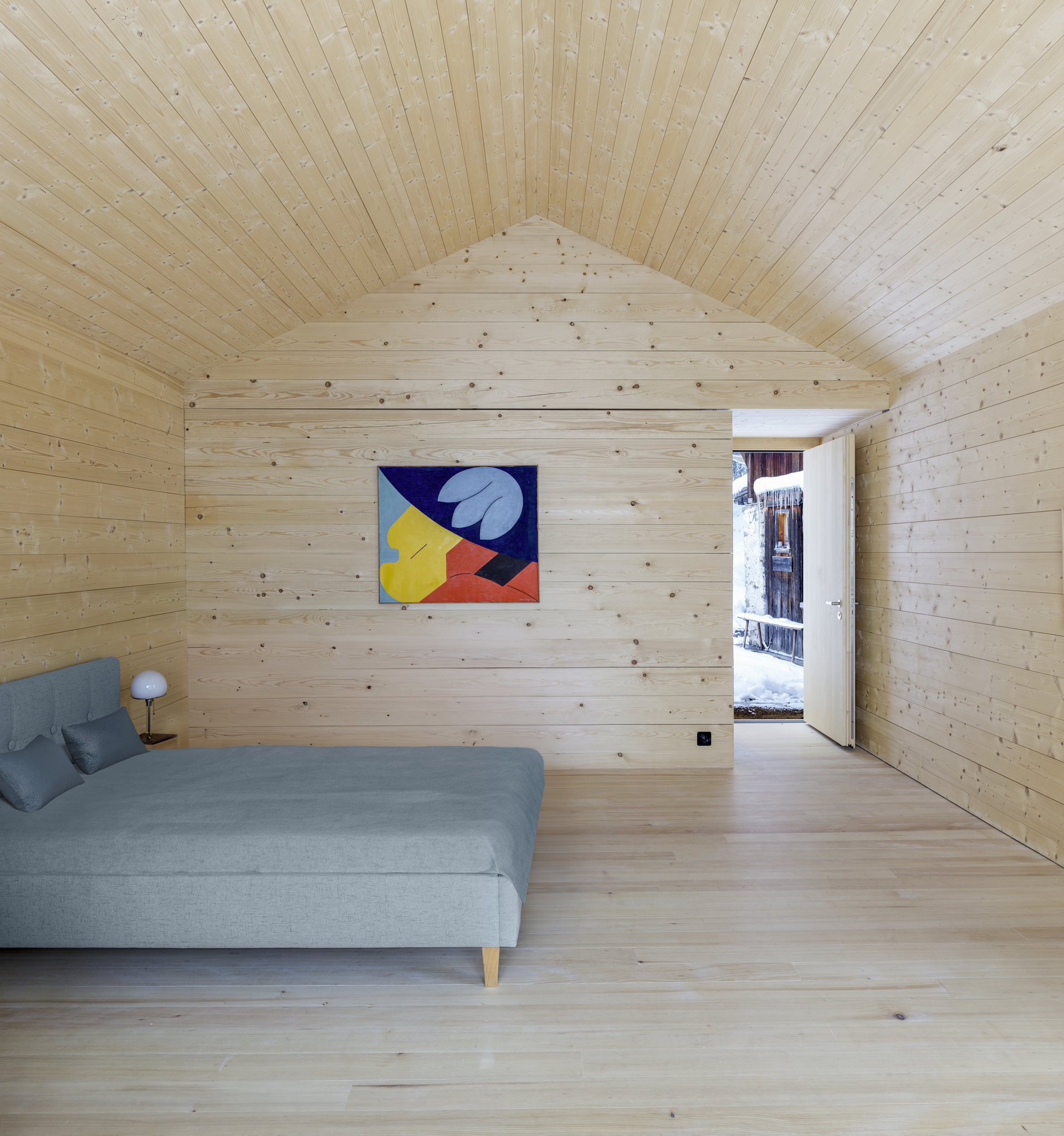 Als Erweiterung zum Mehrgenerationenhaus wurde das Ferienhaus Waldruh an der Stelle des ehemaligen Stalles mit einem zusätzlichen Schlafzimmer ergänzt. Sie bauliche Nähe der Gebäude entspricht der Struktur des Ortes und vermittelt spannungsvoll zum spektakulären Bergpanorama. Die traditionelle Fleckenbauweise und die archaische Formsprache suchen in ihrer Einfachheit die Nähe zu den alten Scheunen des Dorfes und werden sich mit den Jahren in die Patina des Ortsbildes einfügen.