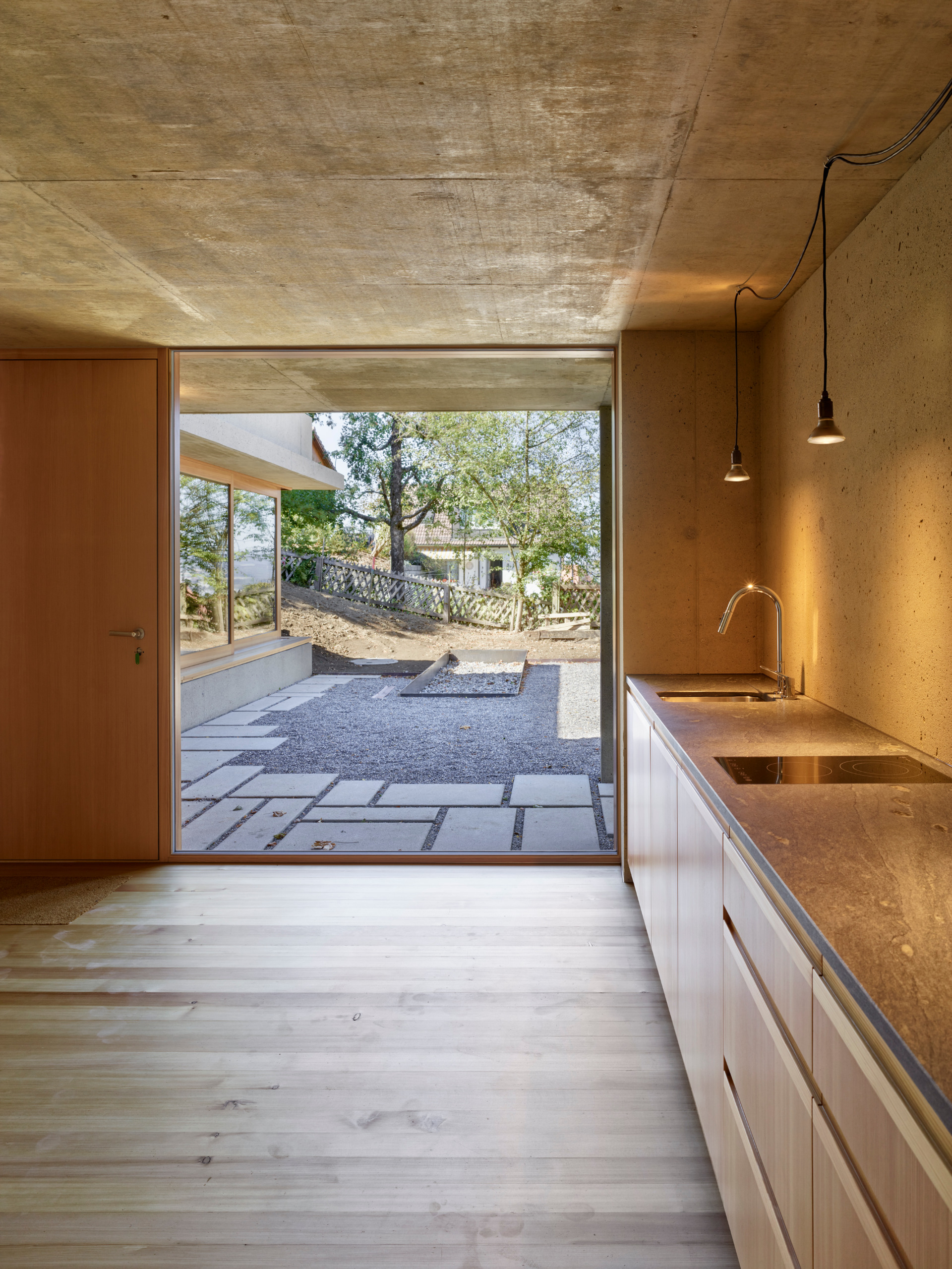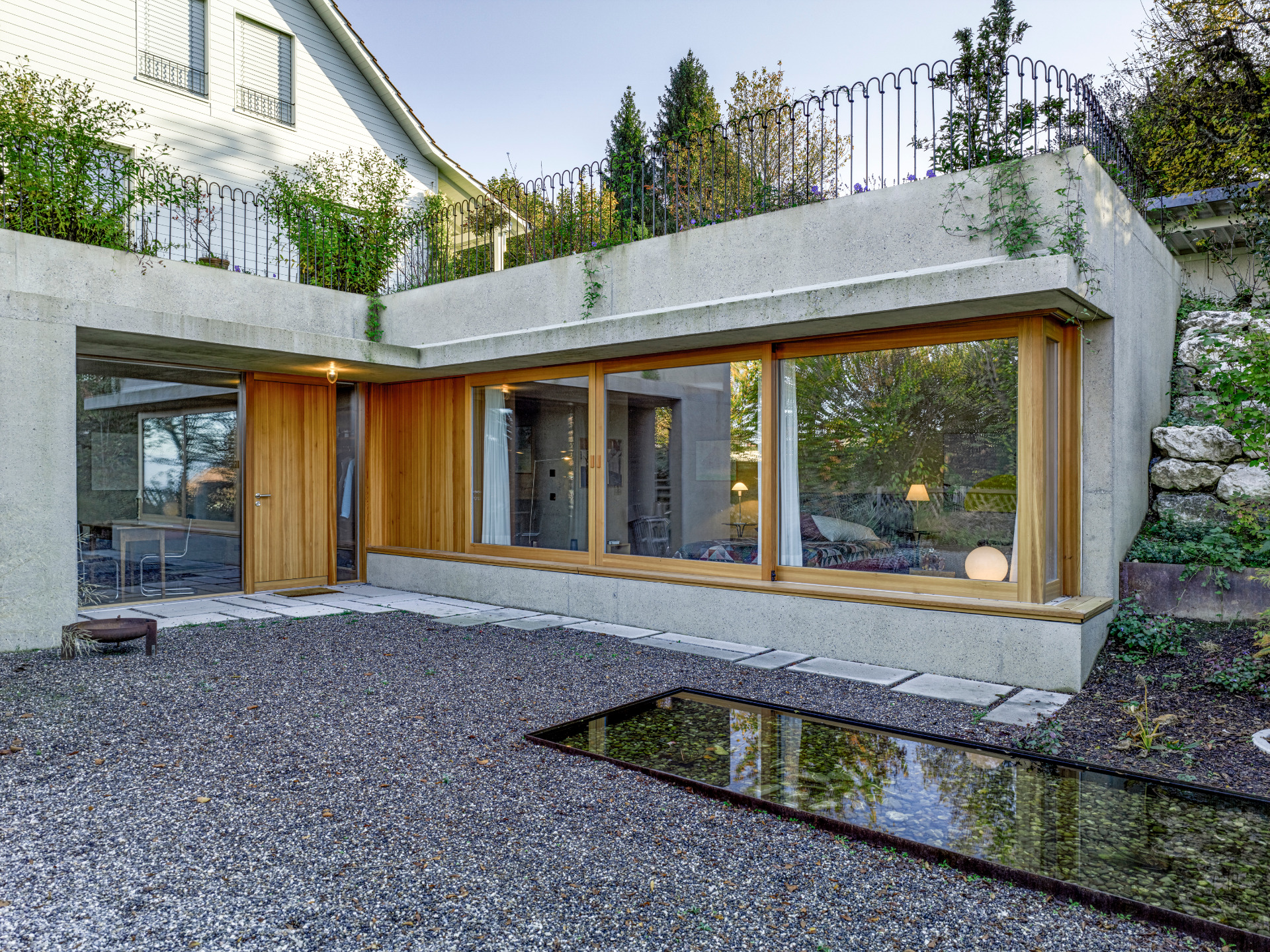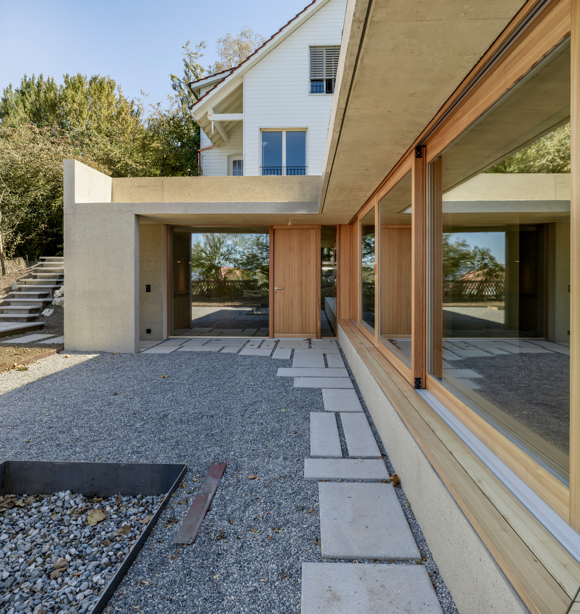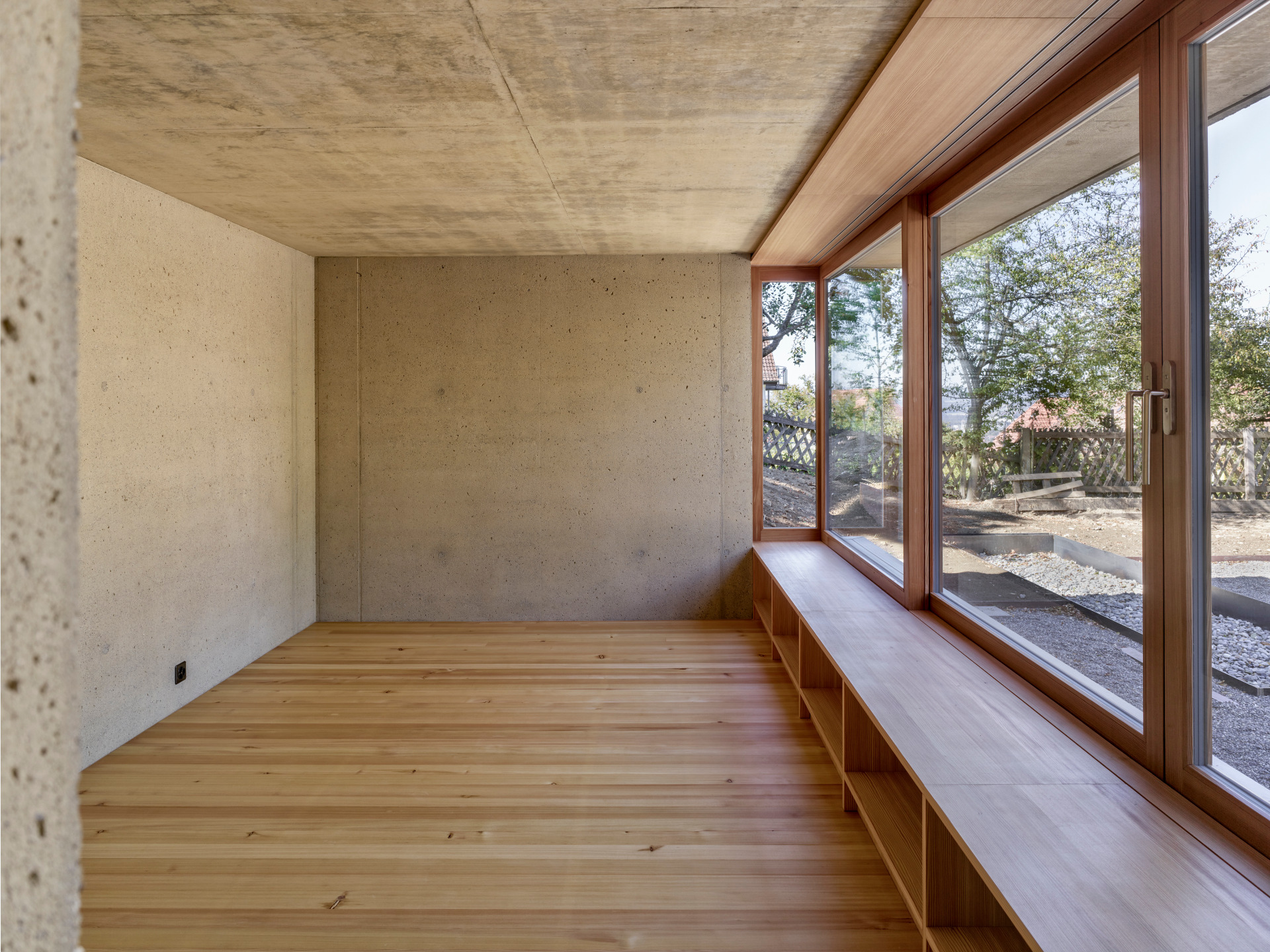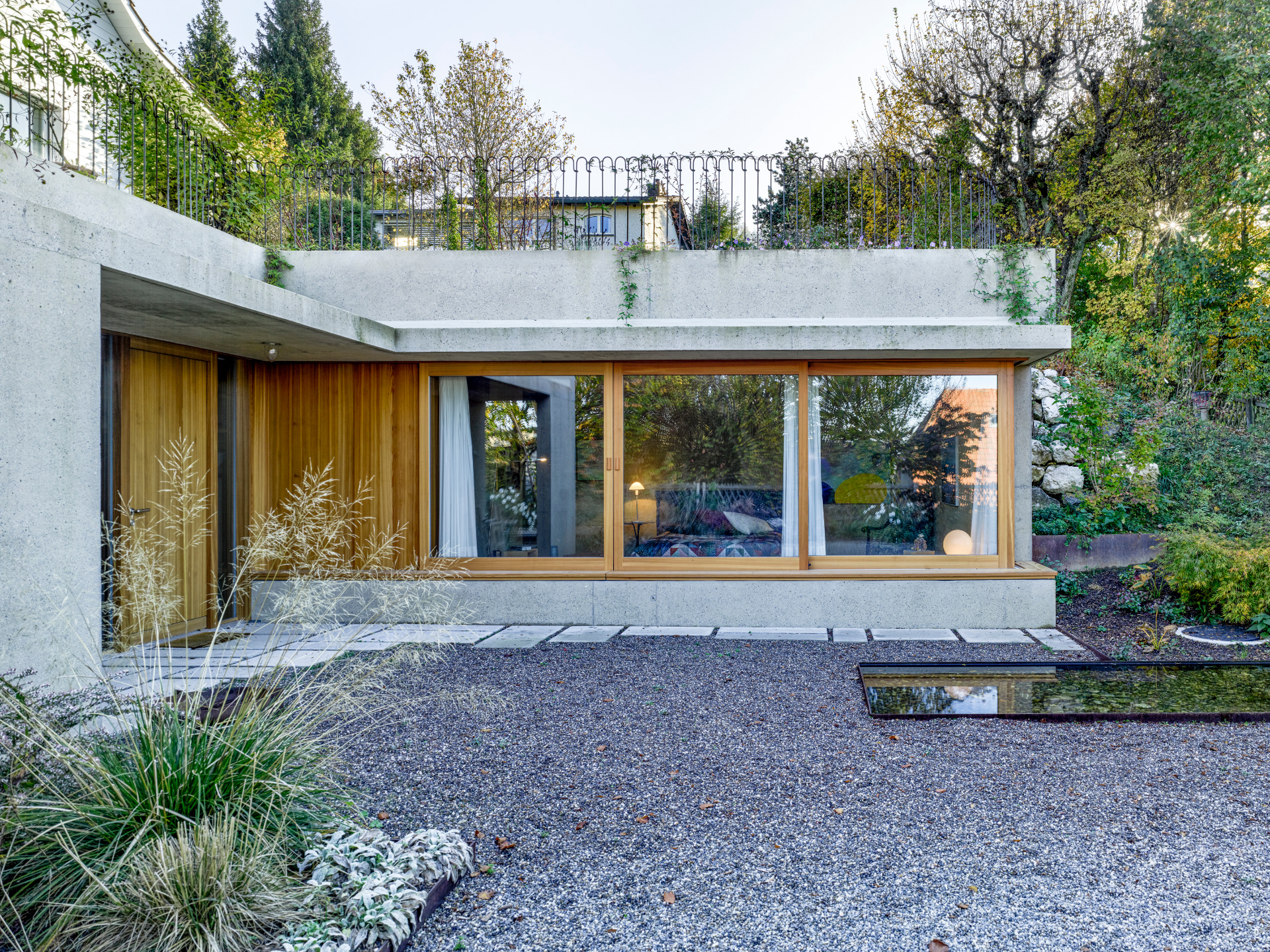 Der neue Anbau ergänzt das bestehende Einfamilienhaus zum Mehrgenerationenhaus. Der Tagesbereich mit grossem Vordach sucht die direkte räumliche Verbindung mit dem Garten und bietet eine schöne Aussicht zum Jura im Westen. Beim Schlafbereich hingegen schiebt sich das lange Holzregal zwischen Raum und Garten und wird hier zum Fenster mit bespielbarer Tiefe. Dieses Element dient hier ebenso als Ablage wie als Bank, für drinnen wie auch für draussen und schafft die nötige Privatsphäre im Schlafbereich.
