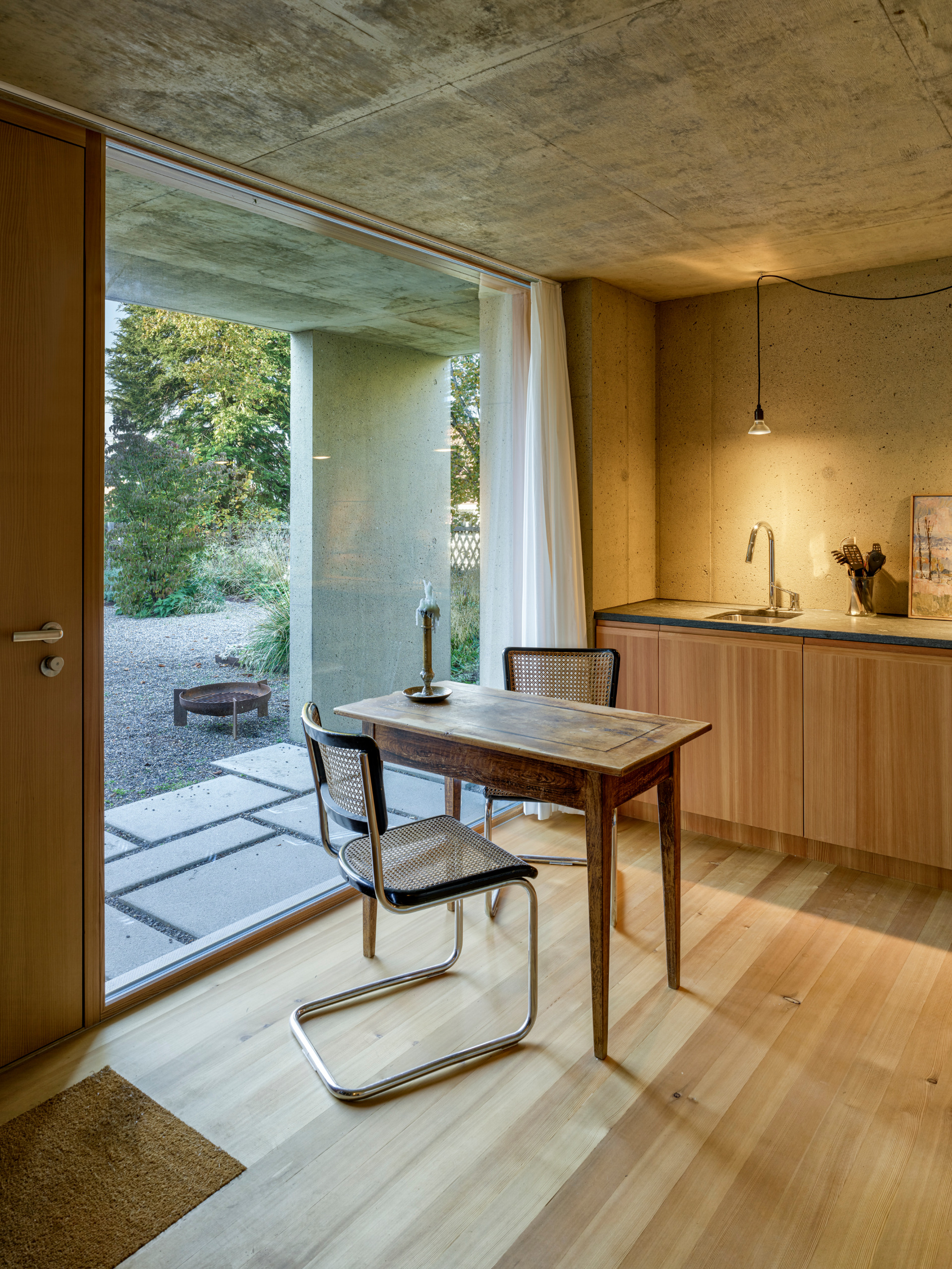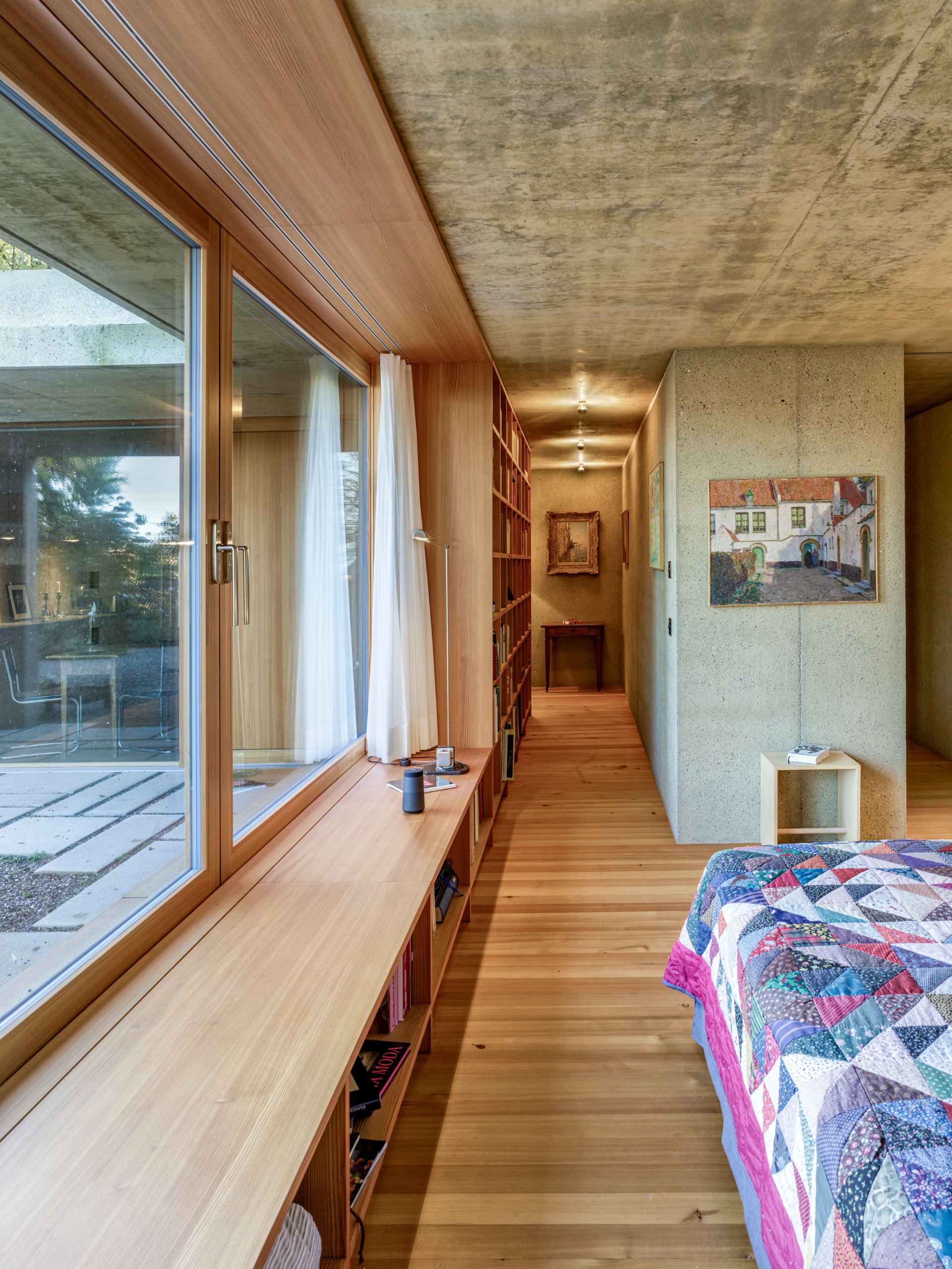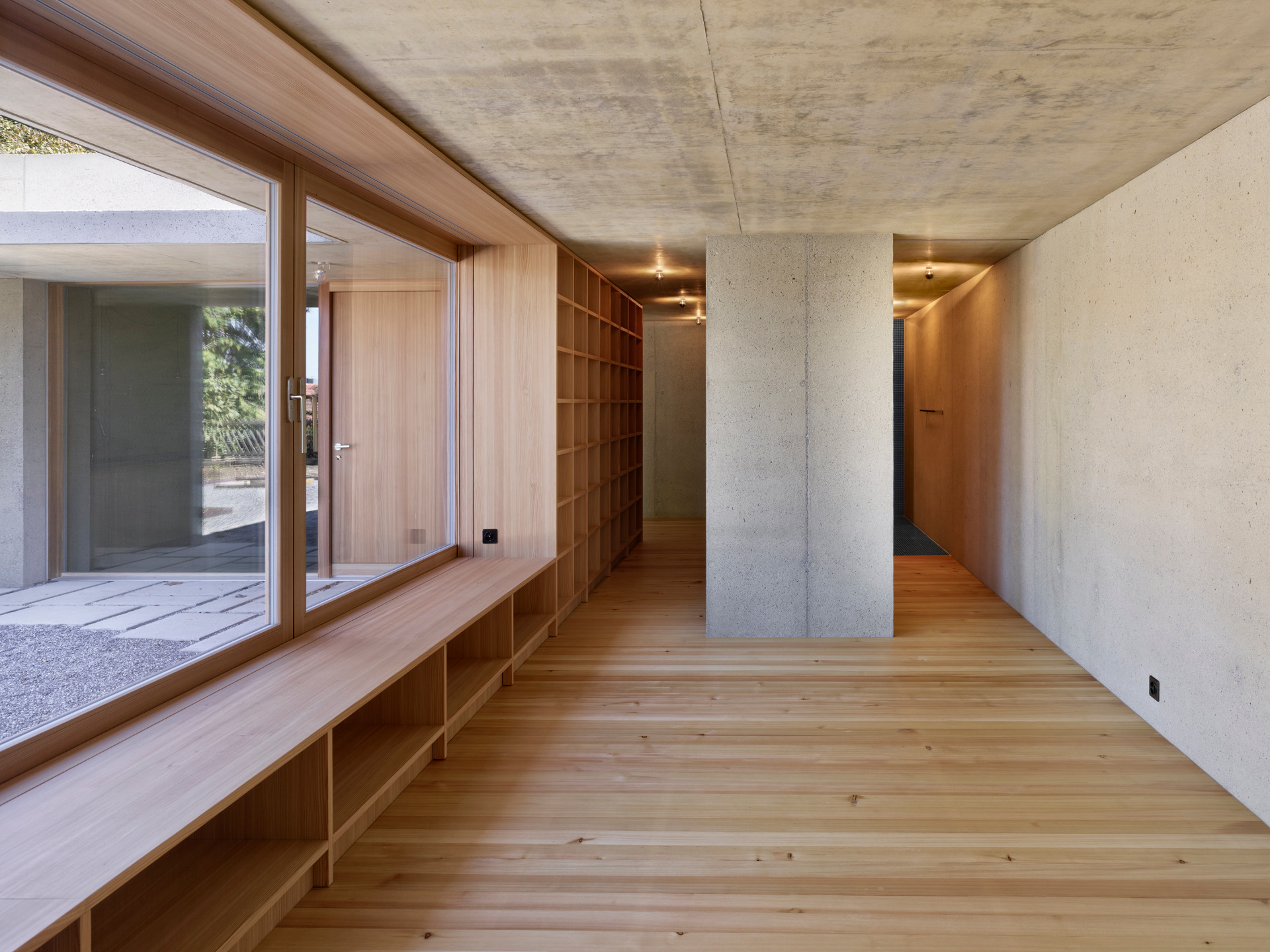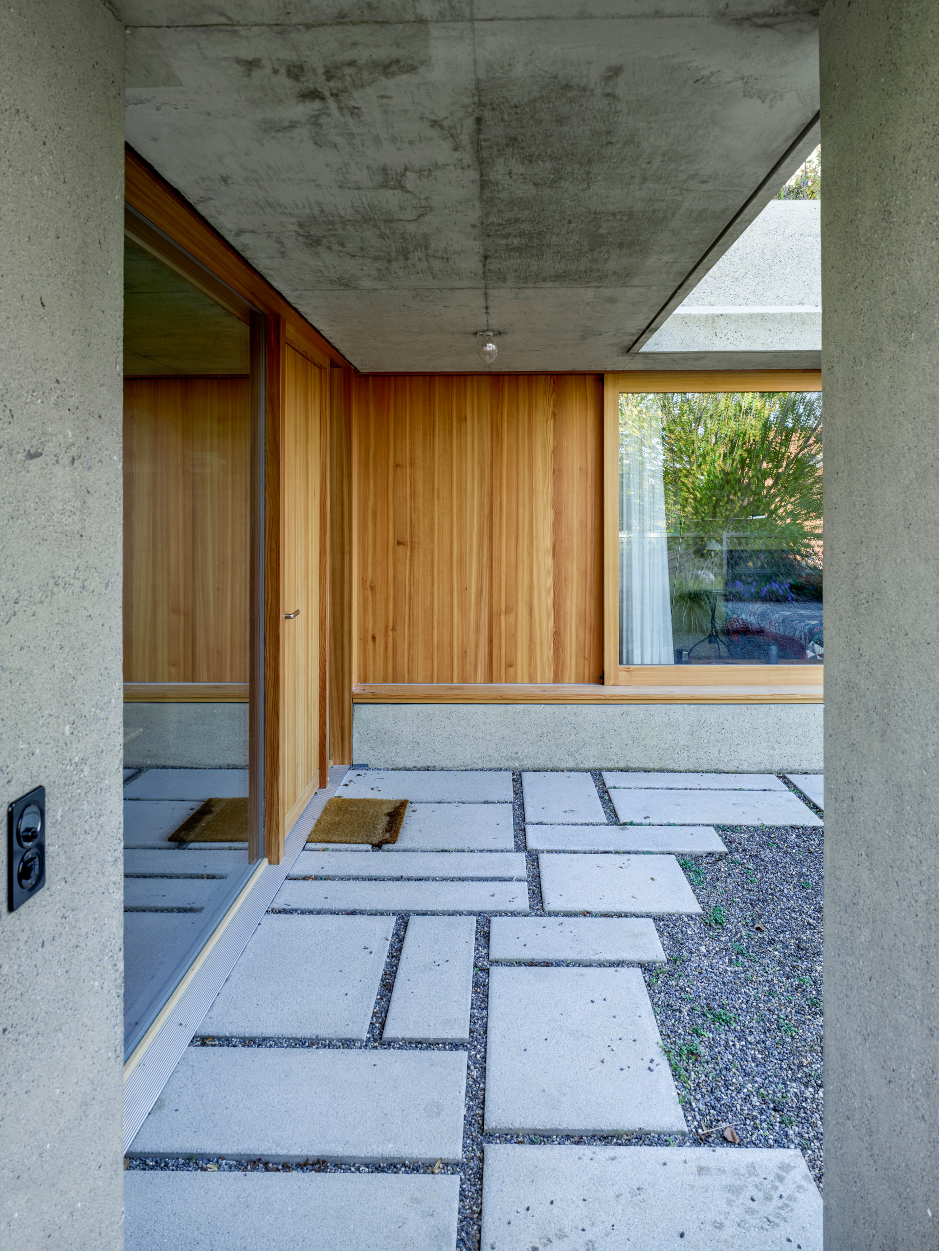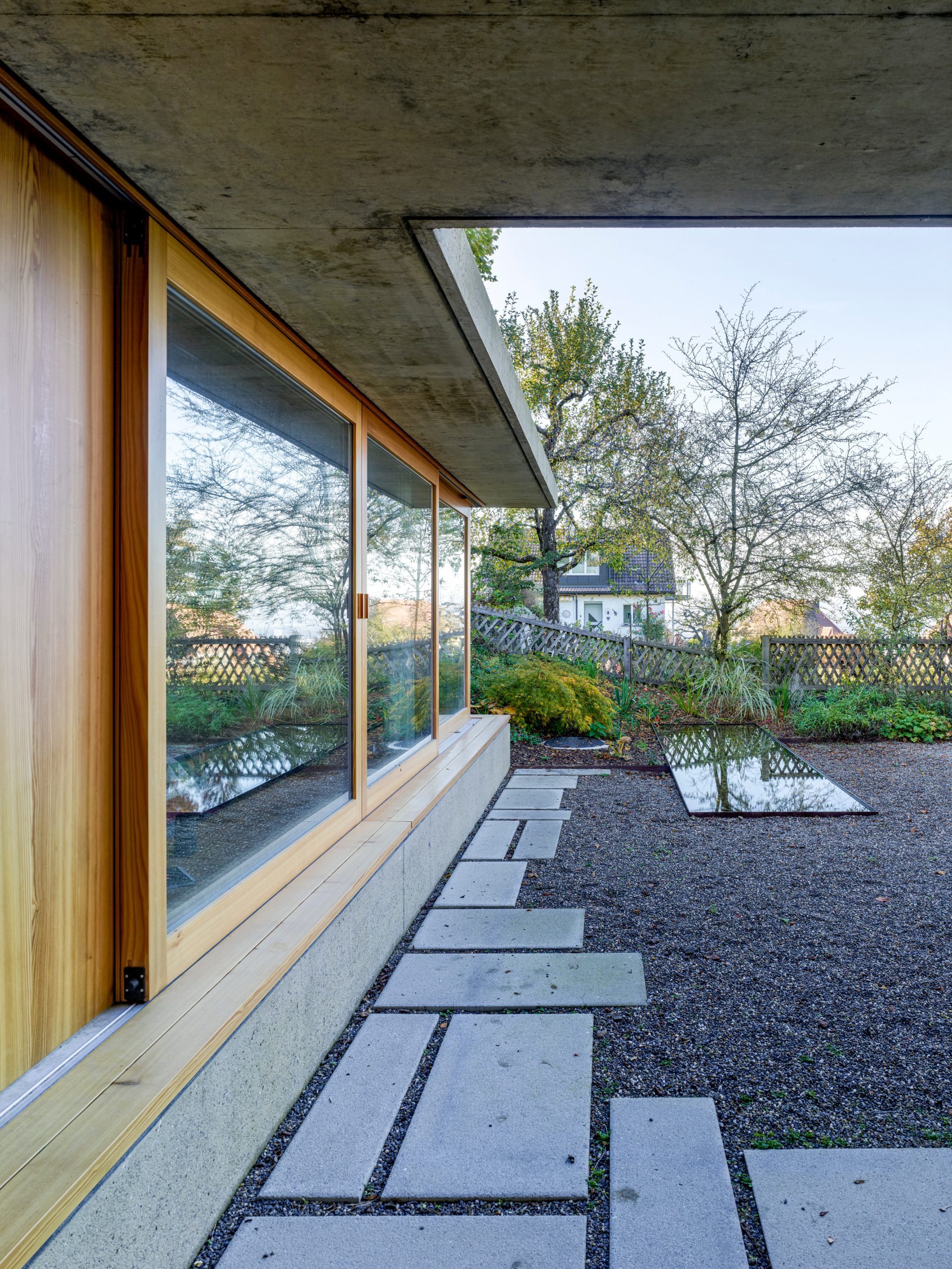 Der neue Anbau ergänzt das bestehende Einfamilienhaus zum Mehrgenerationenhaus. Der Tagesbereich mit grossem Vordach sucht die direkte räumliche Verbindung mit dem Garten und bietet eine schöne Aussicht zum Jura im Westen. Beim Schlafbereich hingegen schiebt sich das lange Holzregal zwischen Raum und Garten und wird hier zum Fenster mit bespielbarer Tiefe. Dieses Element dient hier ebenso als Ablage wie als Bank, für drinnen wie auch für draussen und schafft die nötige Privatsphäre im Schlafbereich.