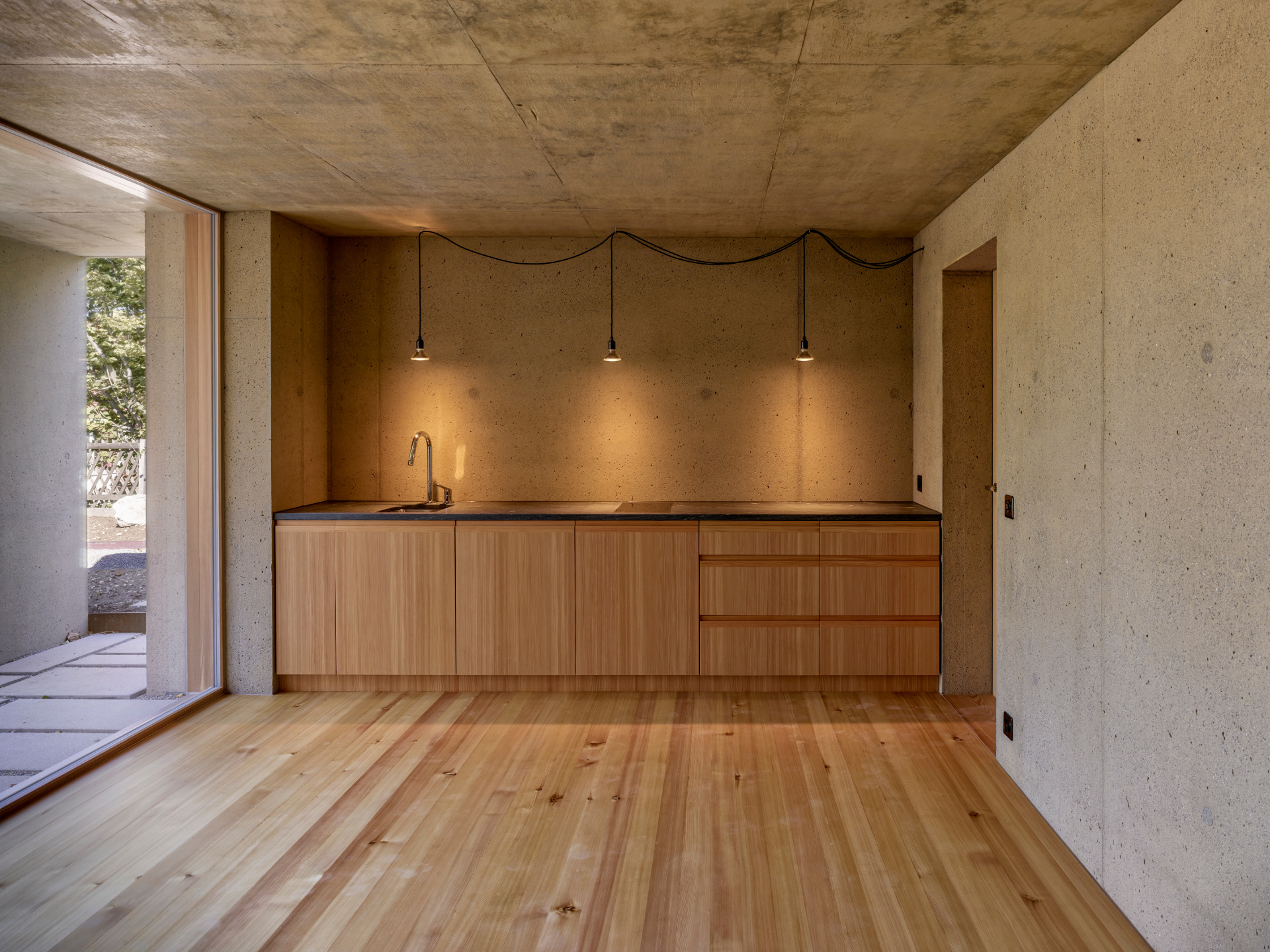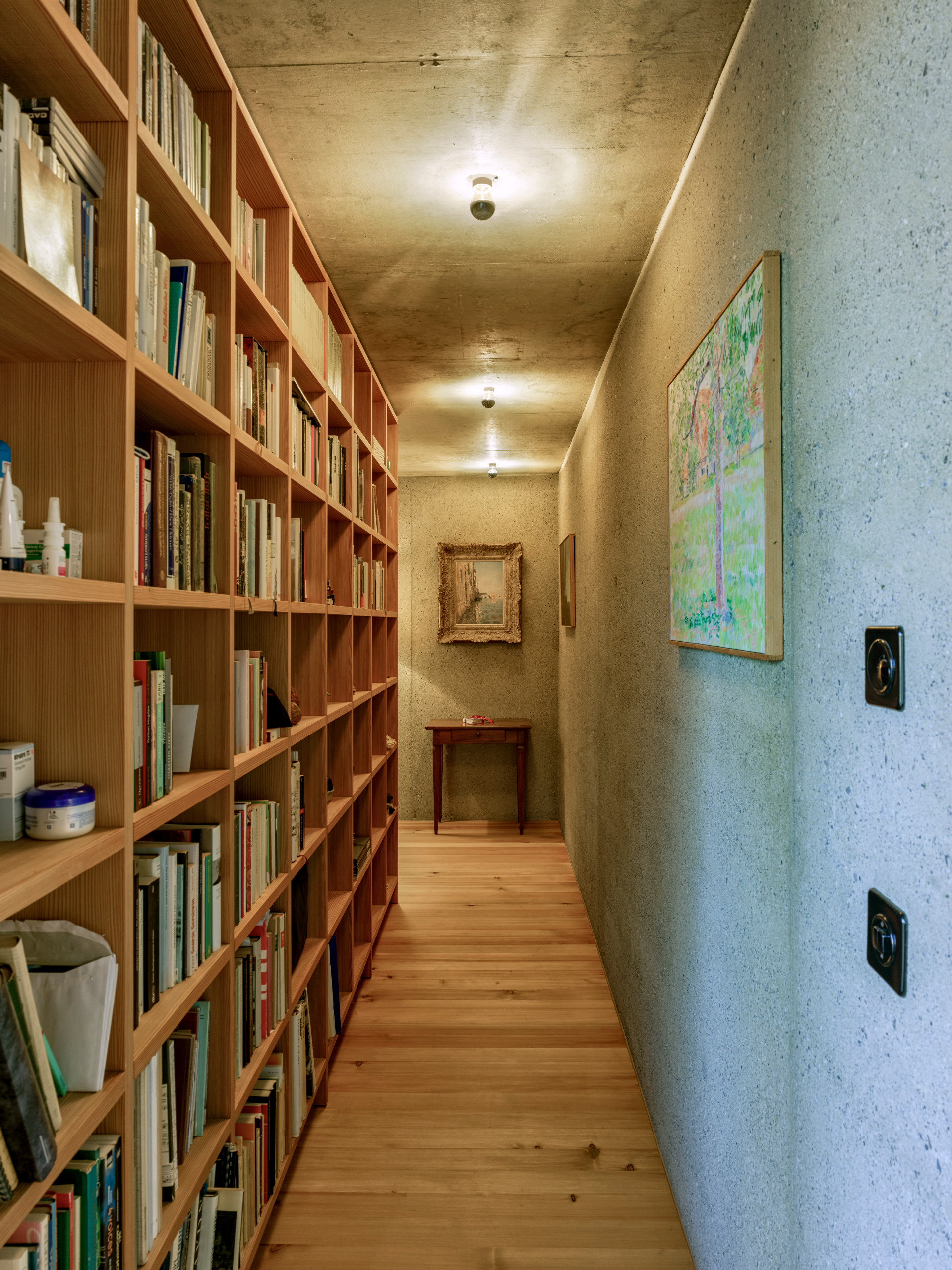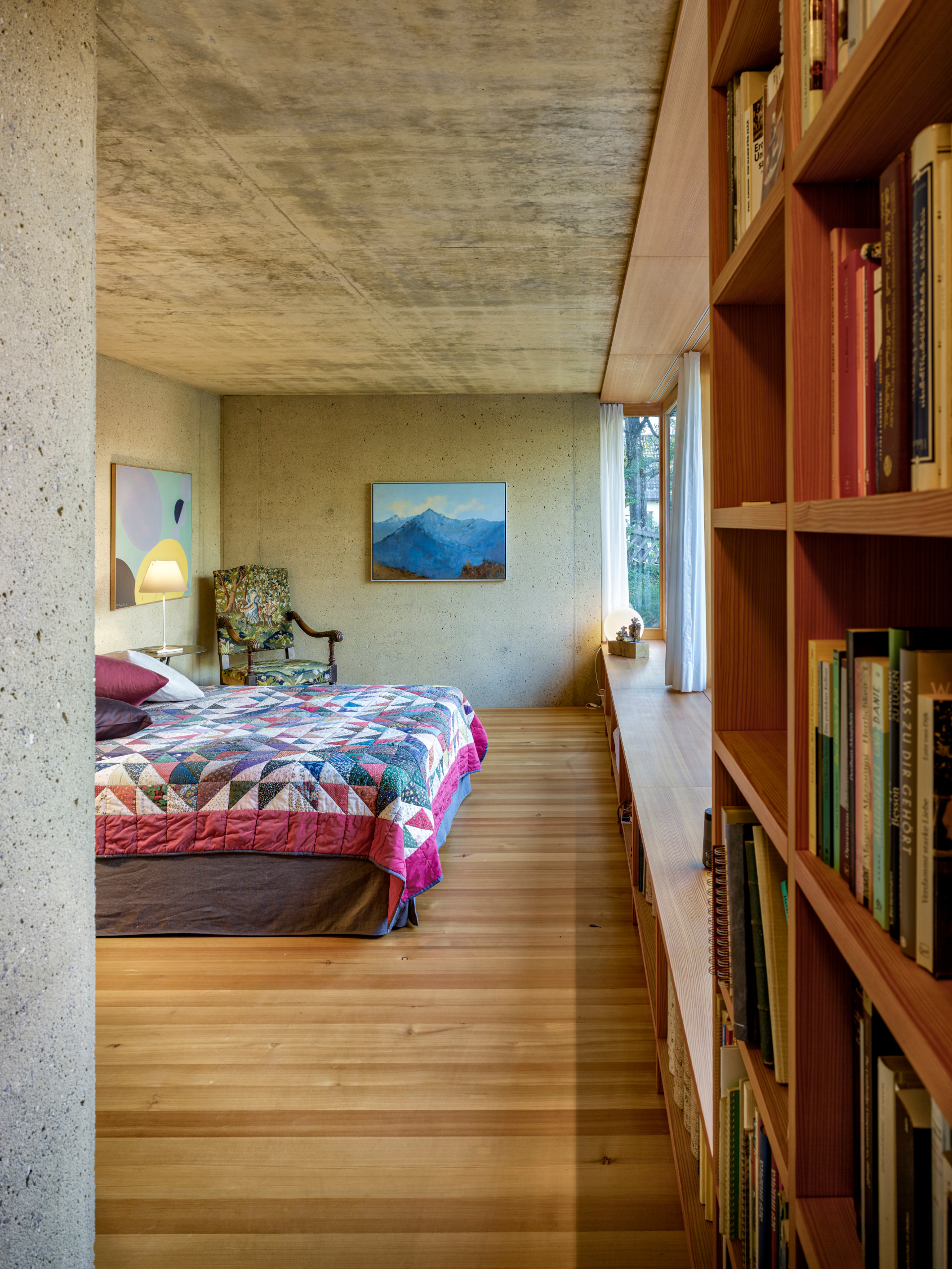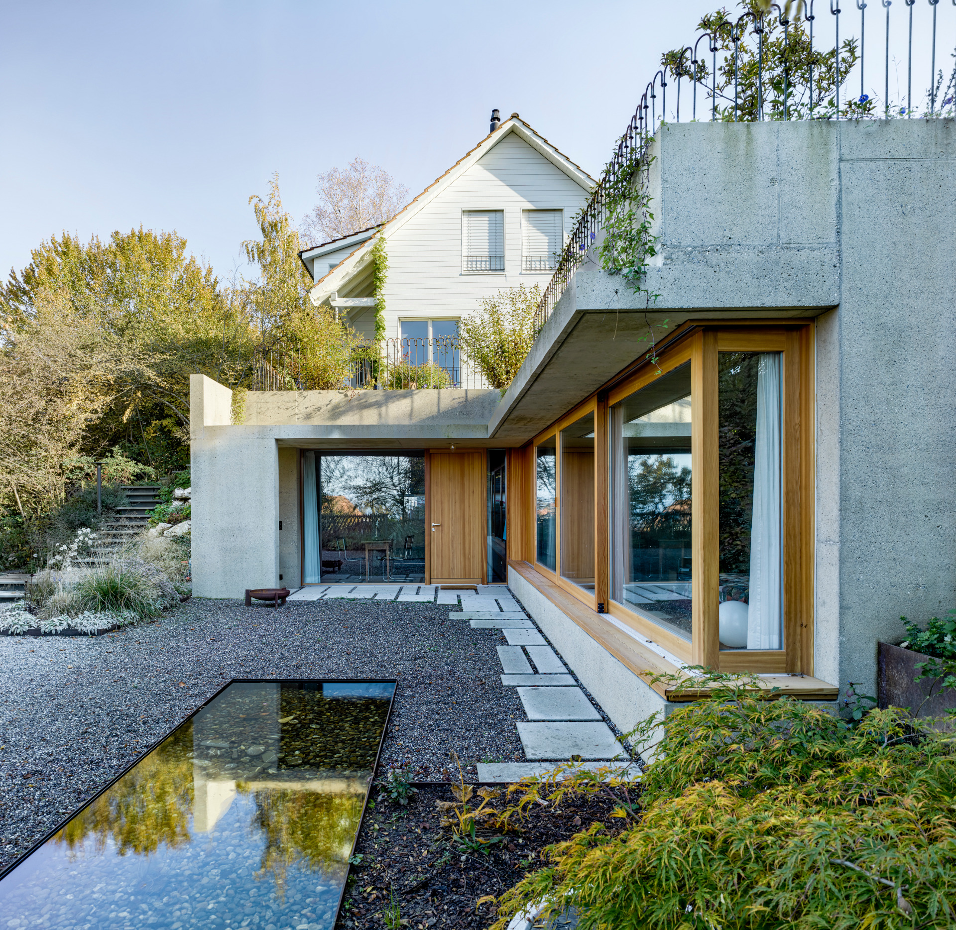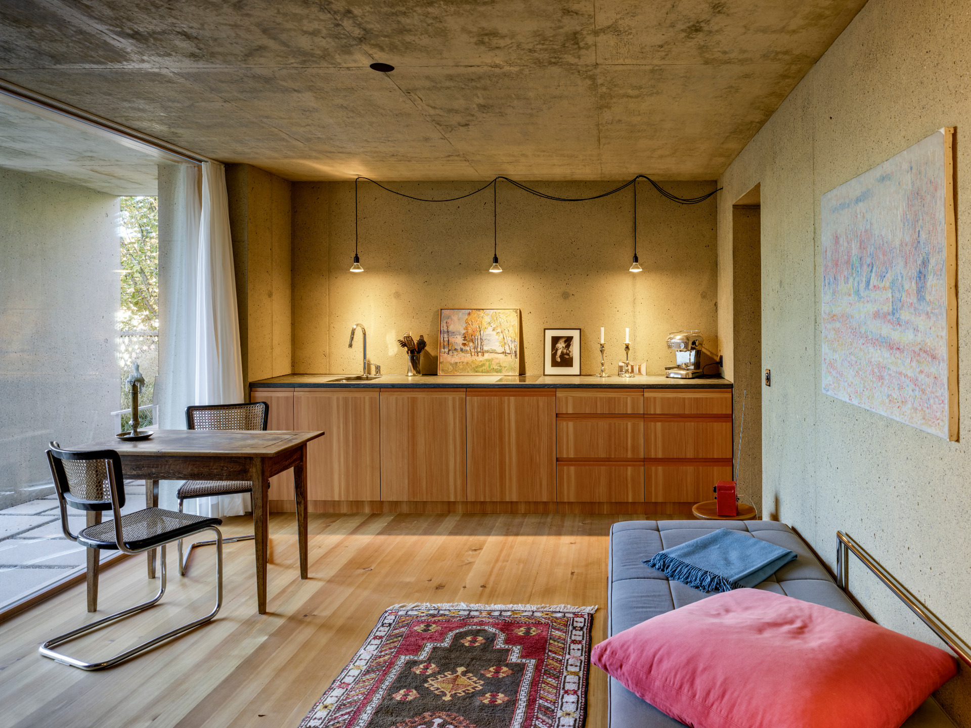 Der neue Anbau ergänzt das bestehende Einfamilienhaus zum Mehrgenerationenhaus. Der Tagesbereich mit grossem Vordach sucht die direkte räumliche Verbindung mit dem Garten und bietet eine schöne Aussicht zum Jura im Westen. Beim Schlafbereich hingegen schiebt sich das lange Holzregal zwischen Raum und Garten und wird hier zum Fenster mit bespielbarer Tiefe. Dieses Element dient hier ebenso als Ablage wie als Bank, für drinnen wie auch für draussen und schafft die nötige Privatsphäre im Schlafbereich.