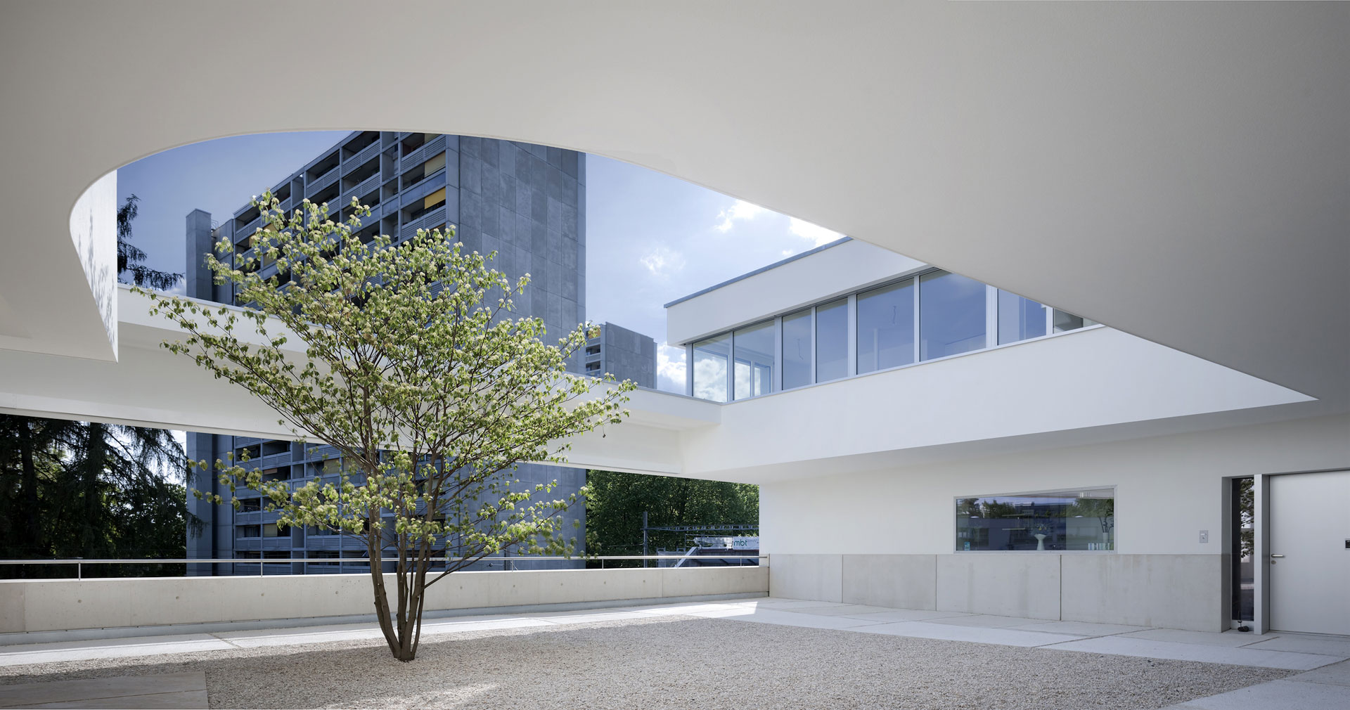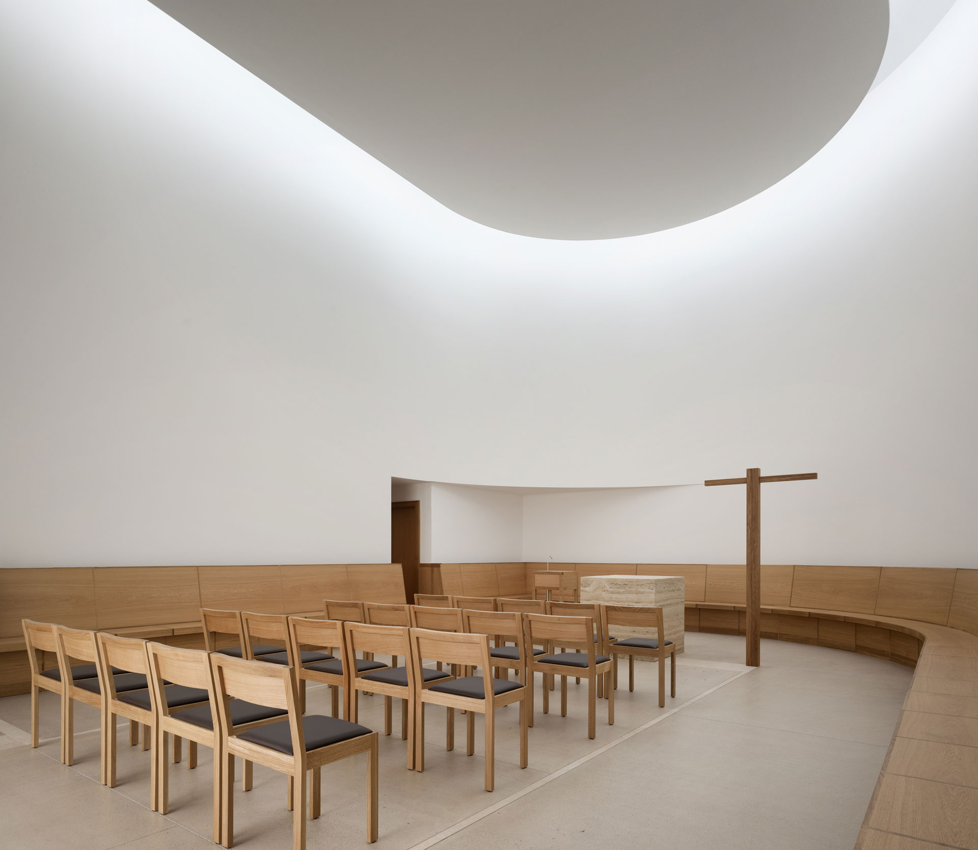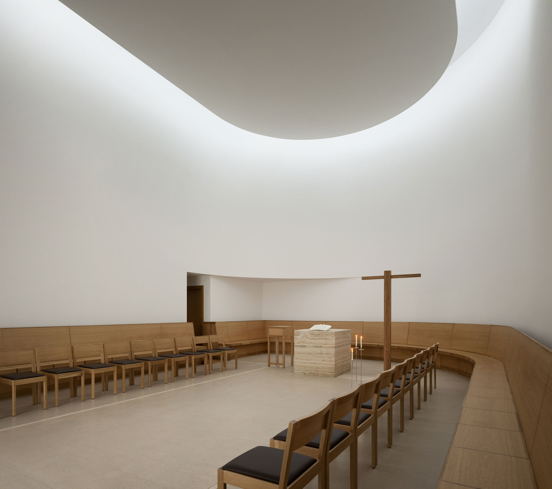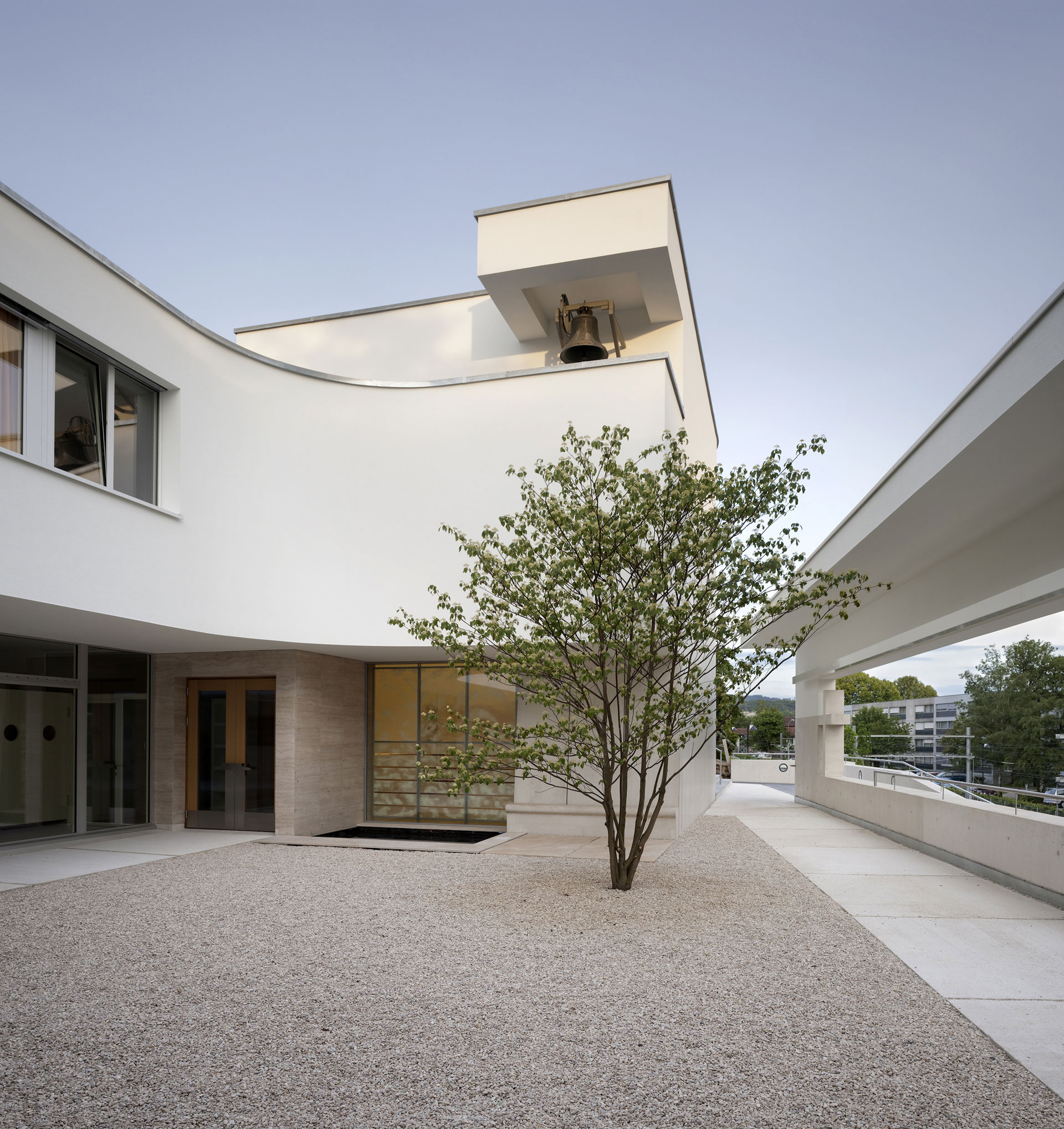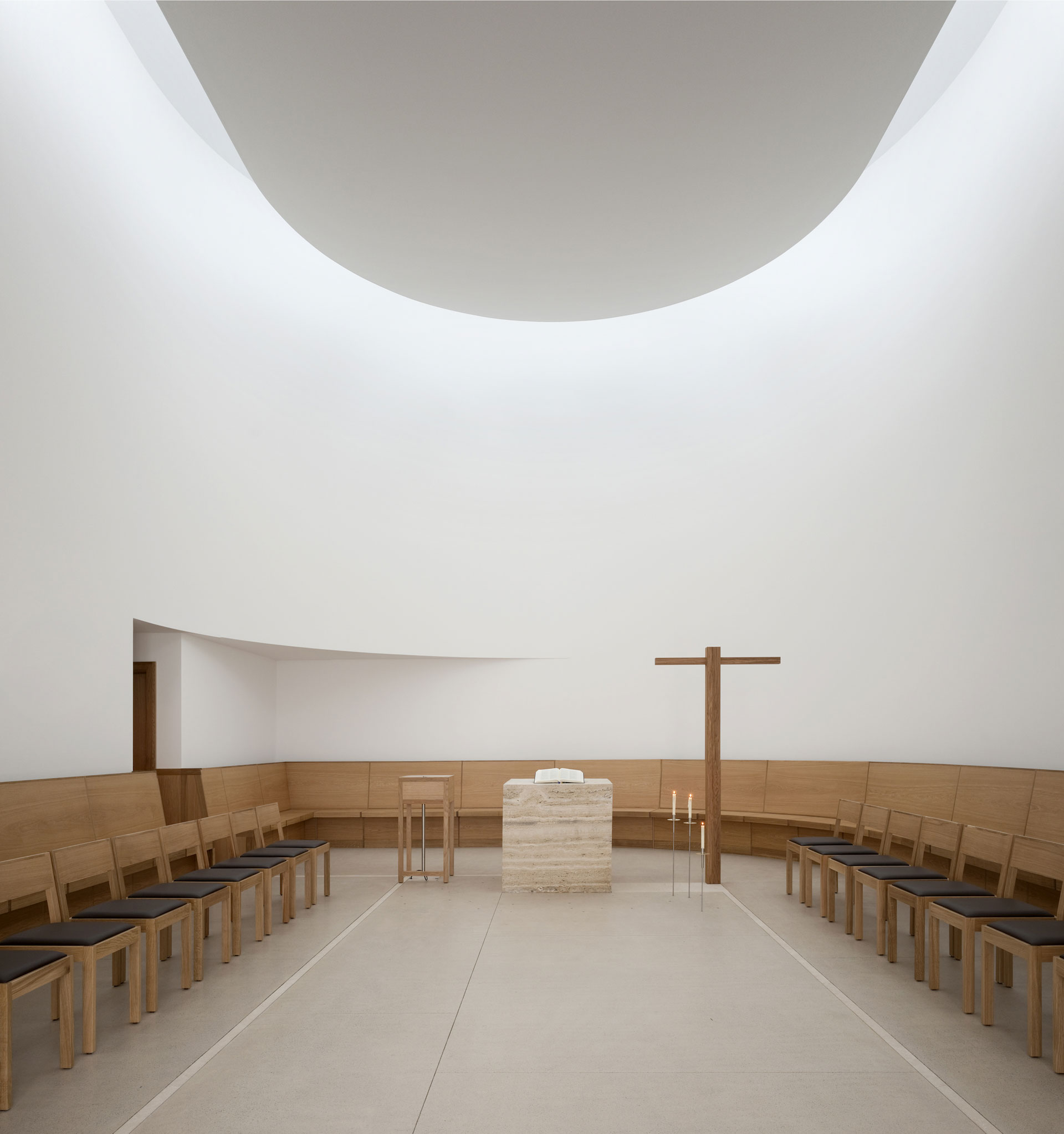 Der Hof ist das verbindende Element zwischen den Wohnungen und den öffentlichen Räumen. Die Kapelle befindet sich in einem ausbalancierten Gleichgewicht zwischen Längs- und Zentralbau. In ihrer räumlichen Mehrdeutigkeit kann sie mit der freien Bestuhlung auf die verschiedensten Liturgieformen eingehen. Das sanfte, vertikale Licht fliesst geheimnisvoll über die Rundung der Ost- und Längswände und scheint hier die Gravitationsgesetze aufzuheben. Der stimmungsvolle Raum erhält so seinen mystischen, heiteren Charakter.