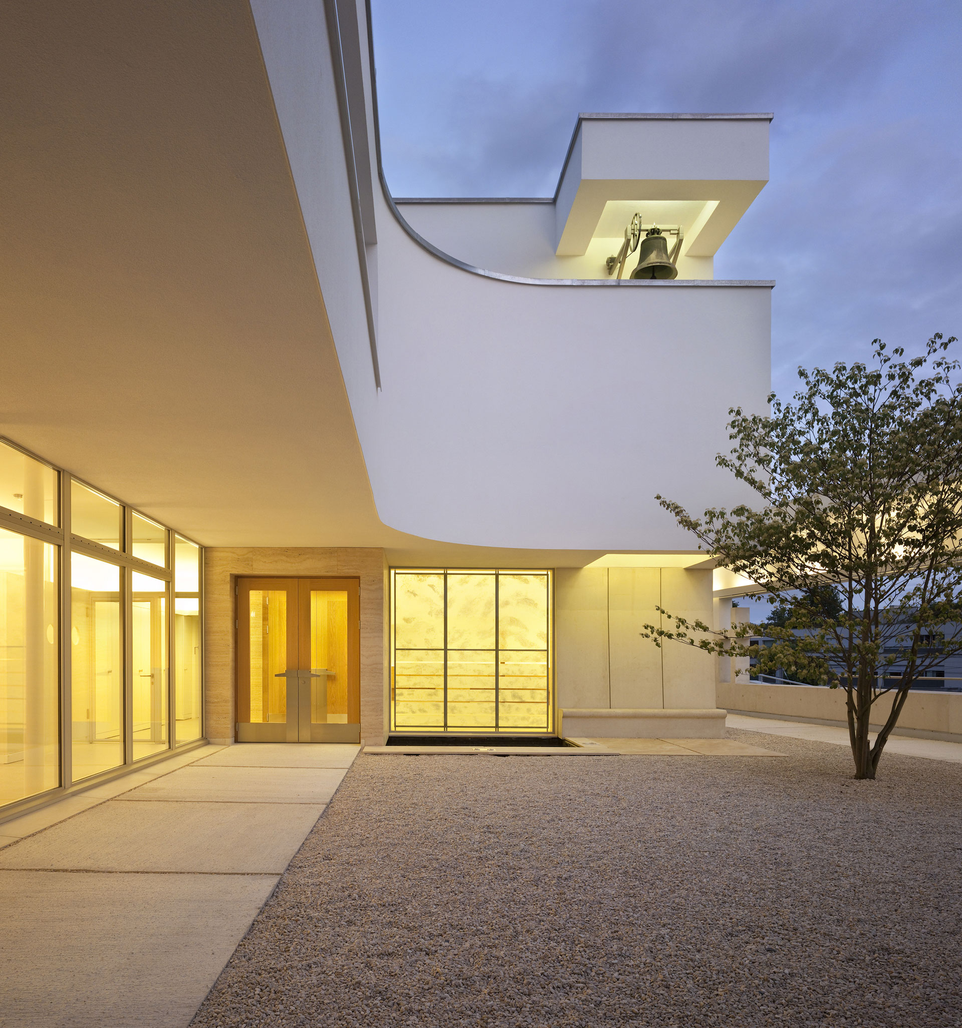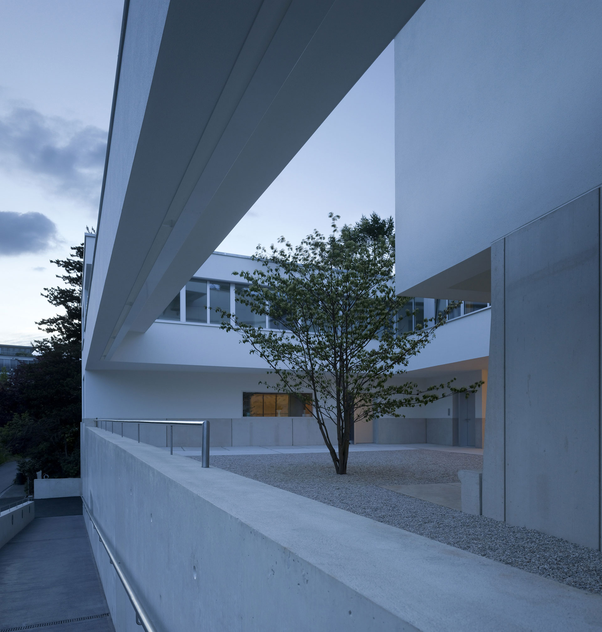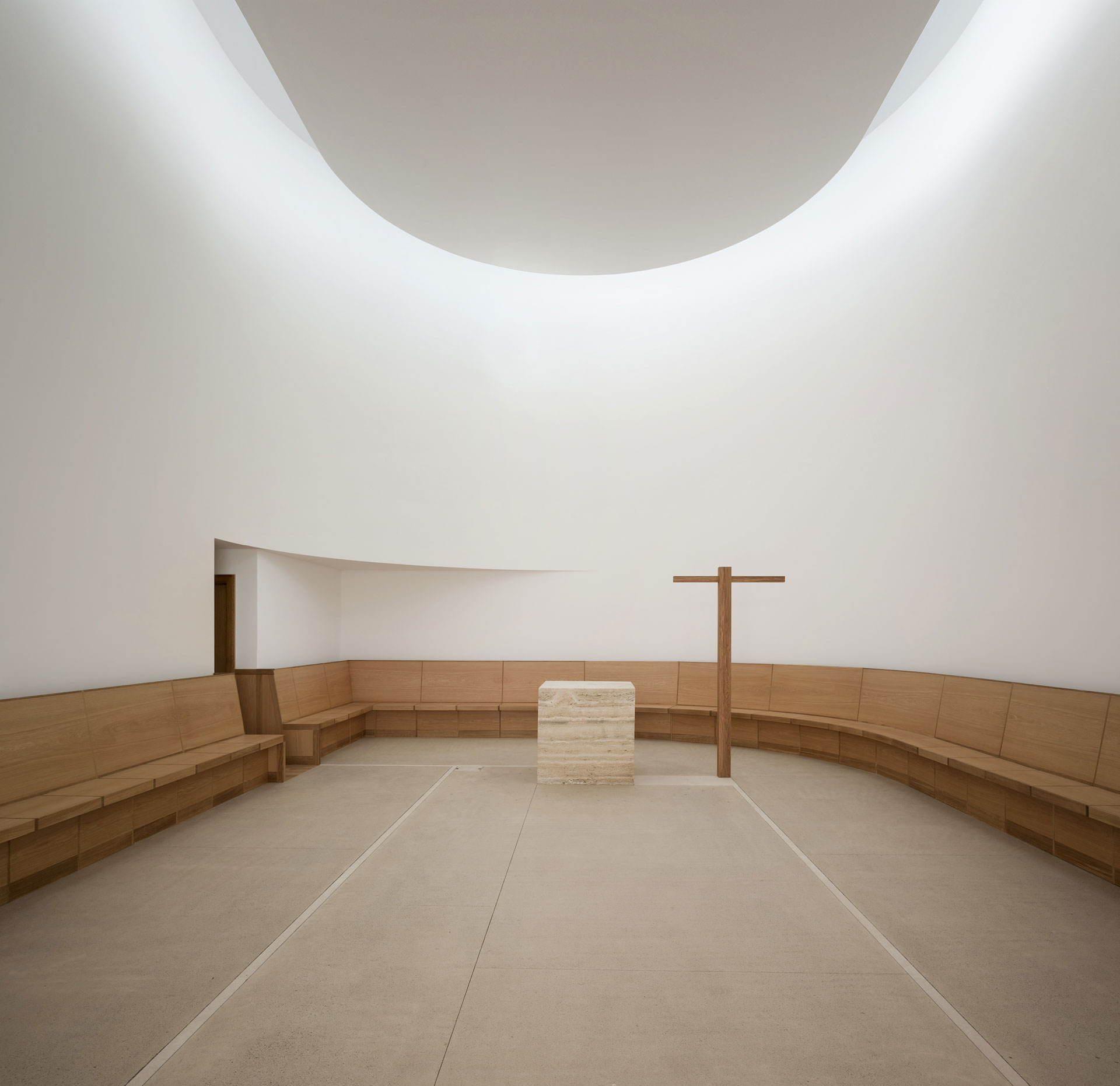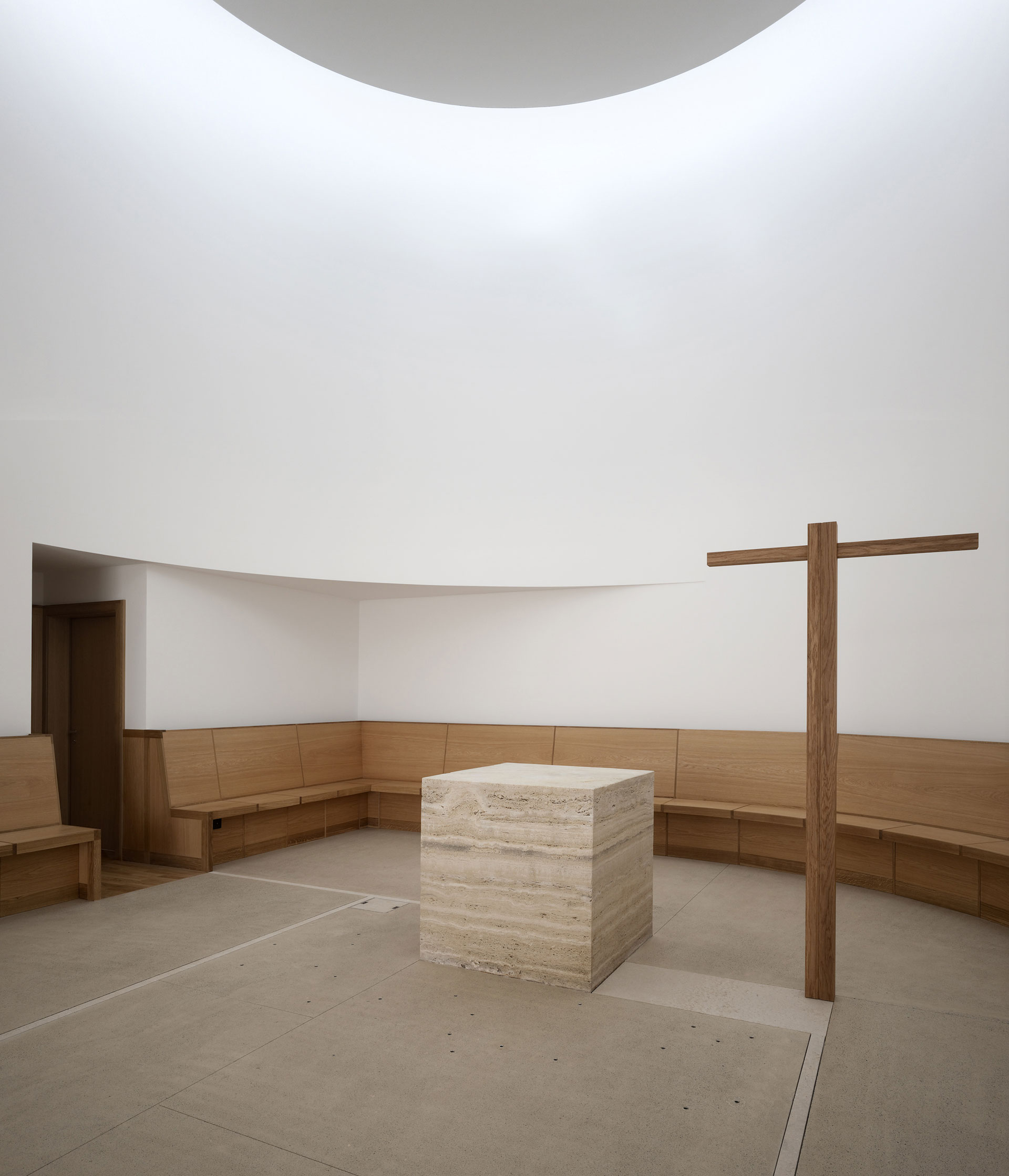 Der Hof ist das verbindende Element zwischen den Wohnungen und den öffentlichen Räumen. Die Kapelle befindet sich in einem ausbalancierten Gleichgewicht zwischen Längs- und Zentralbau. In ihrer räumlichen Mehrdeutigkeit kann sie mit der freien Bestuhlung auf die verschiedensten Liturgieformen eingehen. Das sanfte, vertikale Licht fliesst geheimnisvoll über die Rundung der Ost- und Längswände und scheint hier die Gravitationsgesetze aufzuheben. Der stimmungsvolle Raum erhält so seinen mystischen, heiteren Charakter.