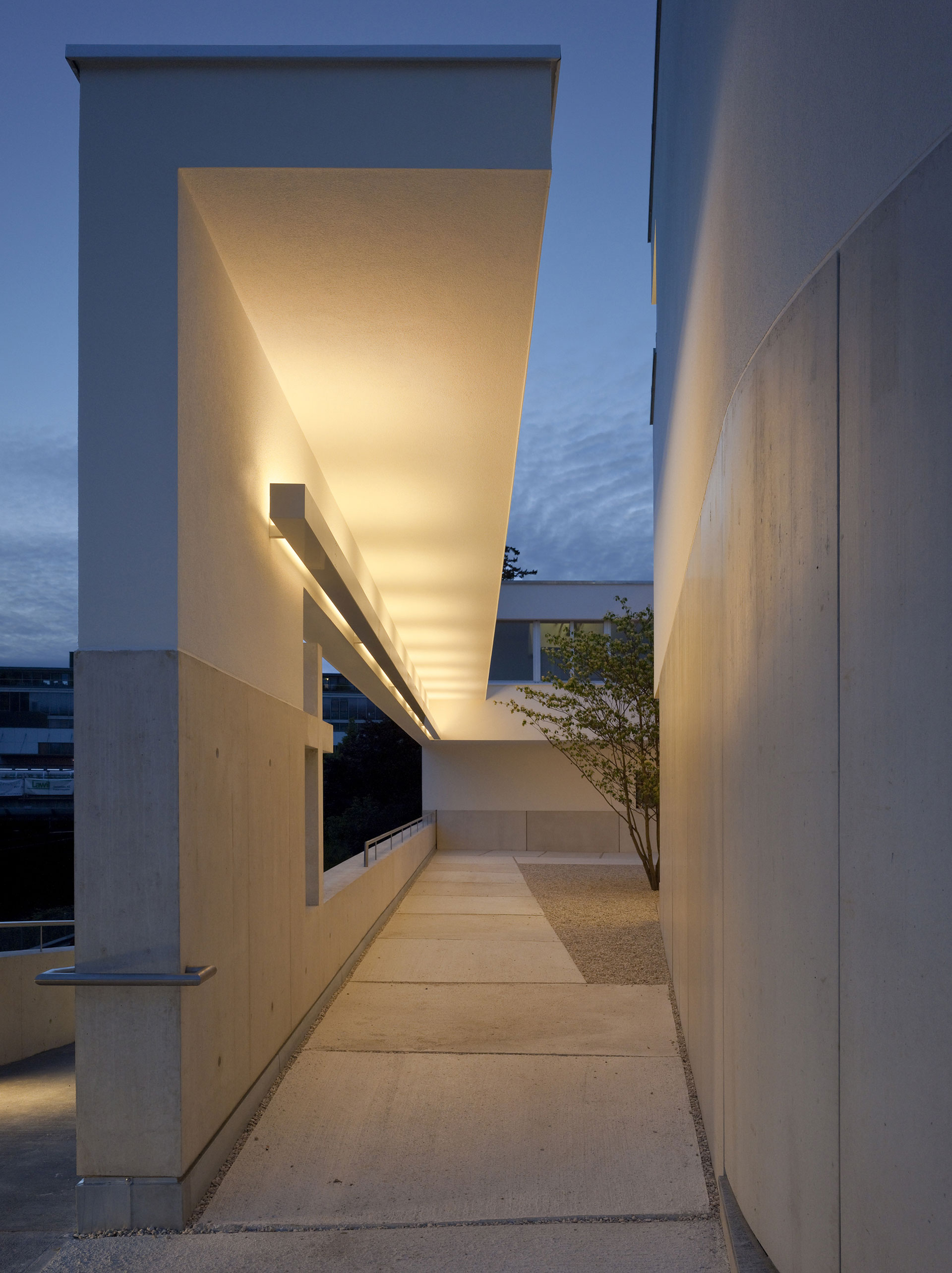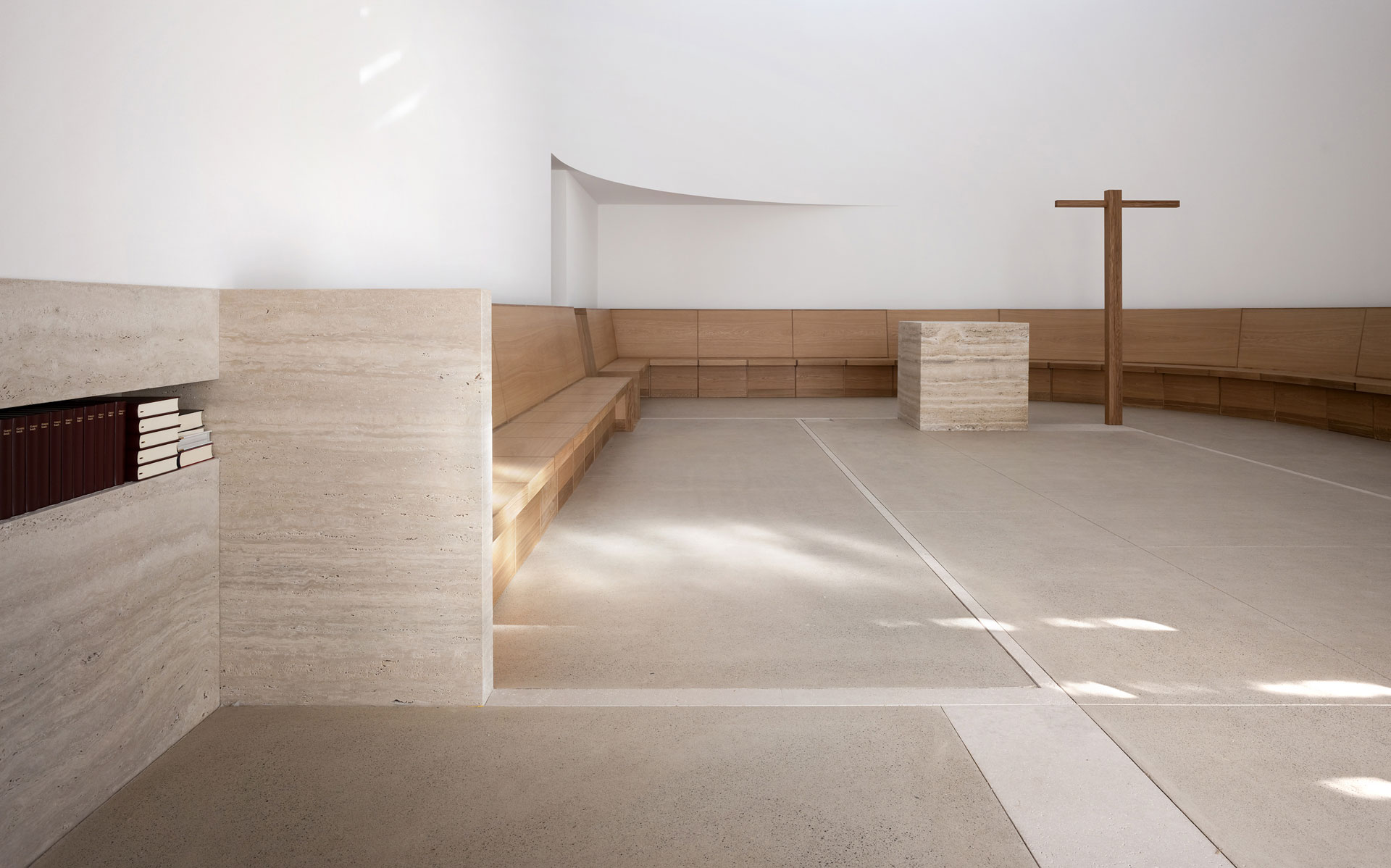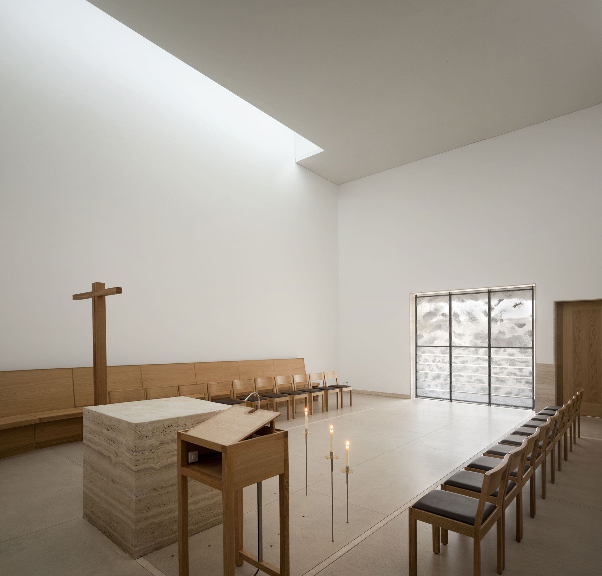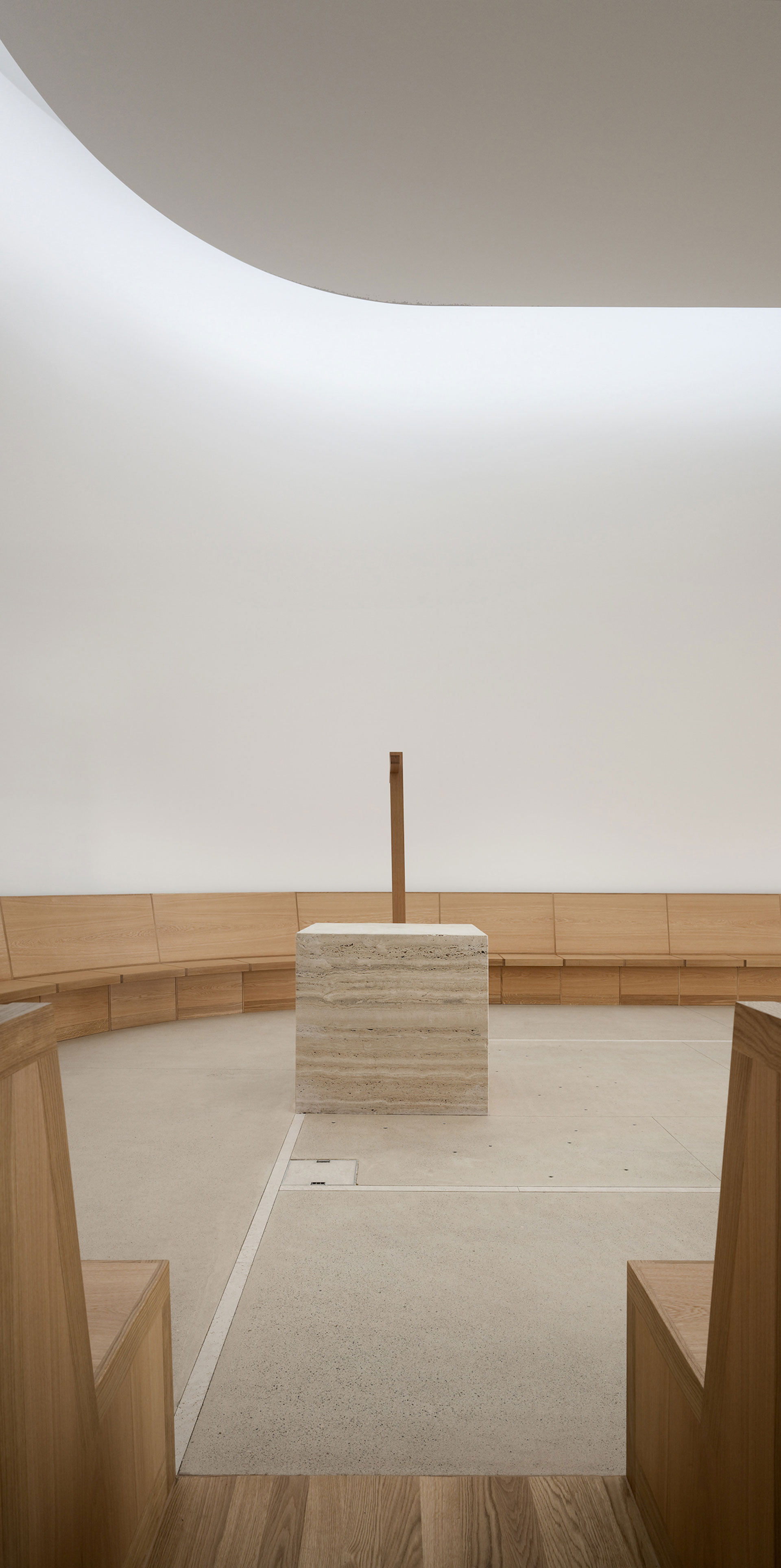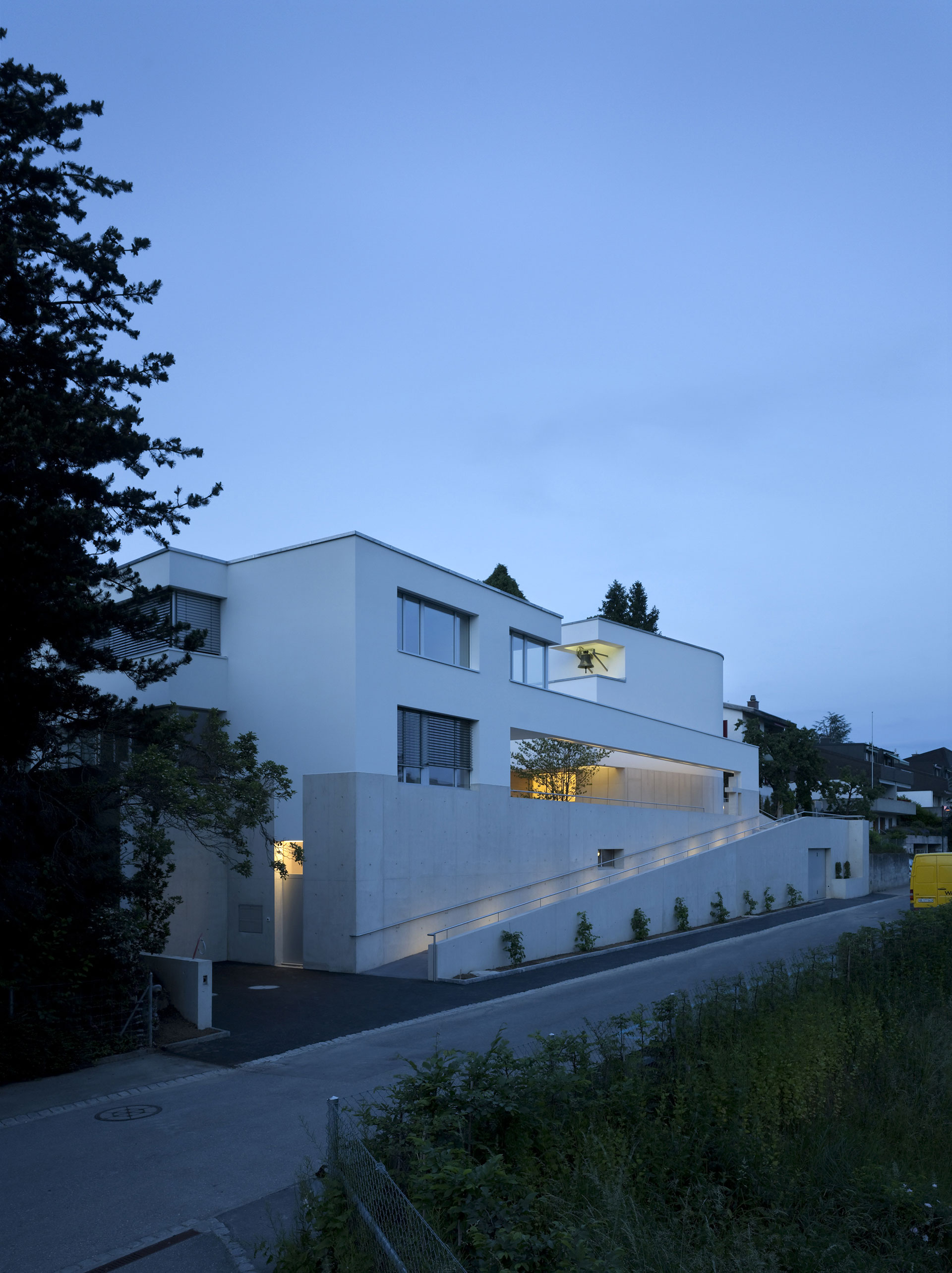Der Hof ist das verbindende Element zwischen den Wohnungen und den öffentlichen Räumen. Die Kapelle befindet sich in einem ausbalancierten Gleichgewicht zwischen Längs- und Zentralbau. In ihrer räumlichen Mehrdeutigkeit kann sie mit der freien Bestuhlung auf die verschiedensten Liturgieformen eingehen. Das sanfte, vertikale Licht fliesst geheimnisvoll über die Rundung der Ost- und Längswände und scheint hier die Gravitationsgesetze aufzuheben. Der stimmungsvolle Raum erhält so seinen mystischen, heiteren Charakter.