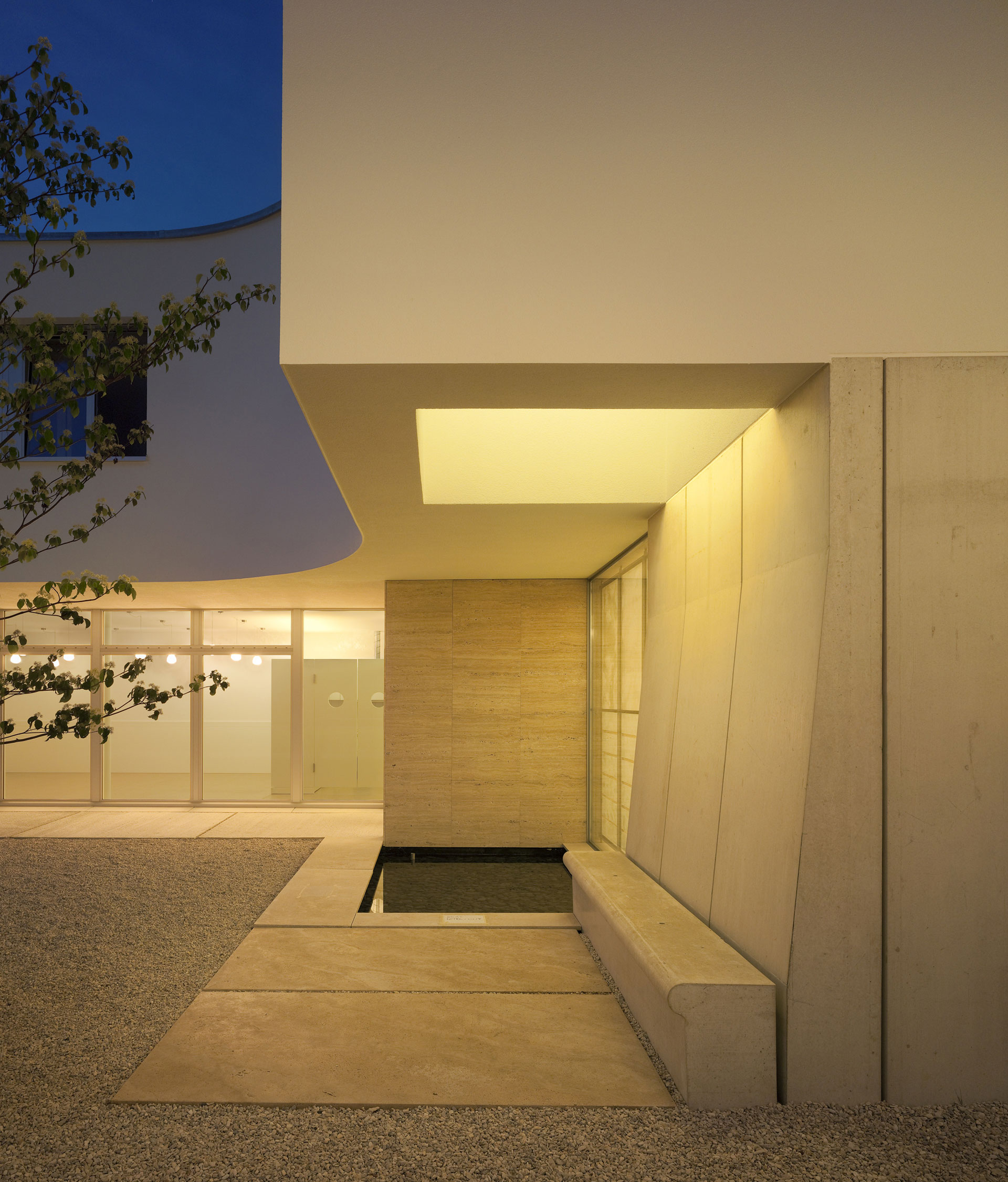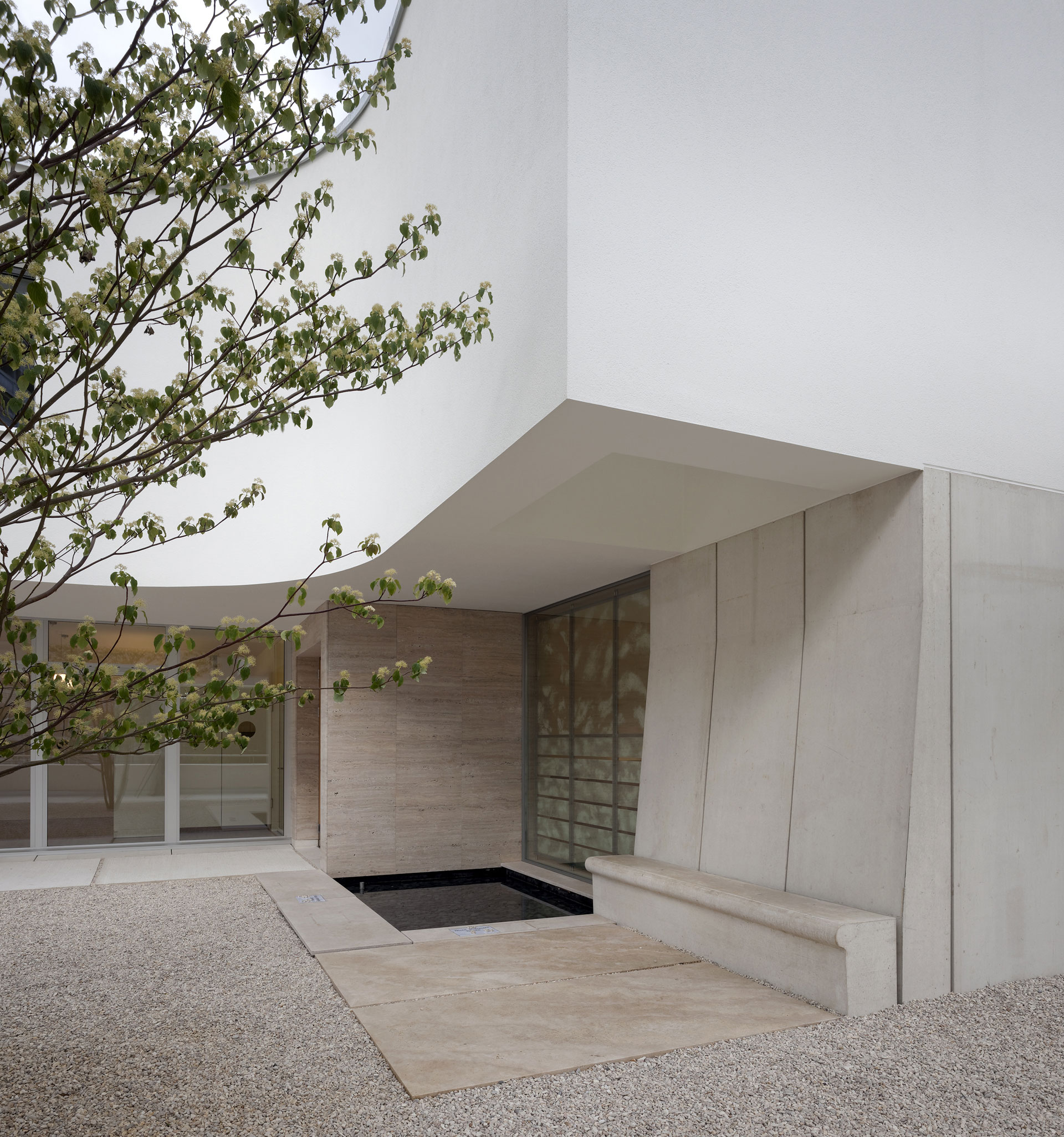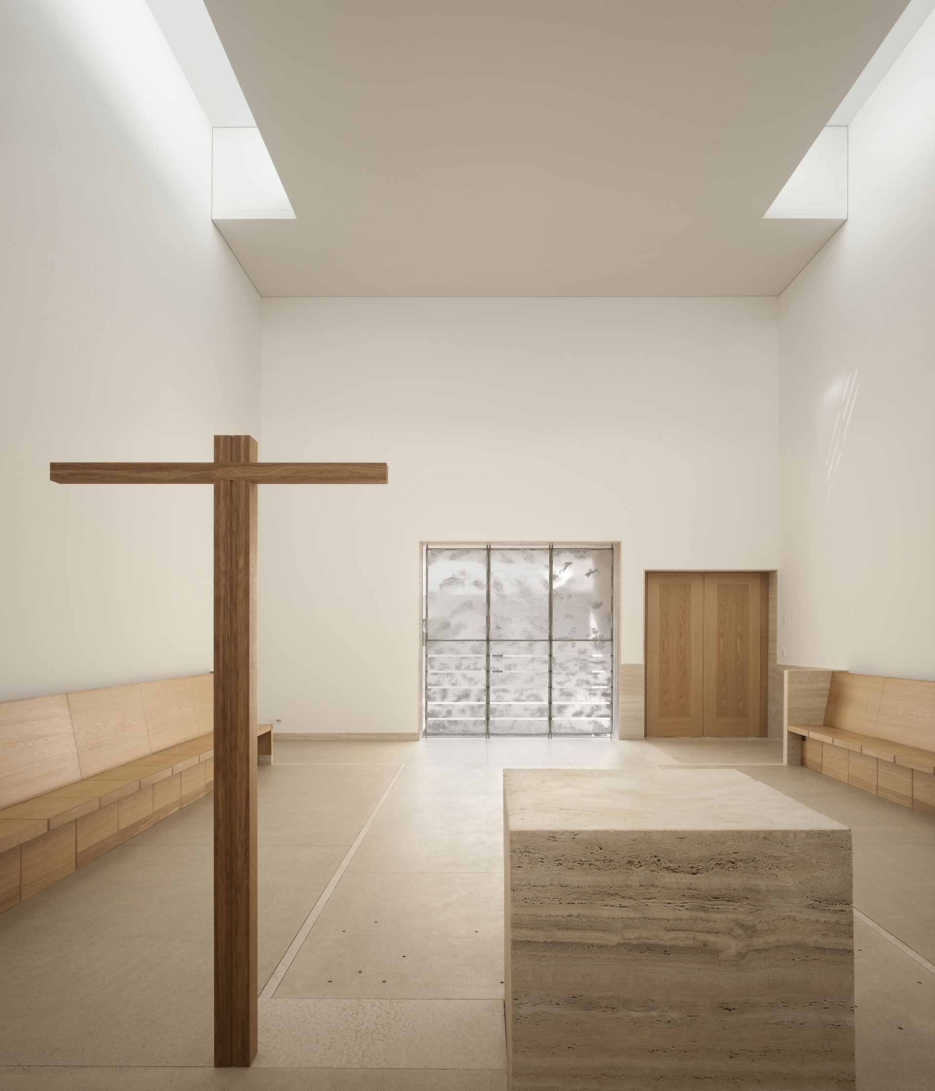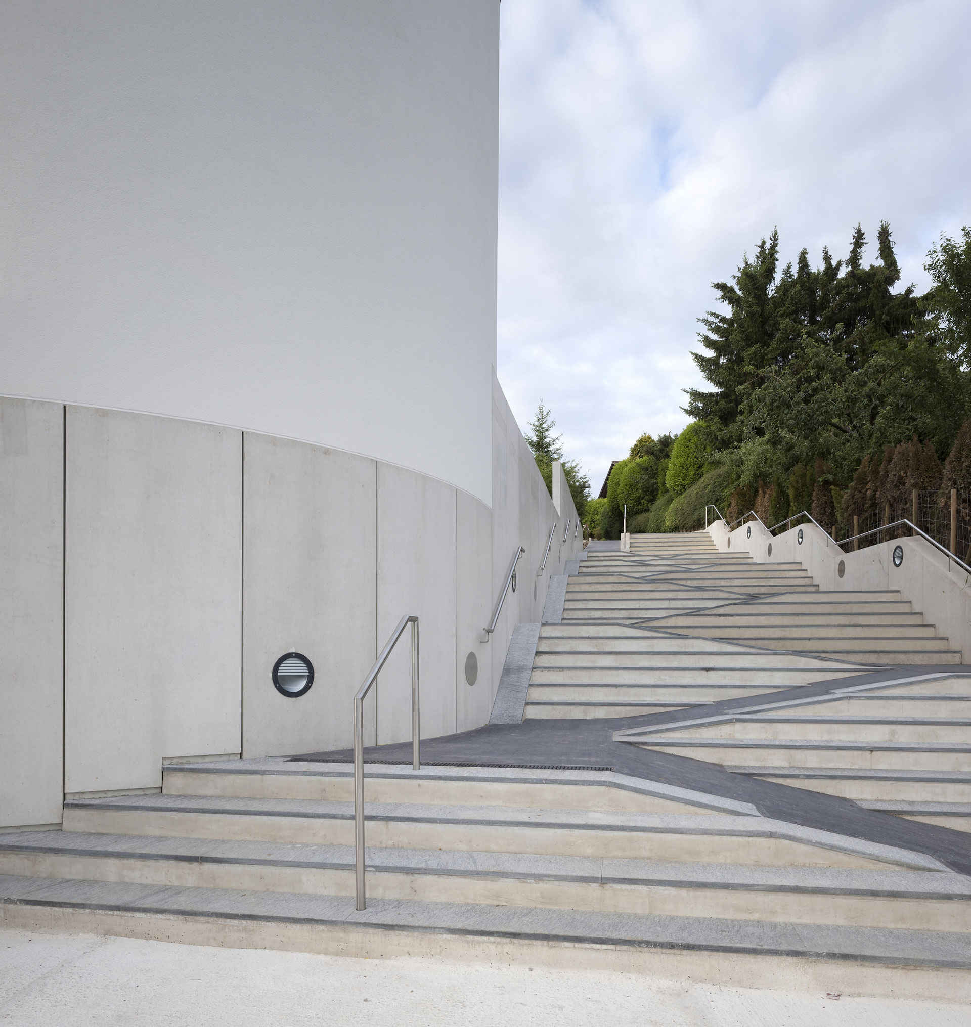 Der Hof ist das verbindende Element zwischen den Wohnungen und den öffentlichen Räumen. Die Kapelle befindet sich in einem ausbalancierten Gleichgewicht zwischen Längs- und Zentralbau. In ihrer räumlichen Mehrdeutigkeit kann sie mit der freien Bestuhlung auf die verschiedensten Liturgieformen eingehen. Das sanfte, vertikale Licht fliesst geheimnisvoll über die Rundung der Ost- und Längswände und scheint hier die Gravitationsgesetze aufzuheben. Der stimmungsvolle Raum erhält so seinen mystischen, heiteren Charakter.