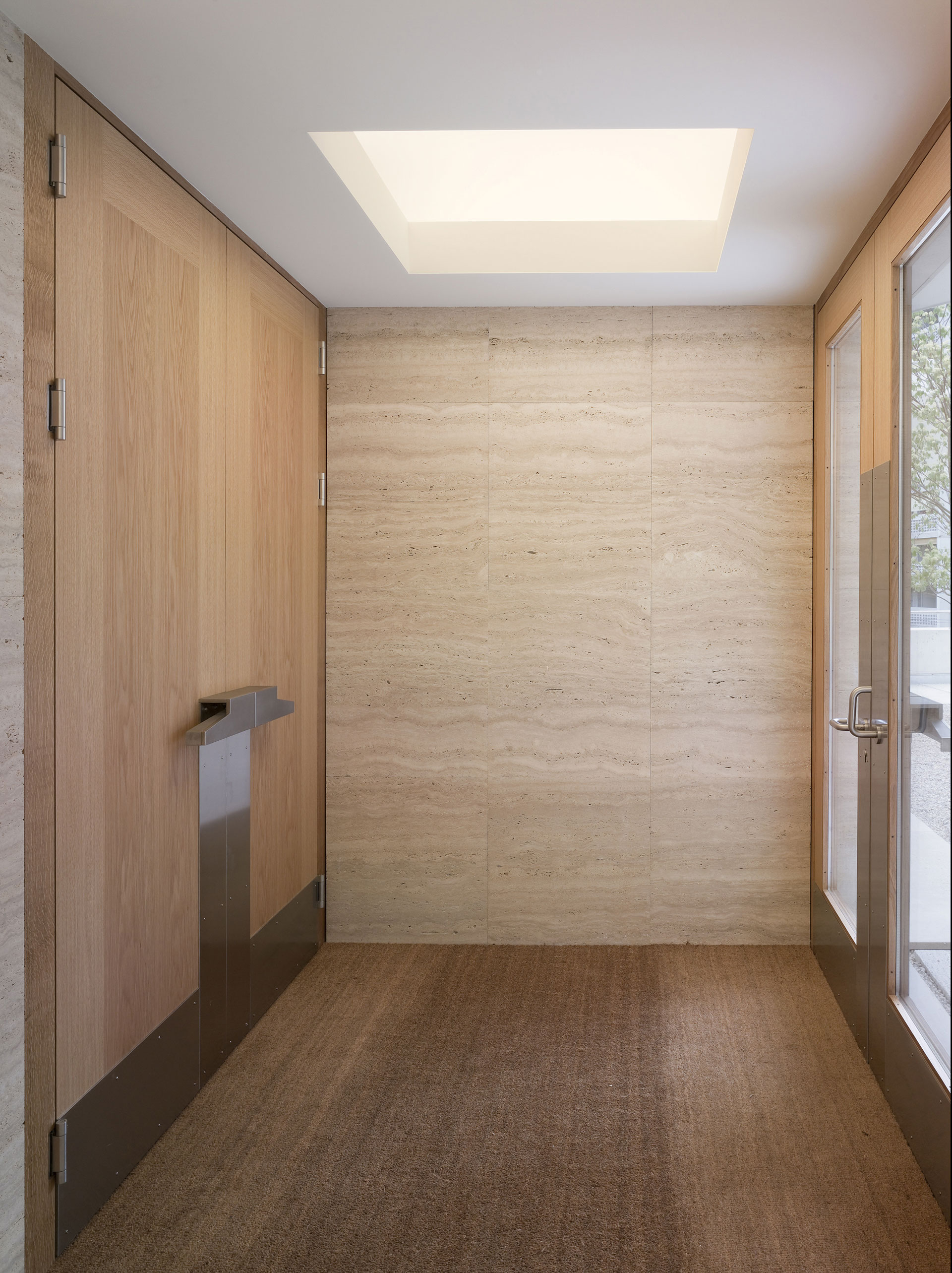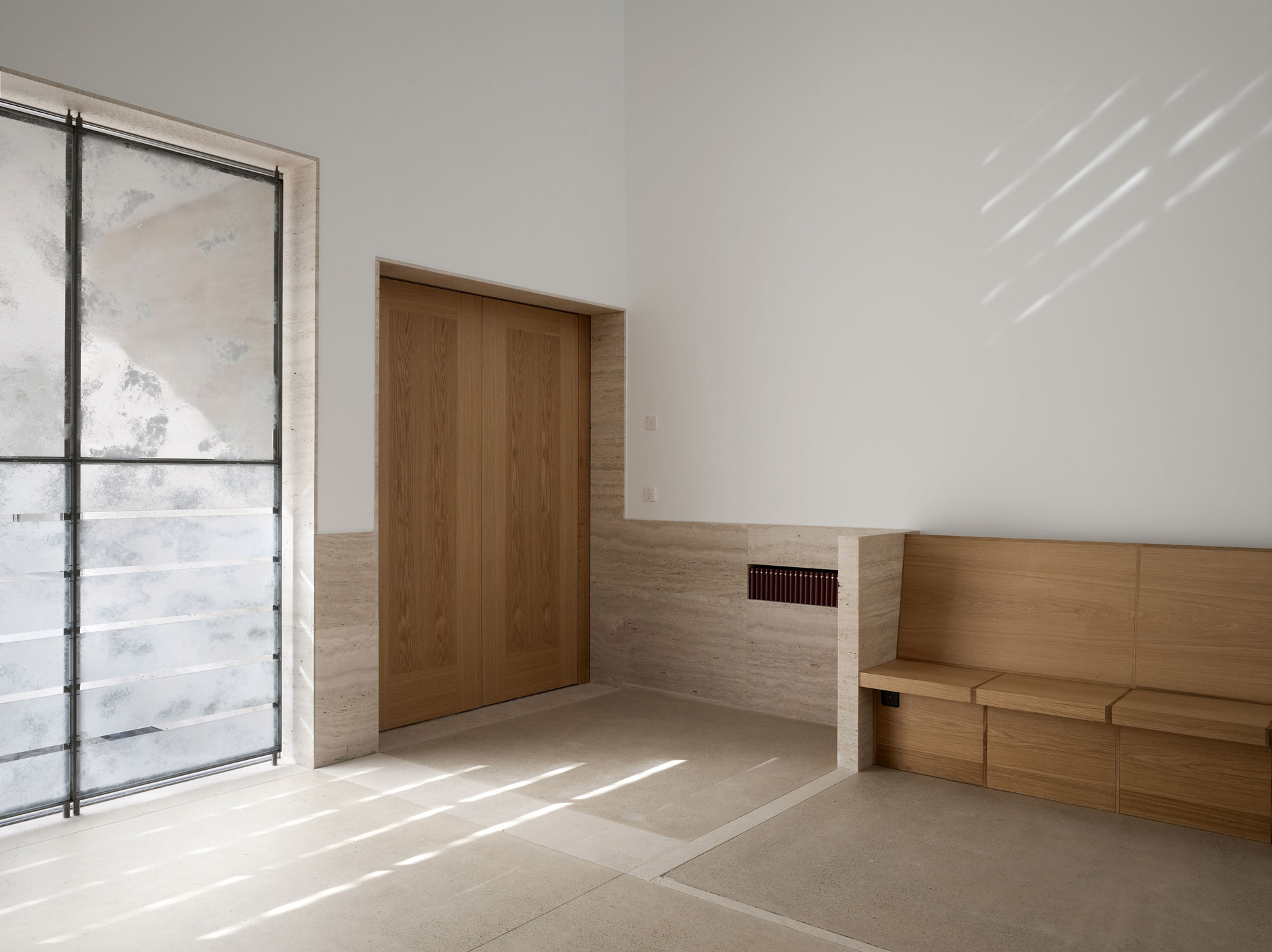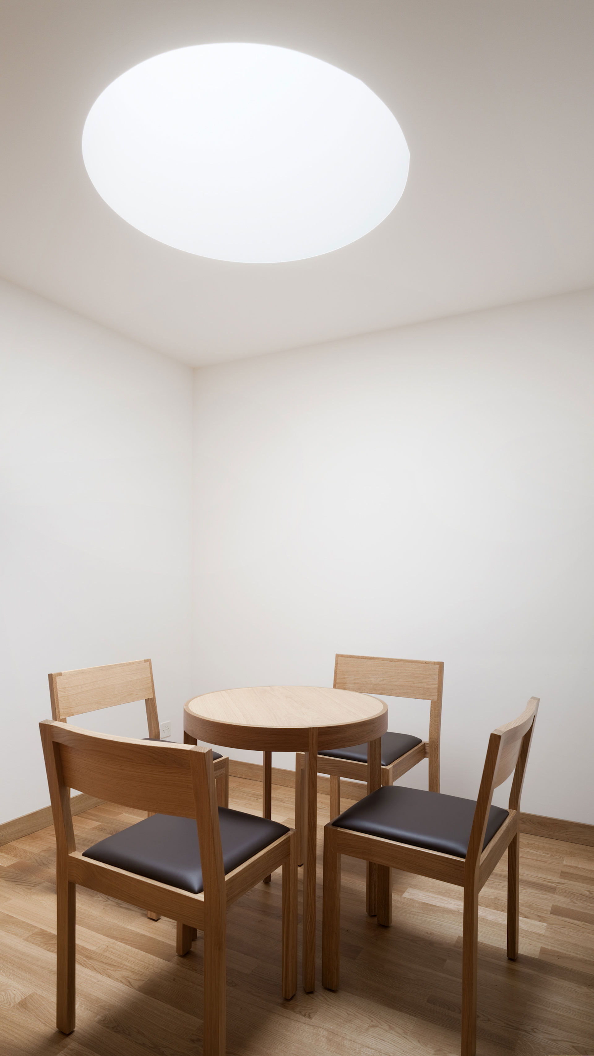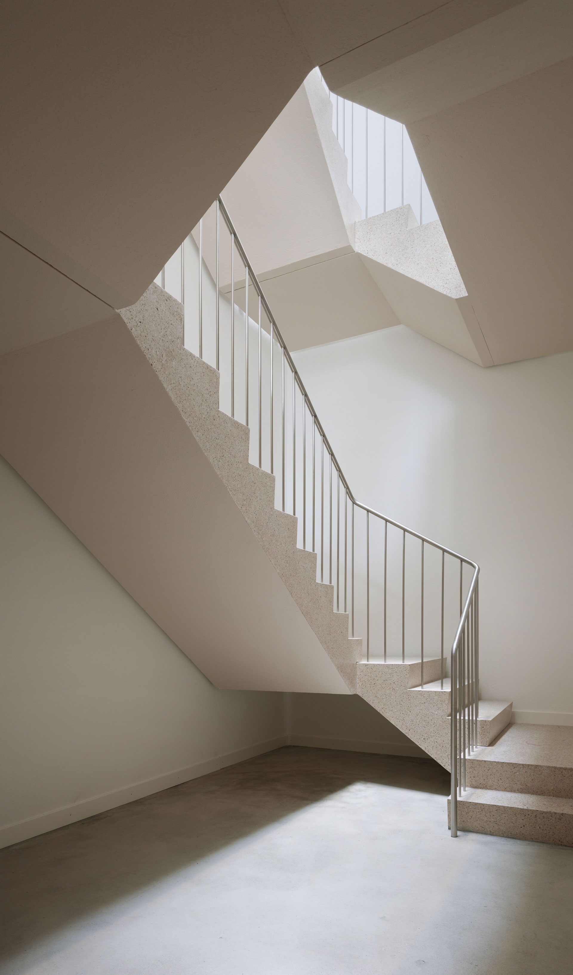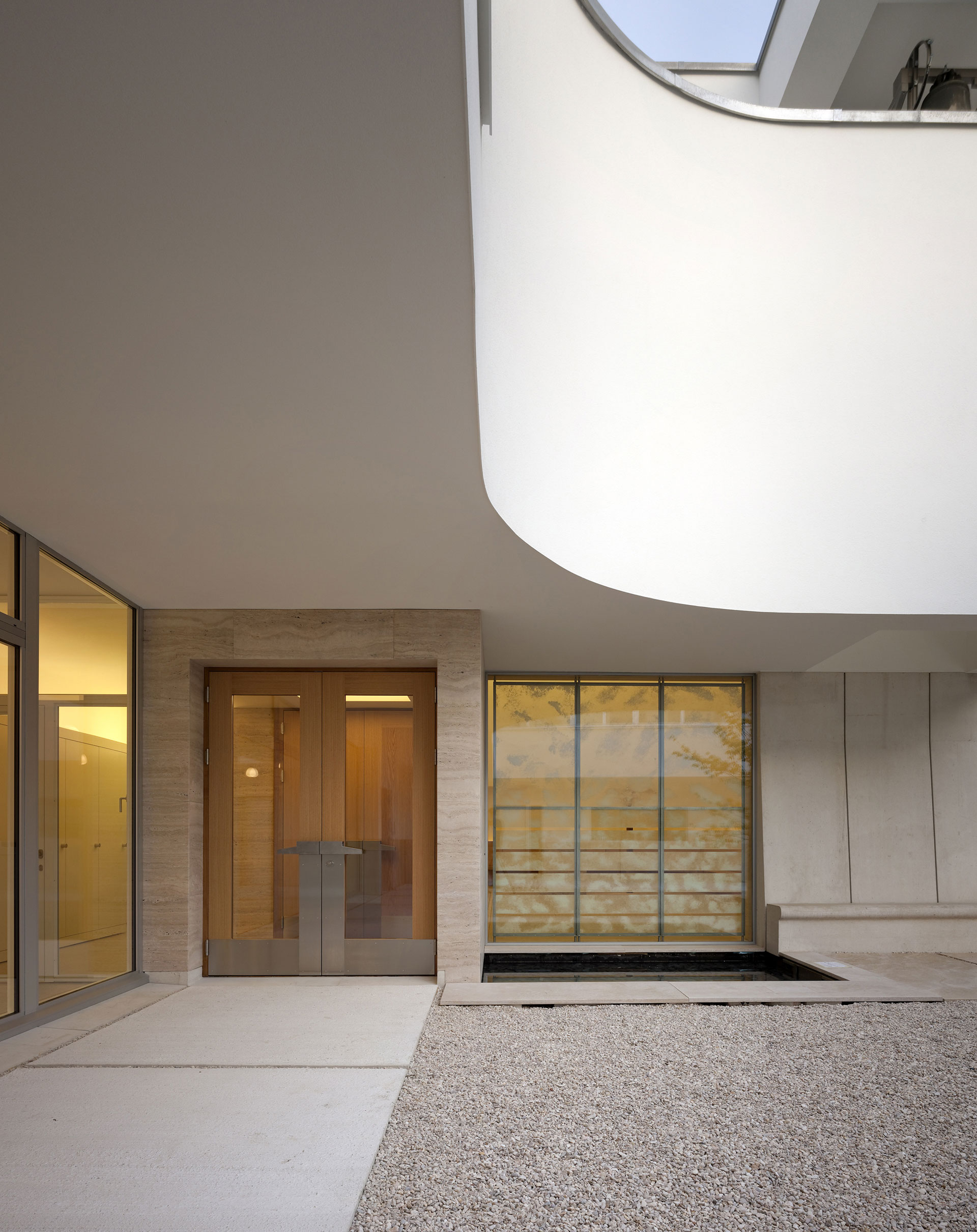 Der Hof ist das verbindende Element zwischen den Wohnungen und den öffentlichen Räumen. Die Kapelle befindet sich in einem ausbalancierten Gleichgewicht zwischen Längs- und Zentralbau. In ihrer räumlichen Mehrdeutigkeit kann sie mit der freien Bestuhlung auf die verschiedensten Liturgieformen eingehen. Das sanfte, vertikale Licht fliesst geheimnisvoll über die Rundung der Ost- und Längswände und scheint hier die Gravitationsgesetze aufzuheben. Der stimmungsvolle Raum erhält so seinen mystischen, heiteren Charakter.