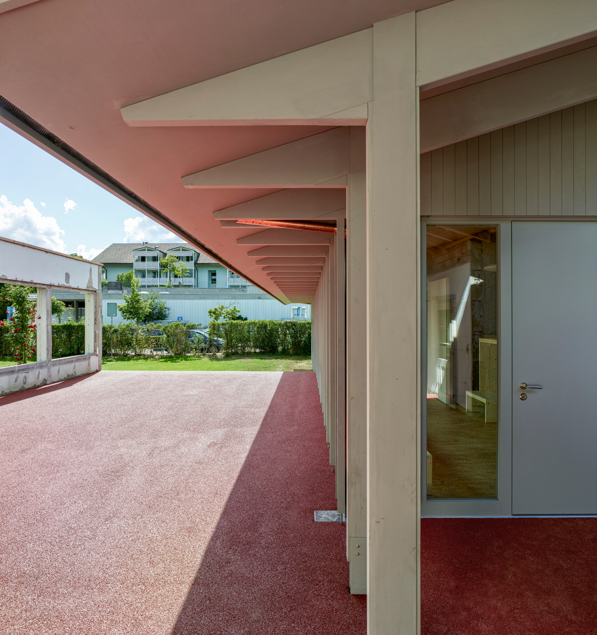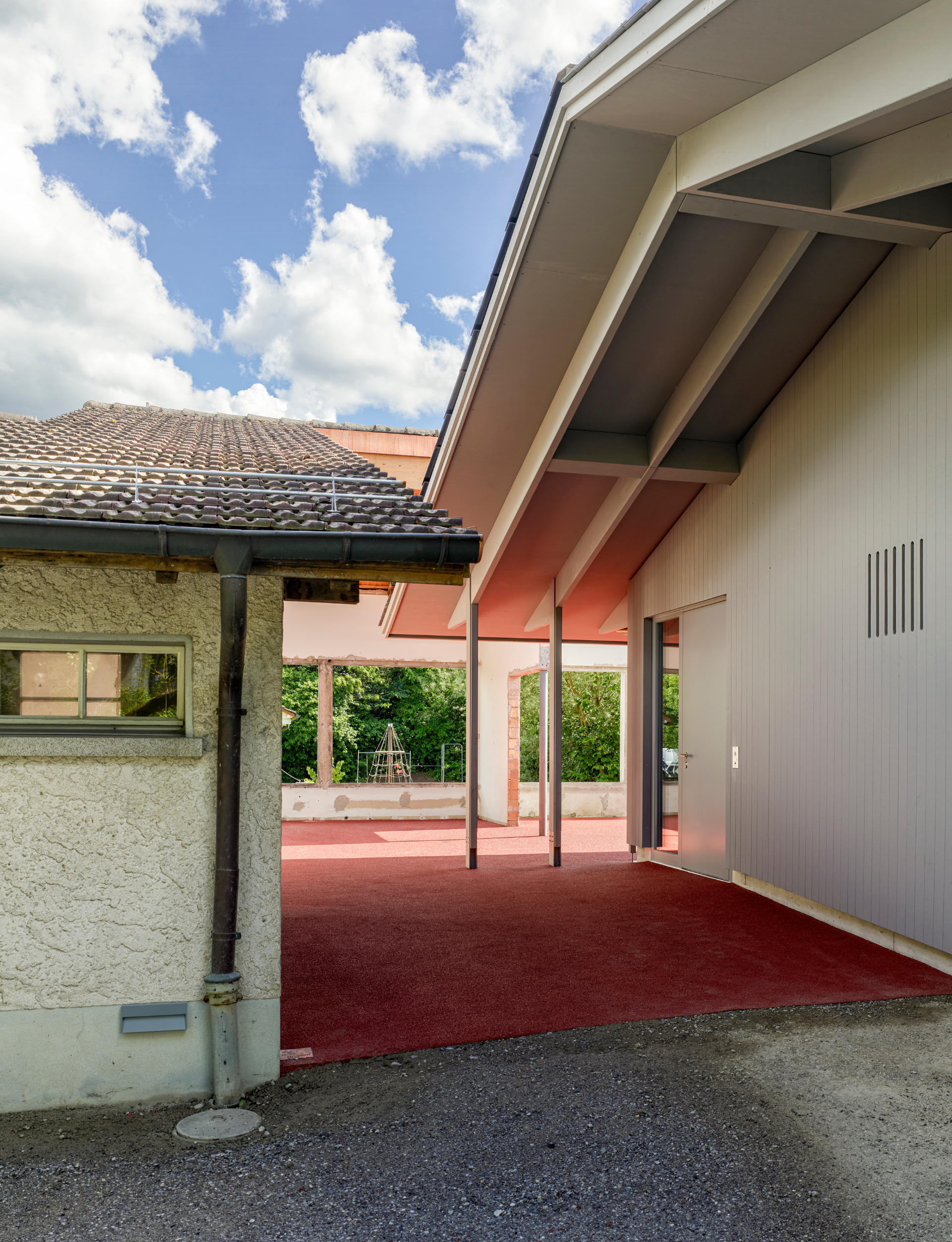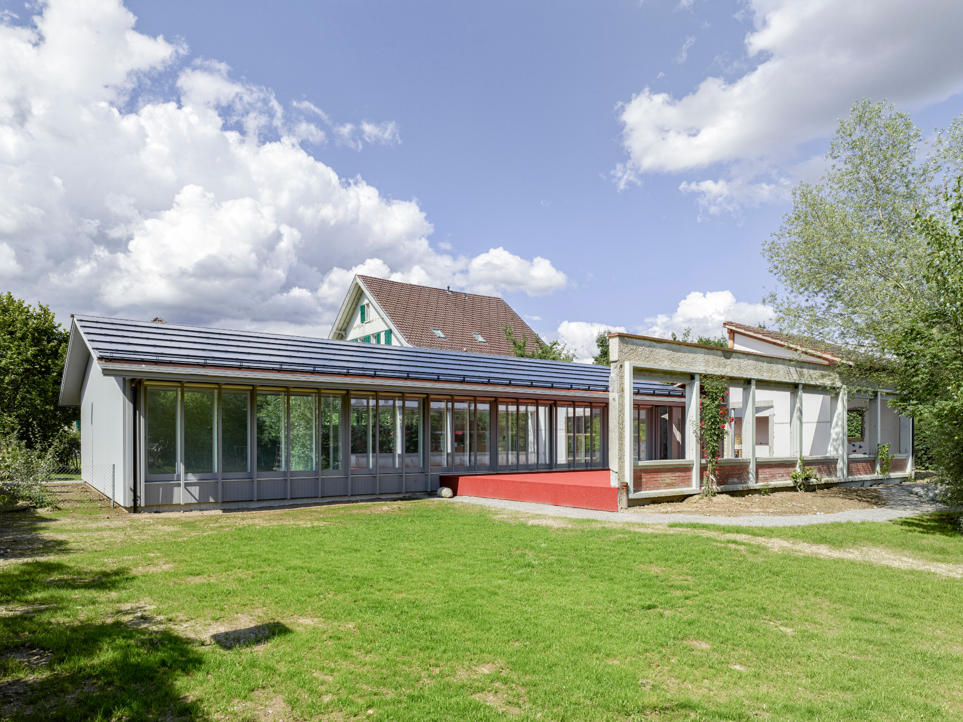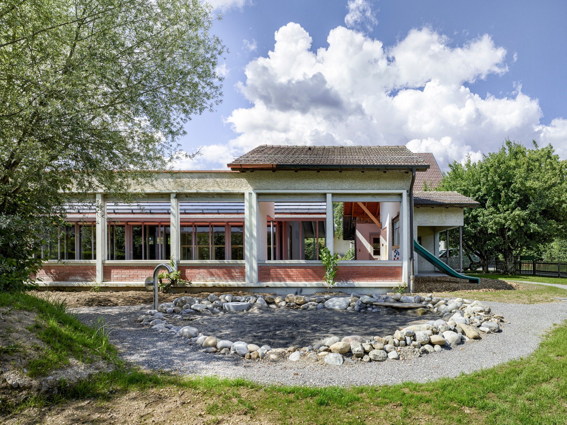 Neben dem Neubau bildet das erhaltene Fragment des bestehenden Kindergartengebäudes eine offene Struktur im Aussenraum. Der Rückeroberung der Natur preisgegeben und von Kletterpflanzen allmählich überwachsen, verbindet er als halbgedeckte Zwischenzone die Innenräume mit dem Garten. Auch gedanklich bleibt das übernommene Fragment offen und uneindeutig. Es ist zugleich Erinnerungsstück an Vergangenes und in seiner Unfertigkeit eine kreative Inspiration für Neues und wird zum Ort künftiger Erinnerungen.