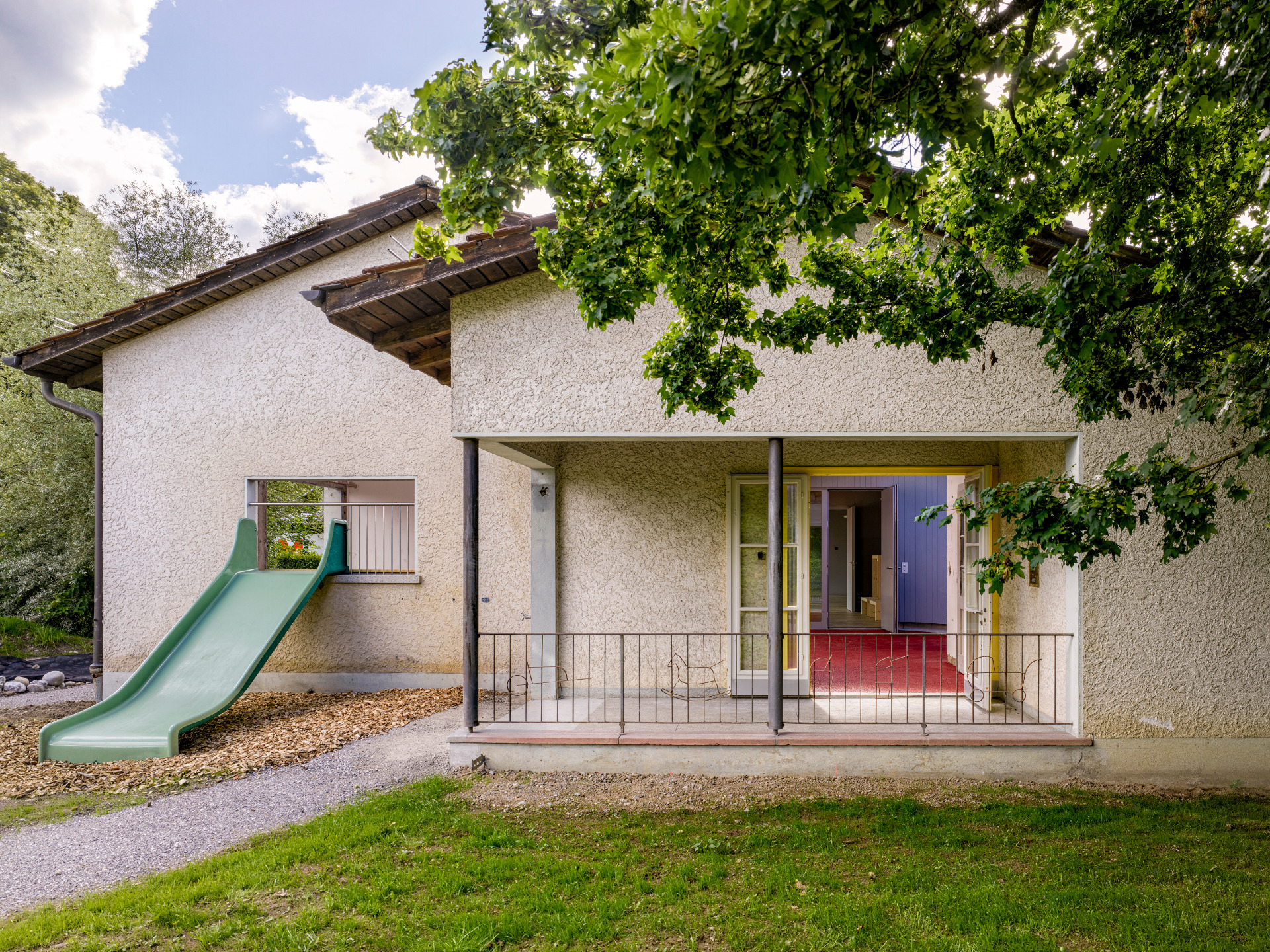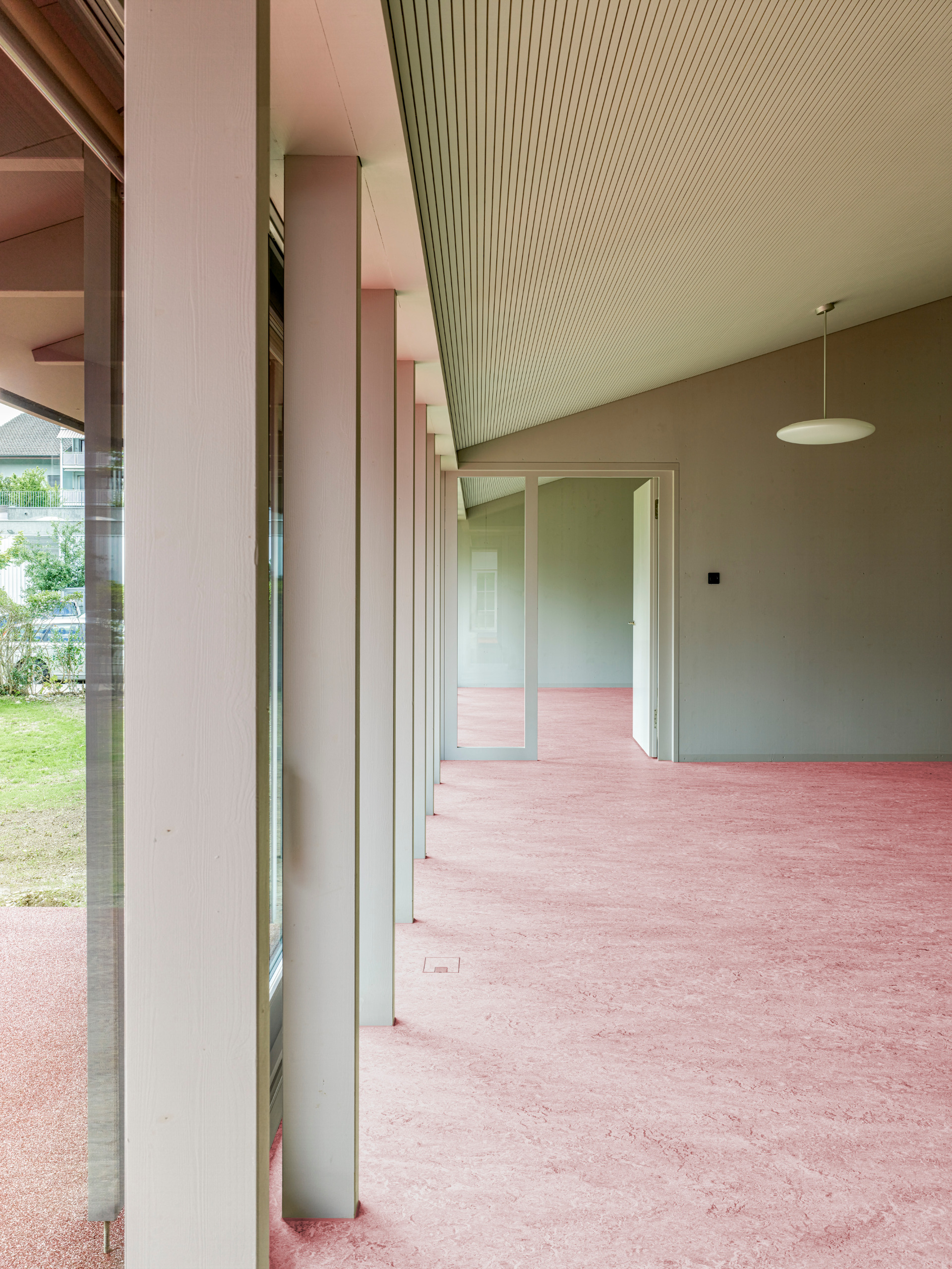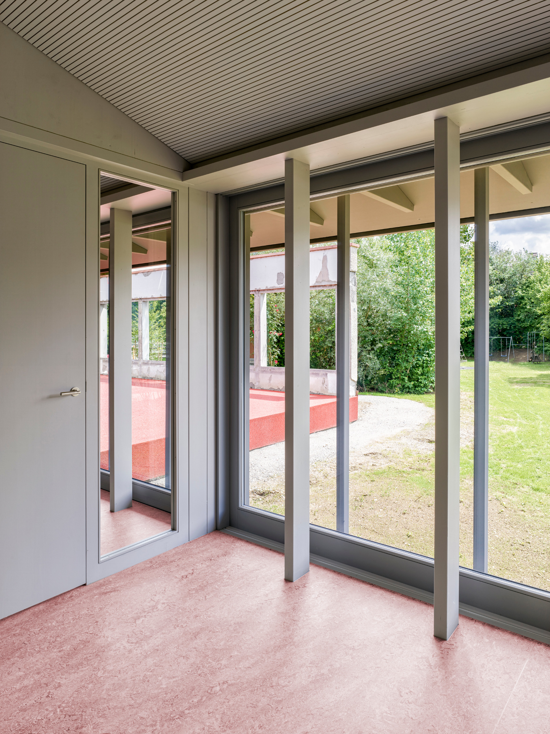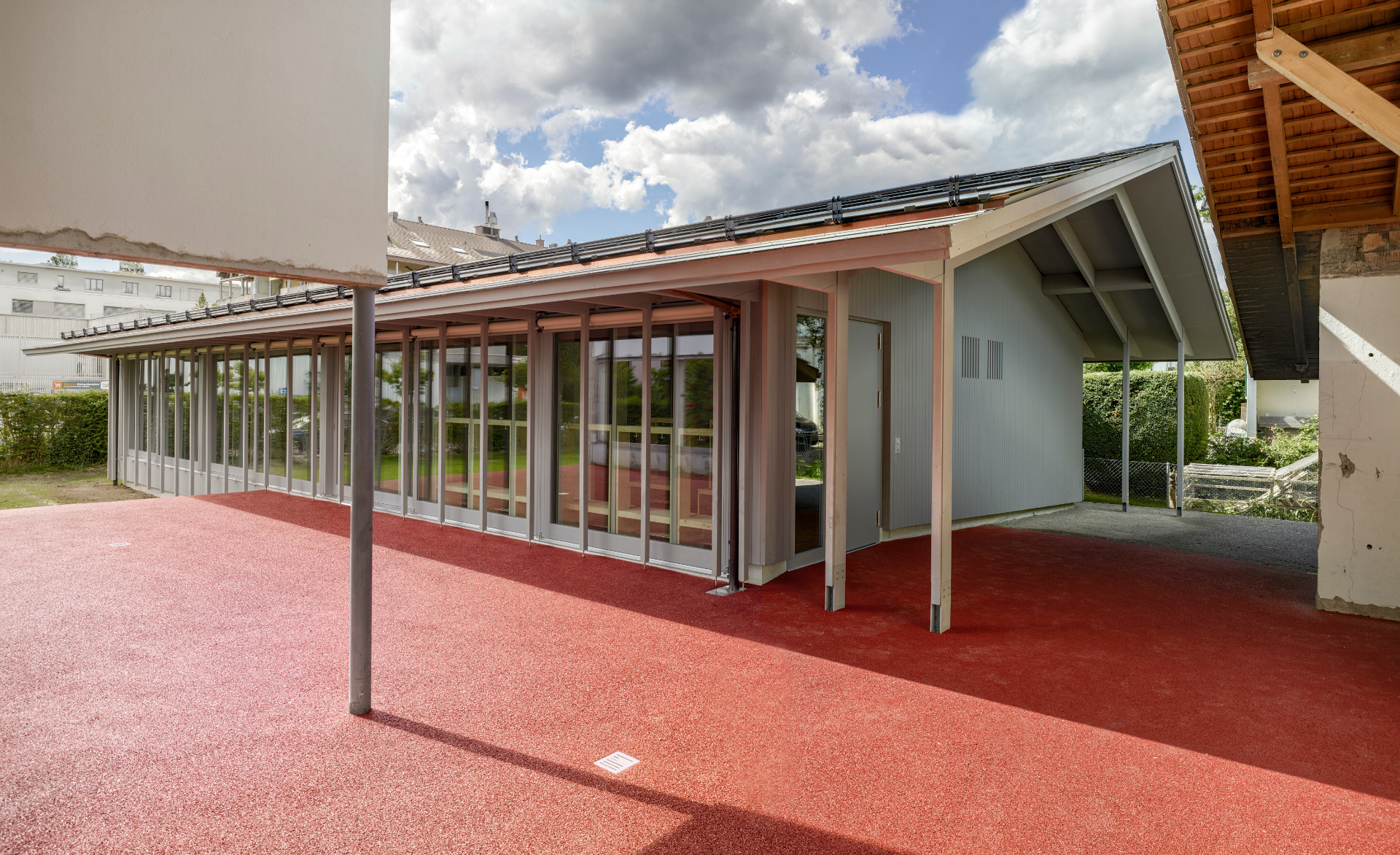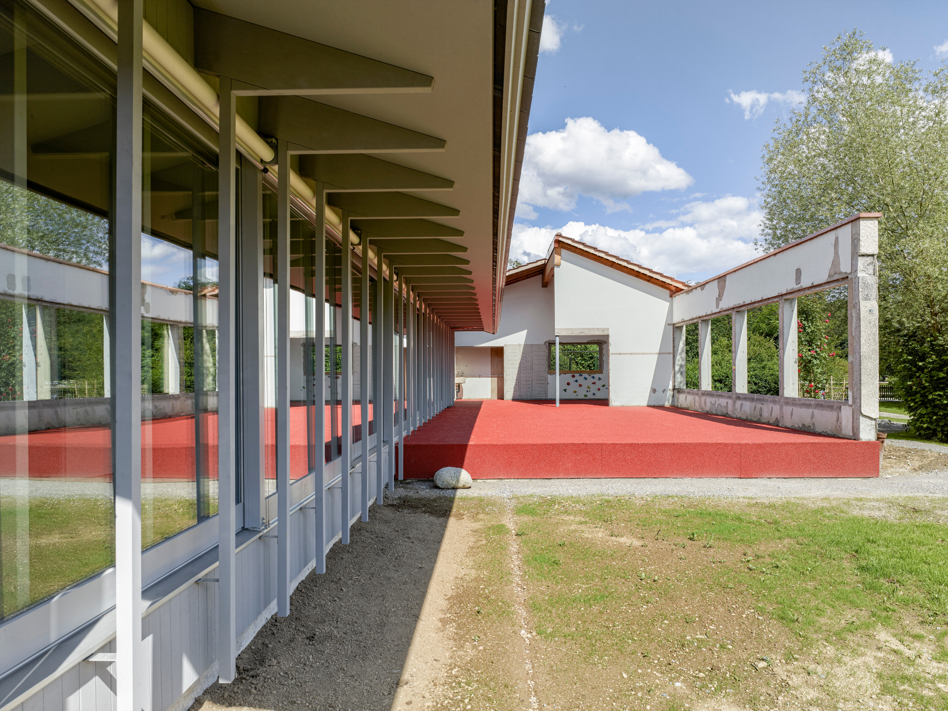 Neben dem Neubau bildet das erhaltene Fragment des bestehenden Kindergartengebäudes eine offene Struktur im Aussenraum. Der Rückeroberung der Natur preisgegeben und von Kletterpflanzen allmählich überwachsen, verbindet er als halbgedeckte Zwischenzone die Innenräume mit dem Garten. Auch gedanklich bleibt das übernommene Fragment offen und uneindeutig. Es ist zugleich Erinnerungsstück an Vergangenes und in seiner Unfertigkeit eine kreative Inspiration für Neues und wird zum Ort künftiger Erinnerungen.
