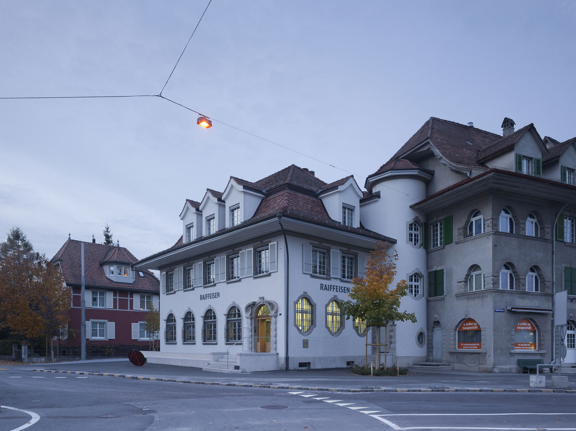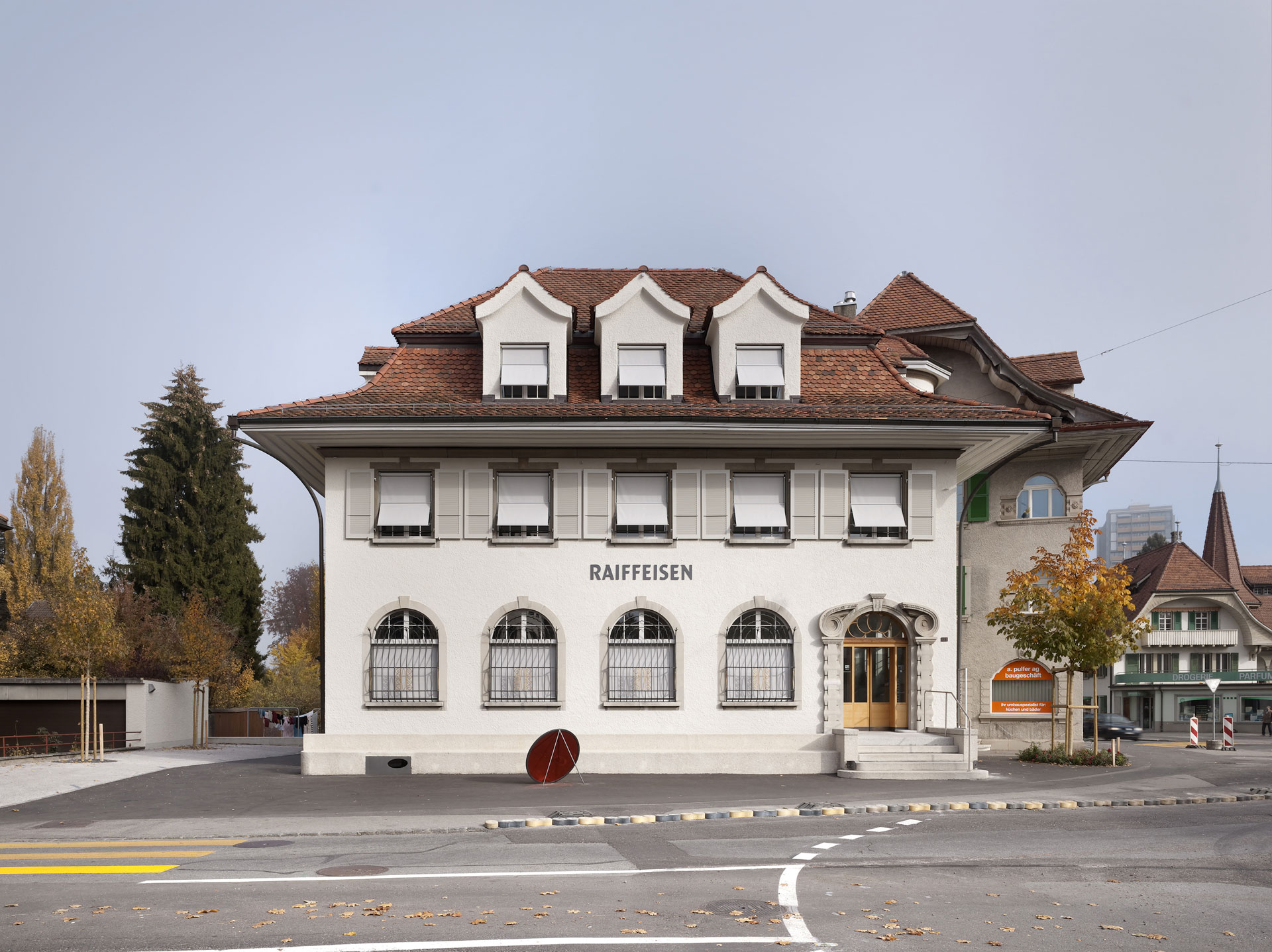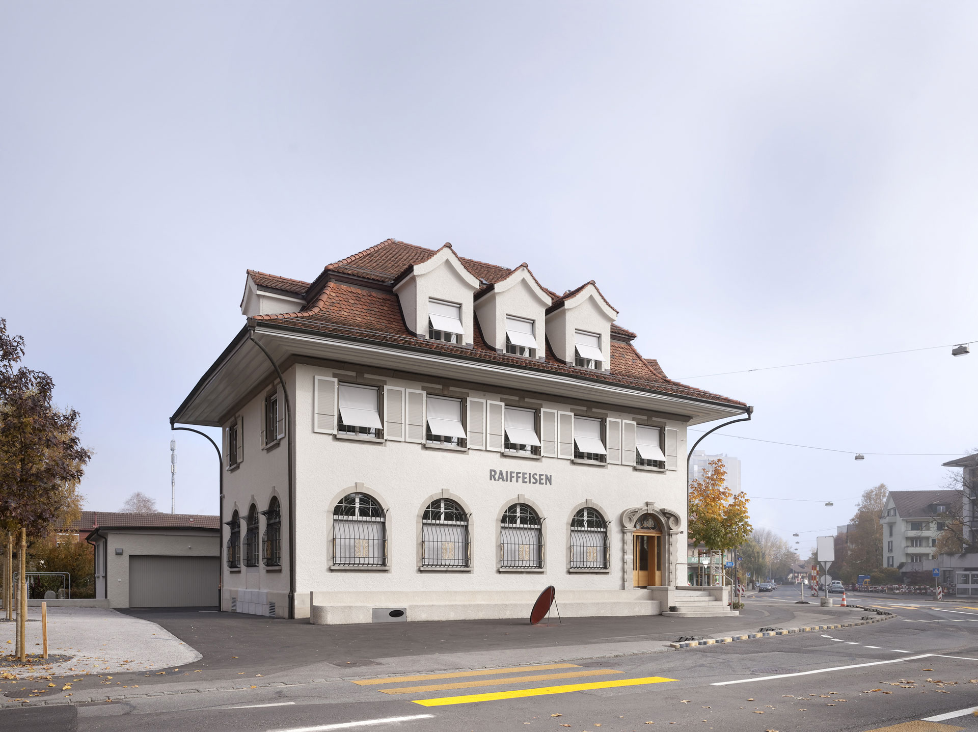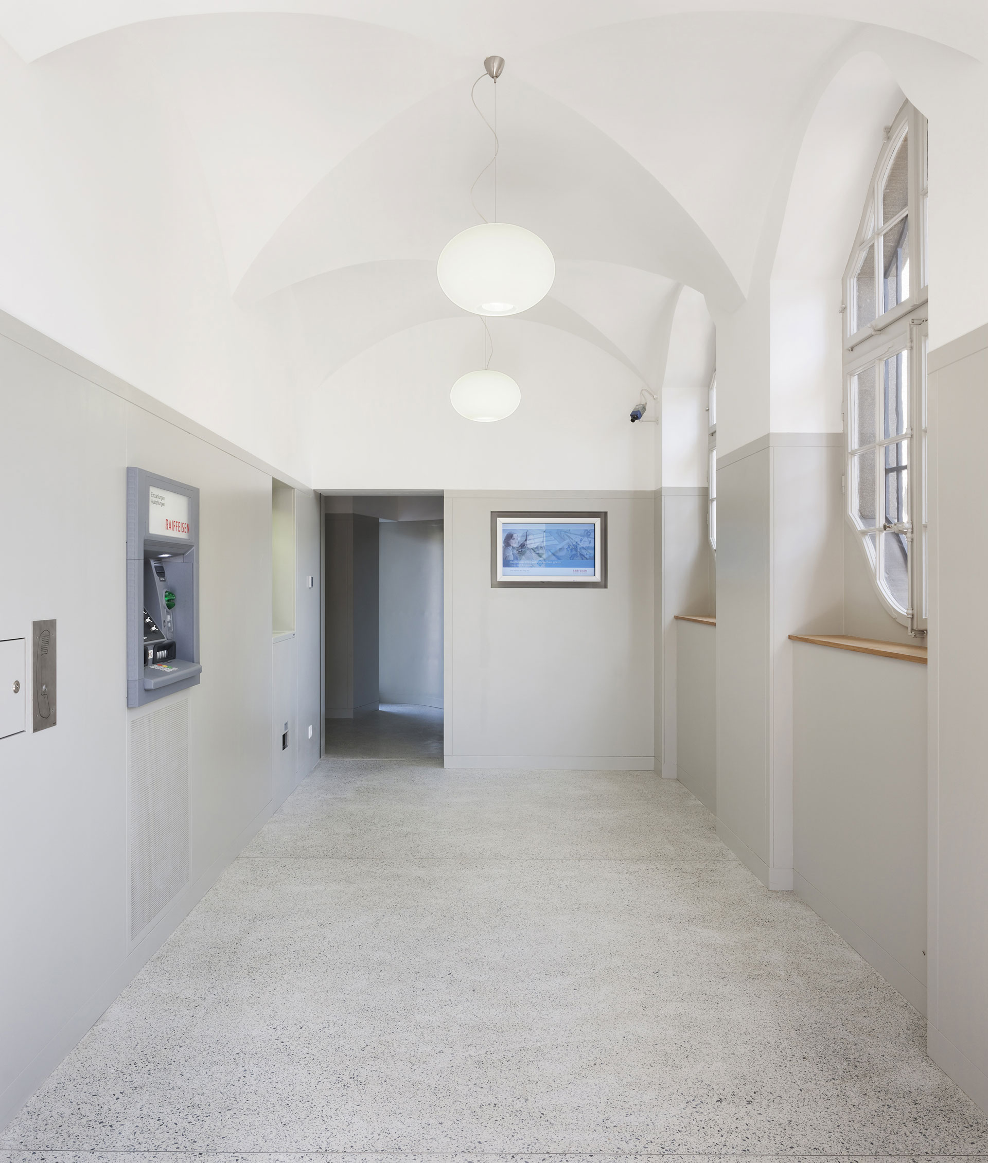 Zur Realisierung einer einladenden, transparenten Bankfiliale im geschützten Massivbau wurde hier das klassische Gestaltungsprinzip von raumverbindenden Alignements der Öffnungen beibehalten und weiterentwickelt. Mit dem Einführen einer konstanten, die Räume verbindenden Horizontlinie, wurde das Prinzip der abgeschlossenen Kammern im Erdgeschoss überwunden. Das historisch verwurzelte Gestaltungselement des Brusttäfers entwickelt so in der dritten Dimension eine verbindende Offenheit.