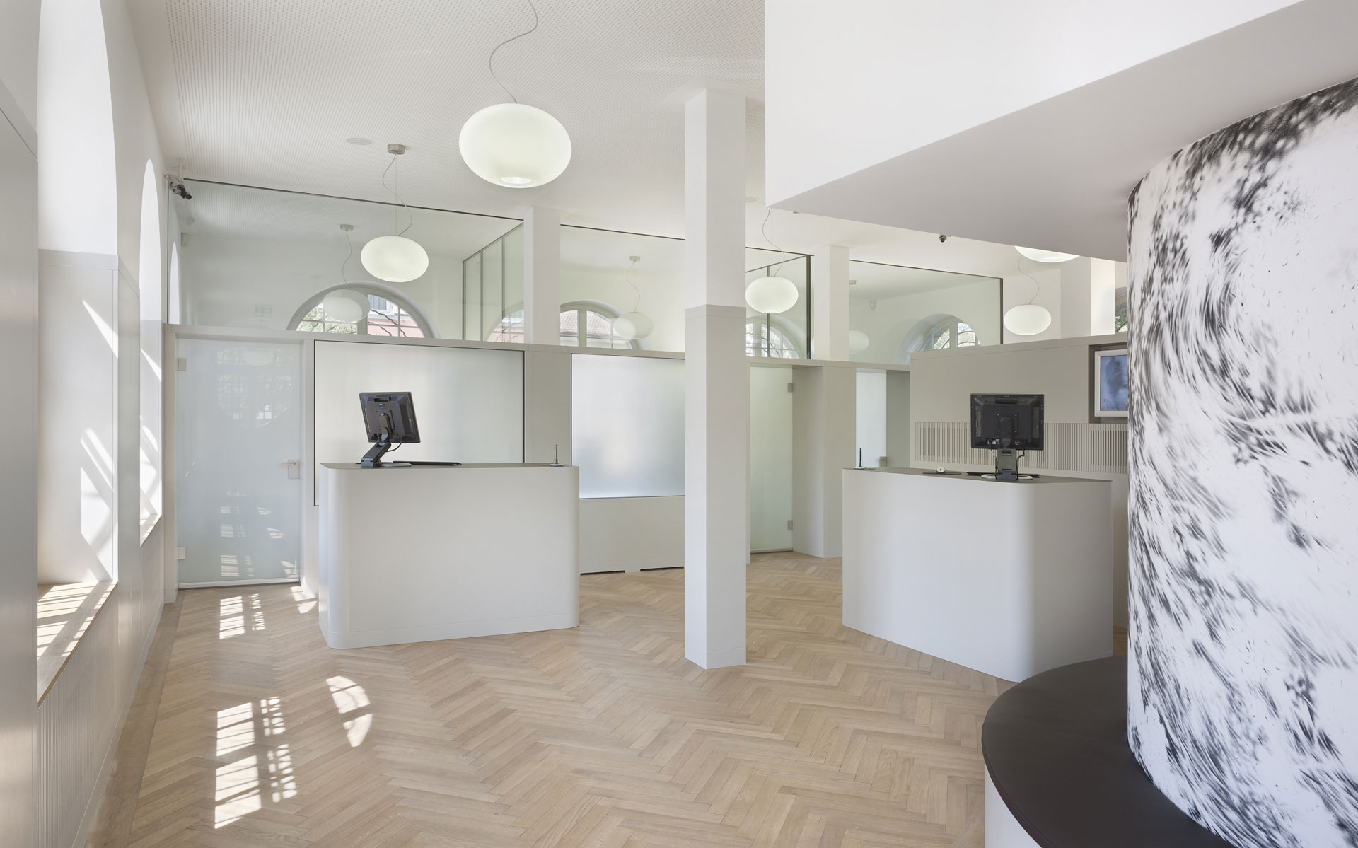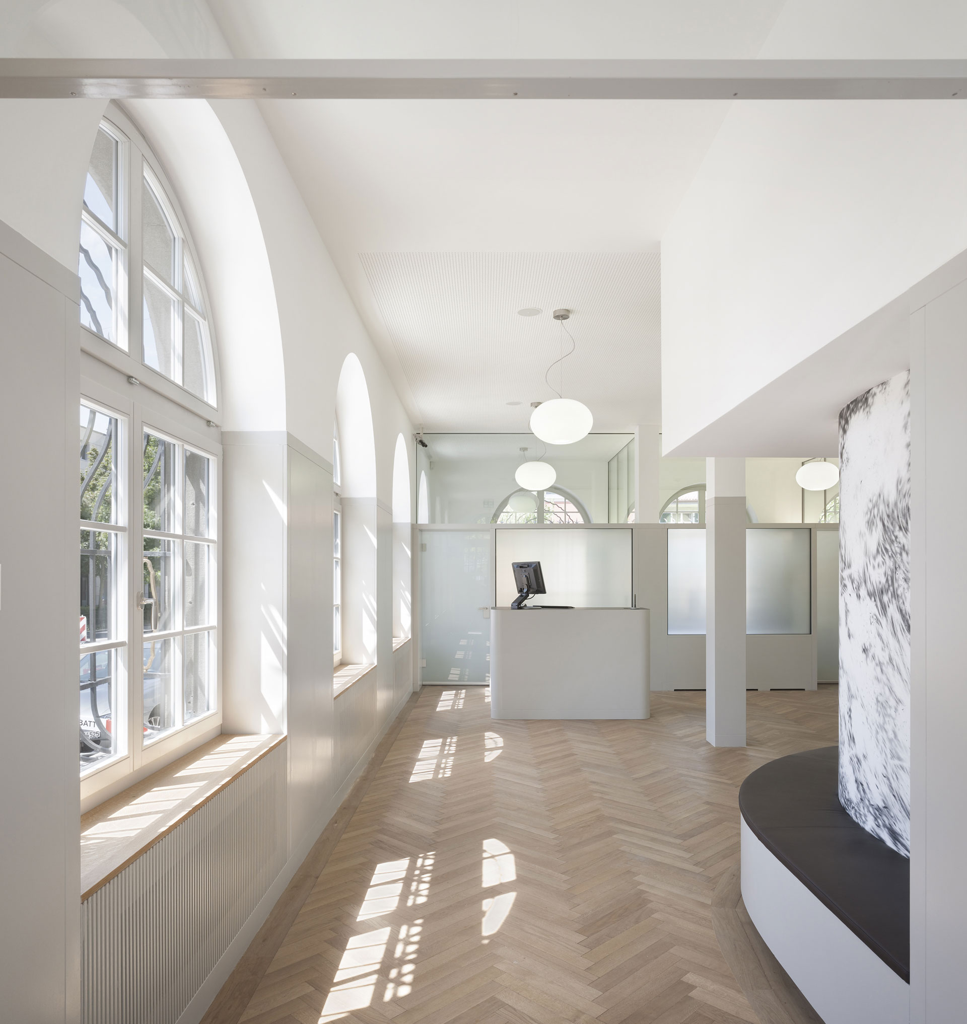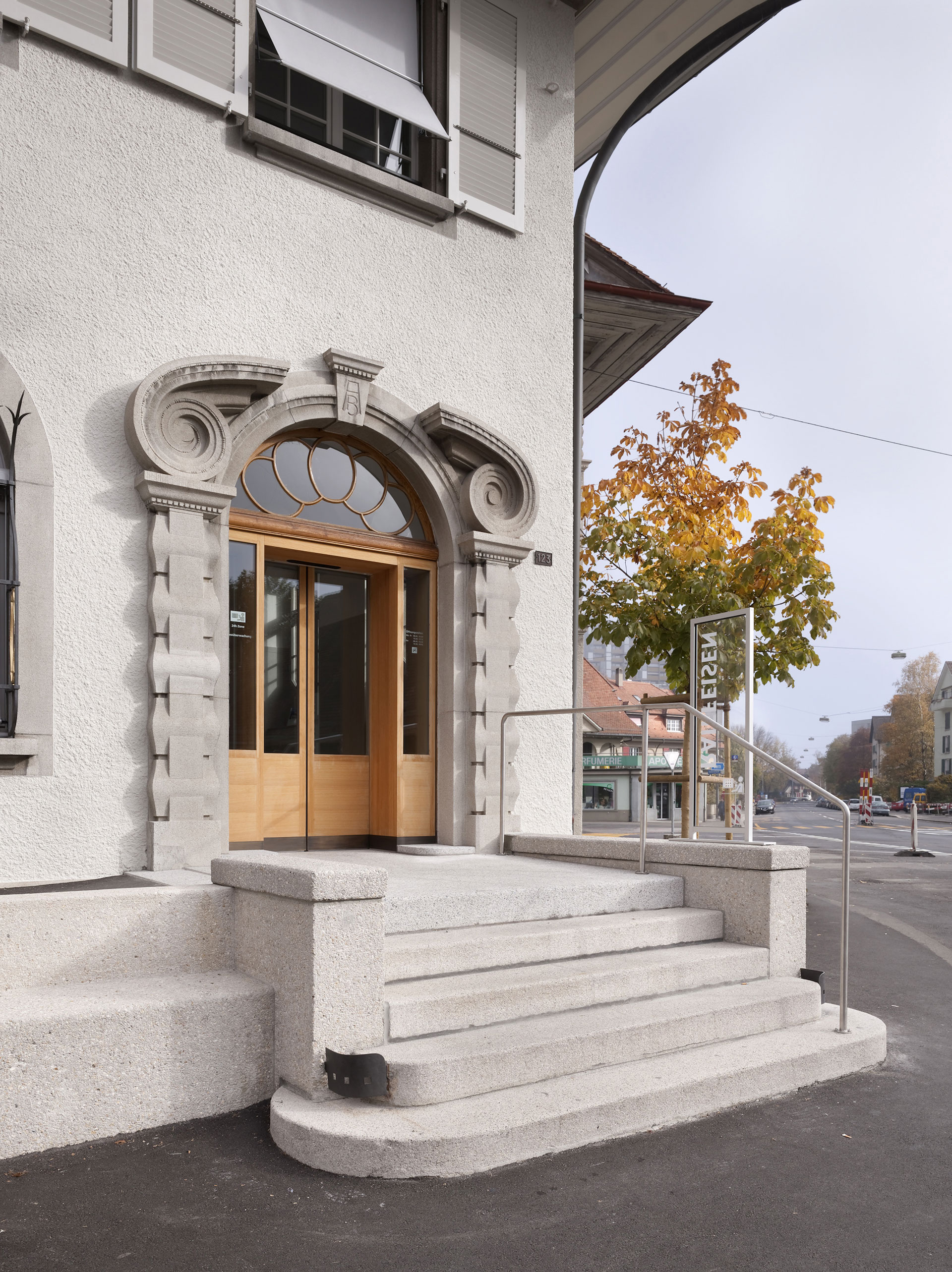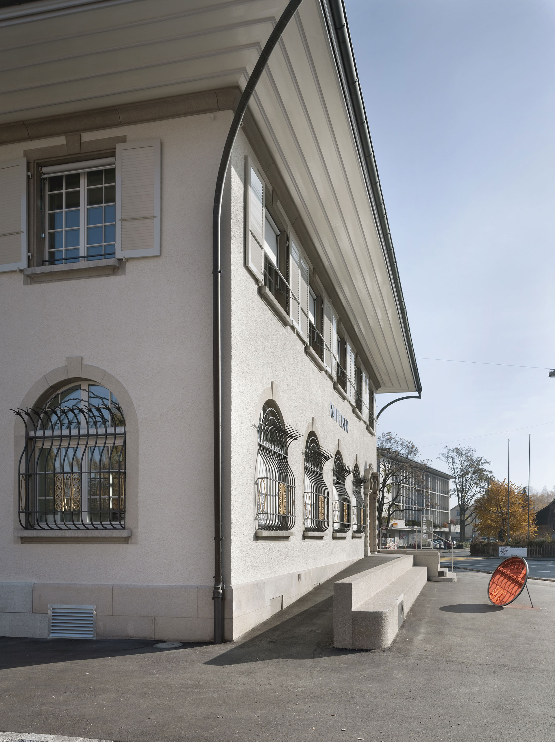 Zur Realisierung einer einladenden, transparenten Bankfiliale im geschützten Massivbau wurde hier das klassische Gestaltungsprinzip von raumverbindenden Alignements der Öffnungen beibehalten und weiterentwickelt. Mit dem Einführen einer konstanten, die Räume verbindenden Horizontlinie, wurde das Prinzip der abgeschlossenen Kammern im Erdgeschoss überwunden. Das historisch verwurzelte Gestaltungselement des Brusttäfers entwickelt so in der dritten Dimension eine verbindende Offenheit.