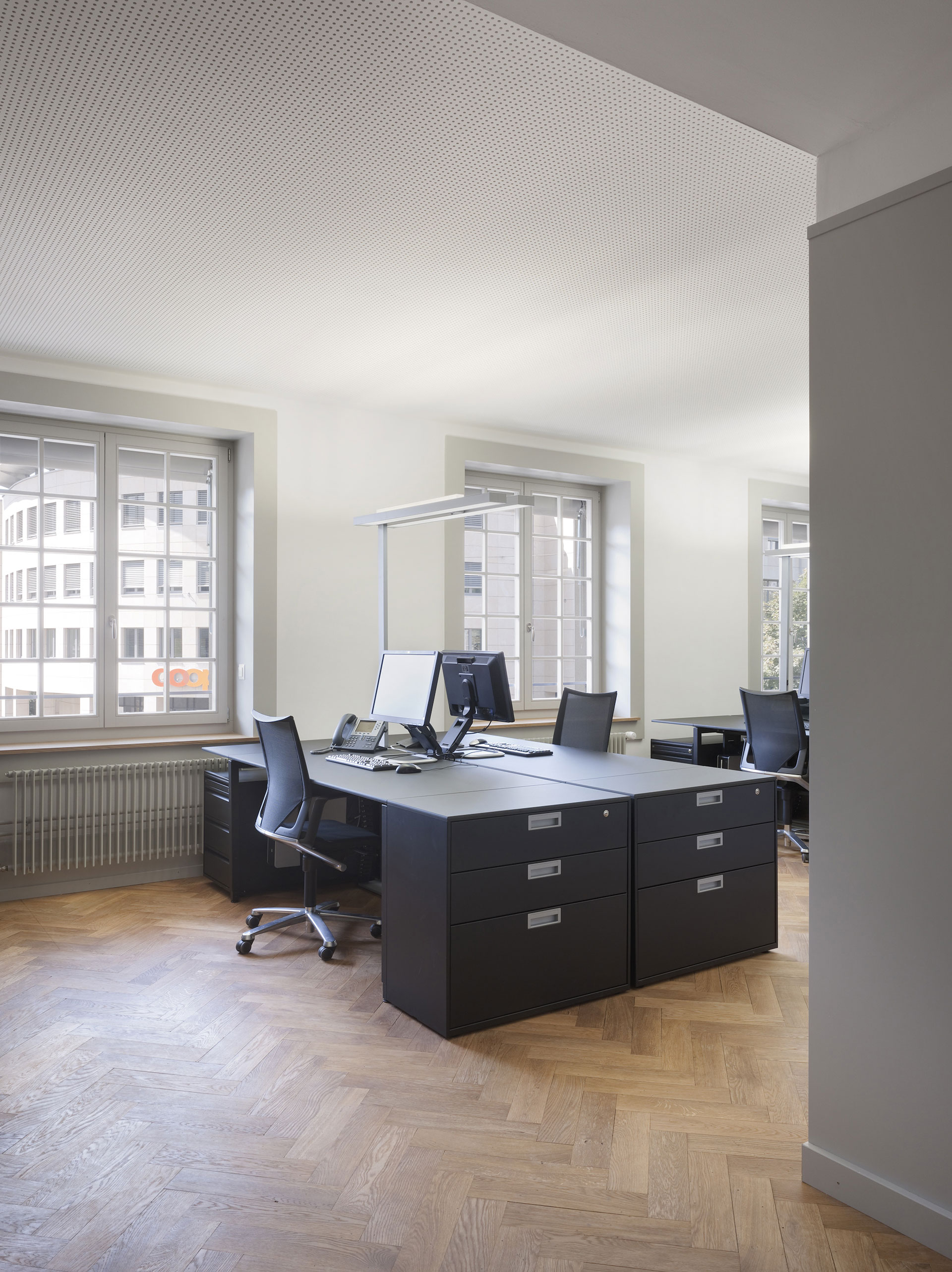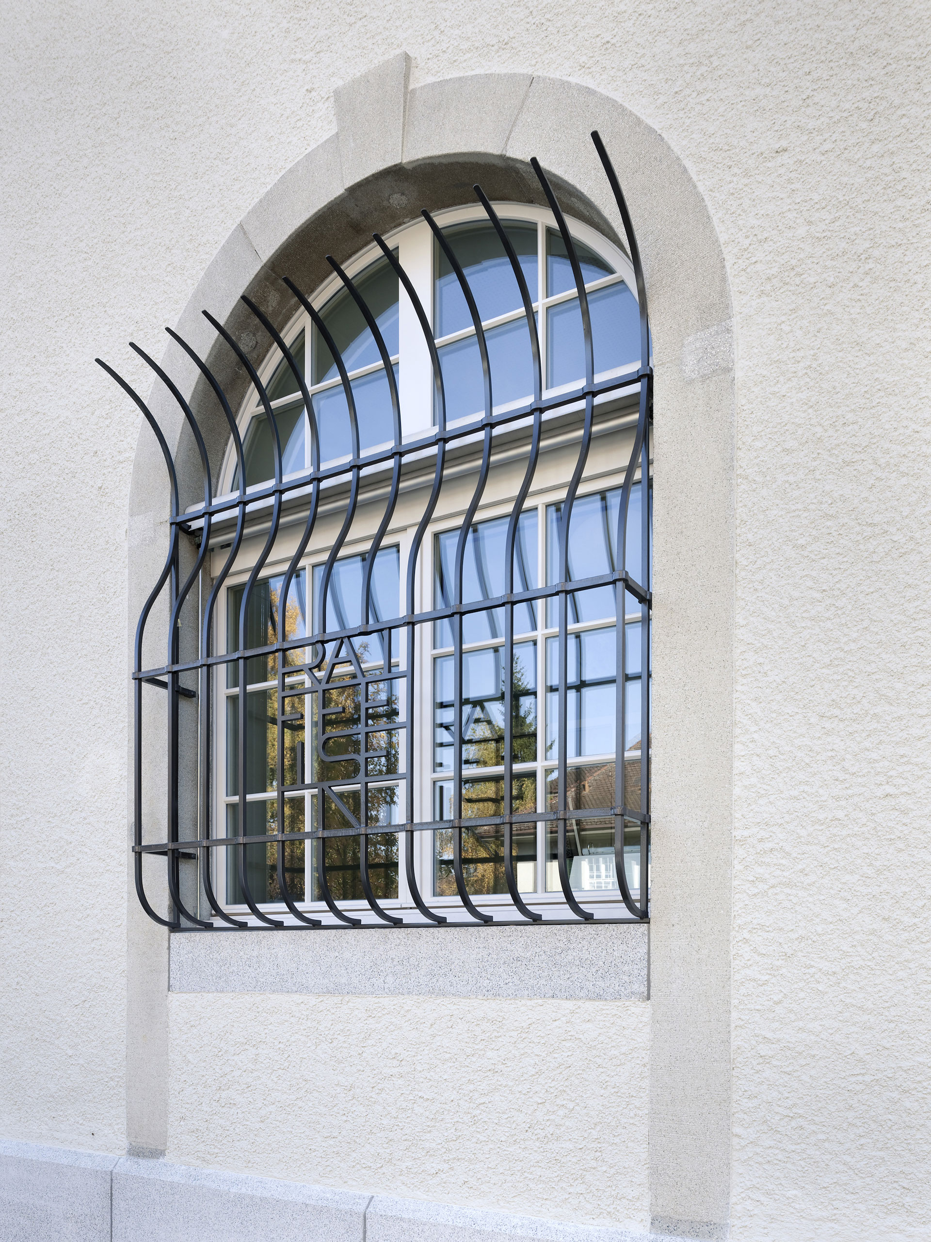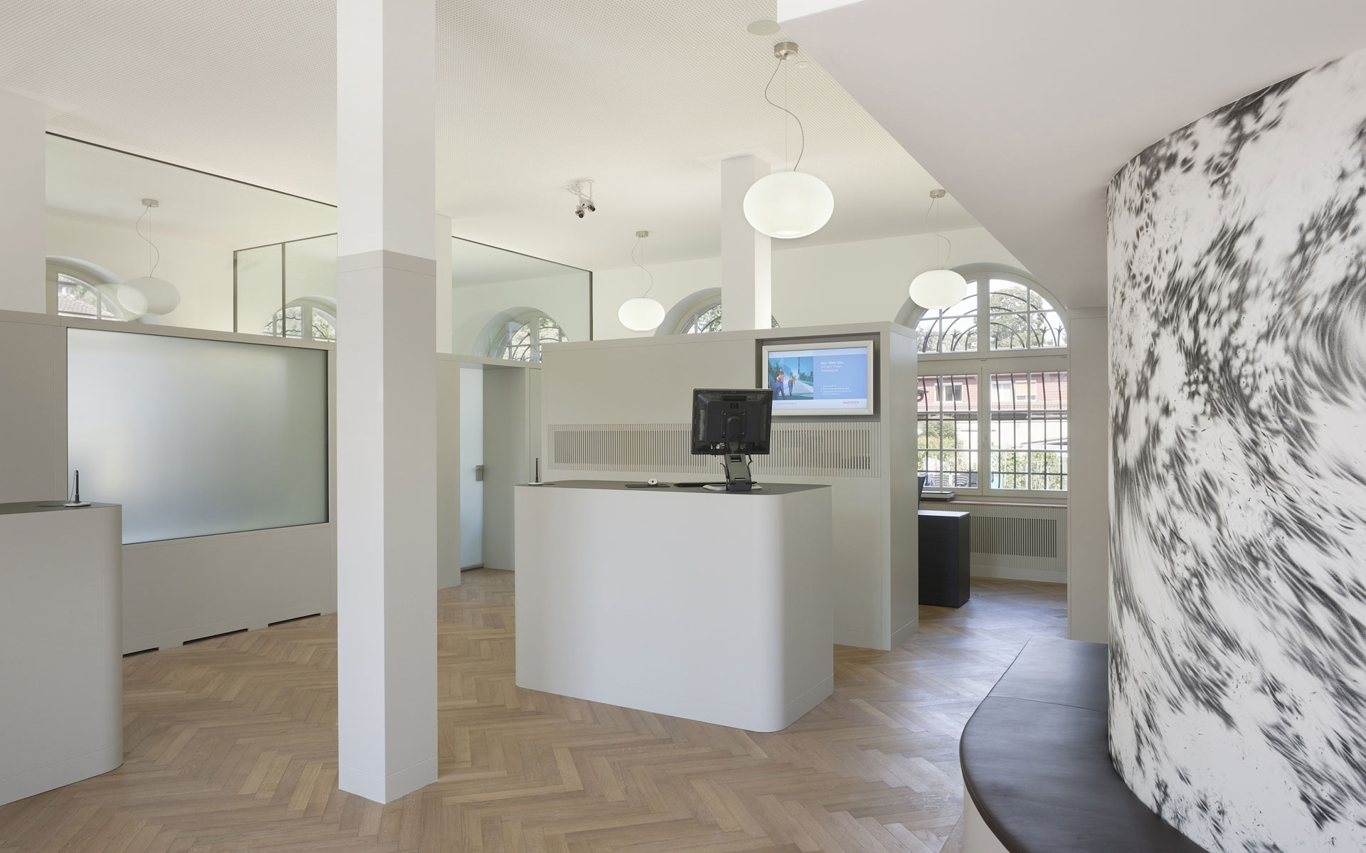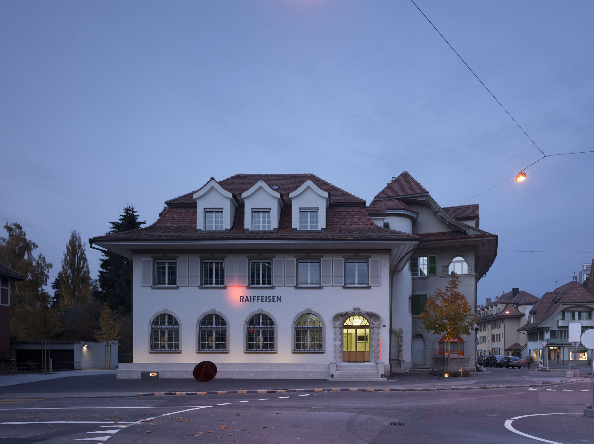 Zur Realisierung einer einladenden, transparenten Bankfiliale im geschützten Massivbau wurde hier das klassische Gestaltungsprinzip von raumverbindenden Alignements der Öffnungen beibehalten und weiterentwickelt. Mit dem Einführen einer konstanten, die Räume verbindenden Horizontlinie, wurde das Prinzip der abgeschlossenen Kammern im Erdgeschoss überwunden. Das historisch verwurzelte Gestaltungselement des Brusttäfers entwickelt so in der dritten Dimension eine verbindende Offenheit.