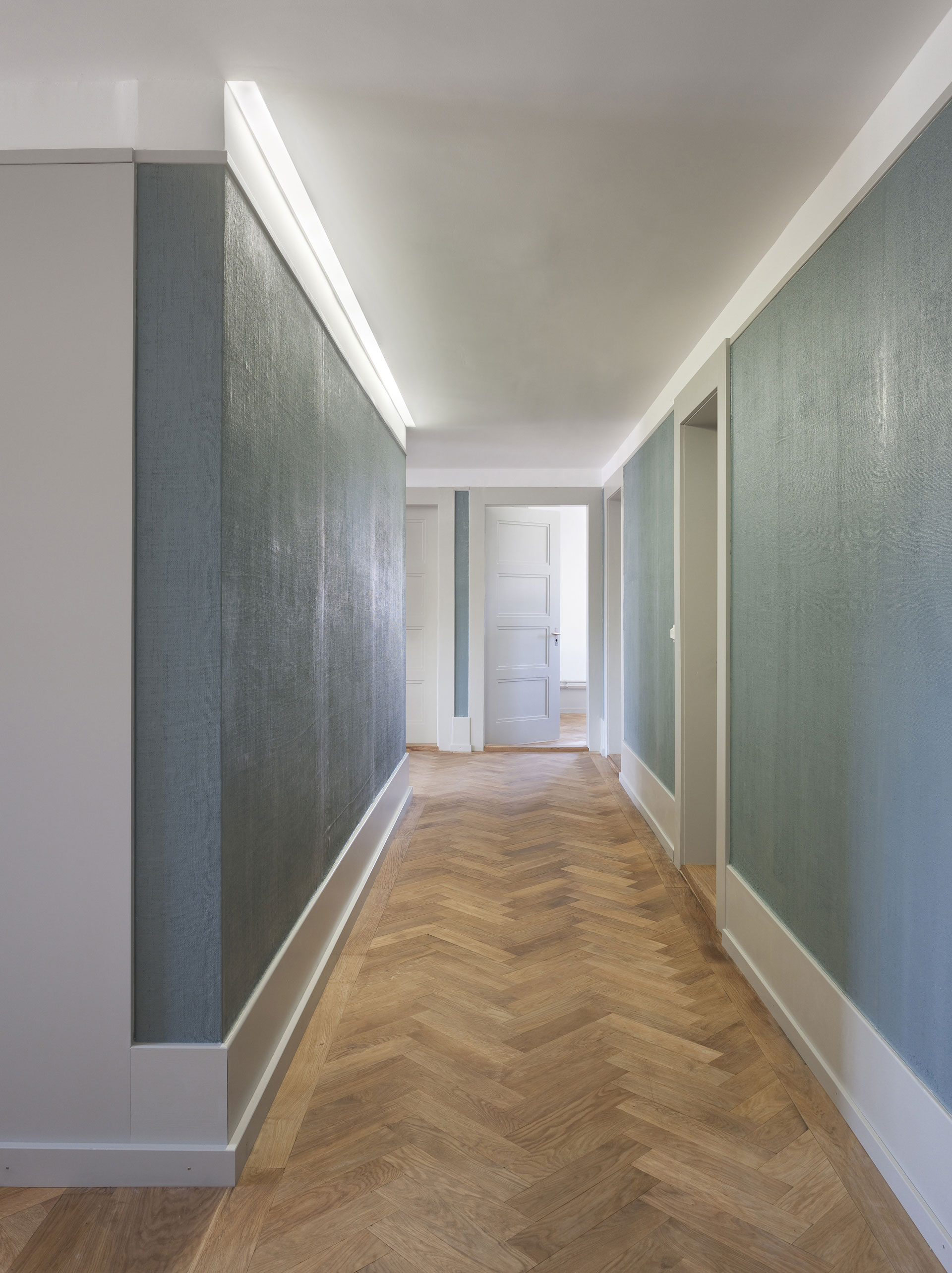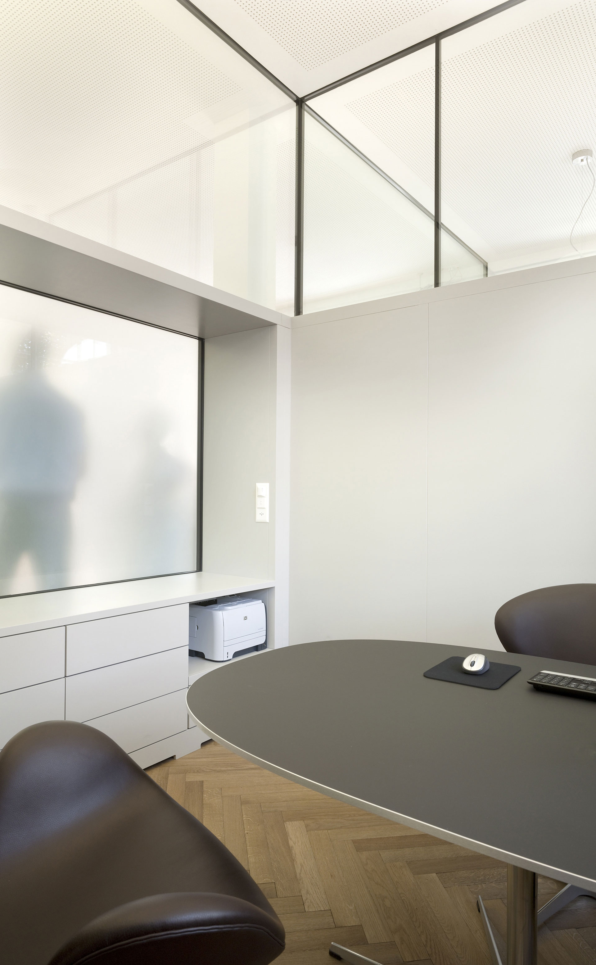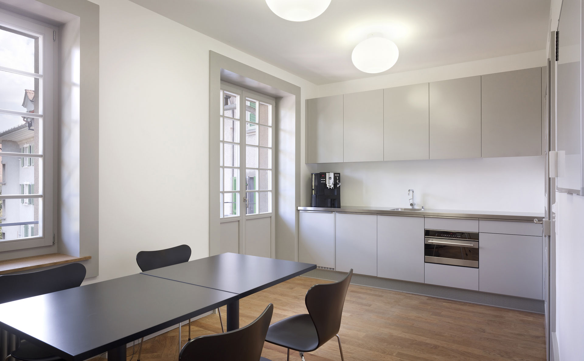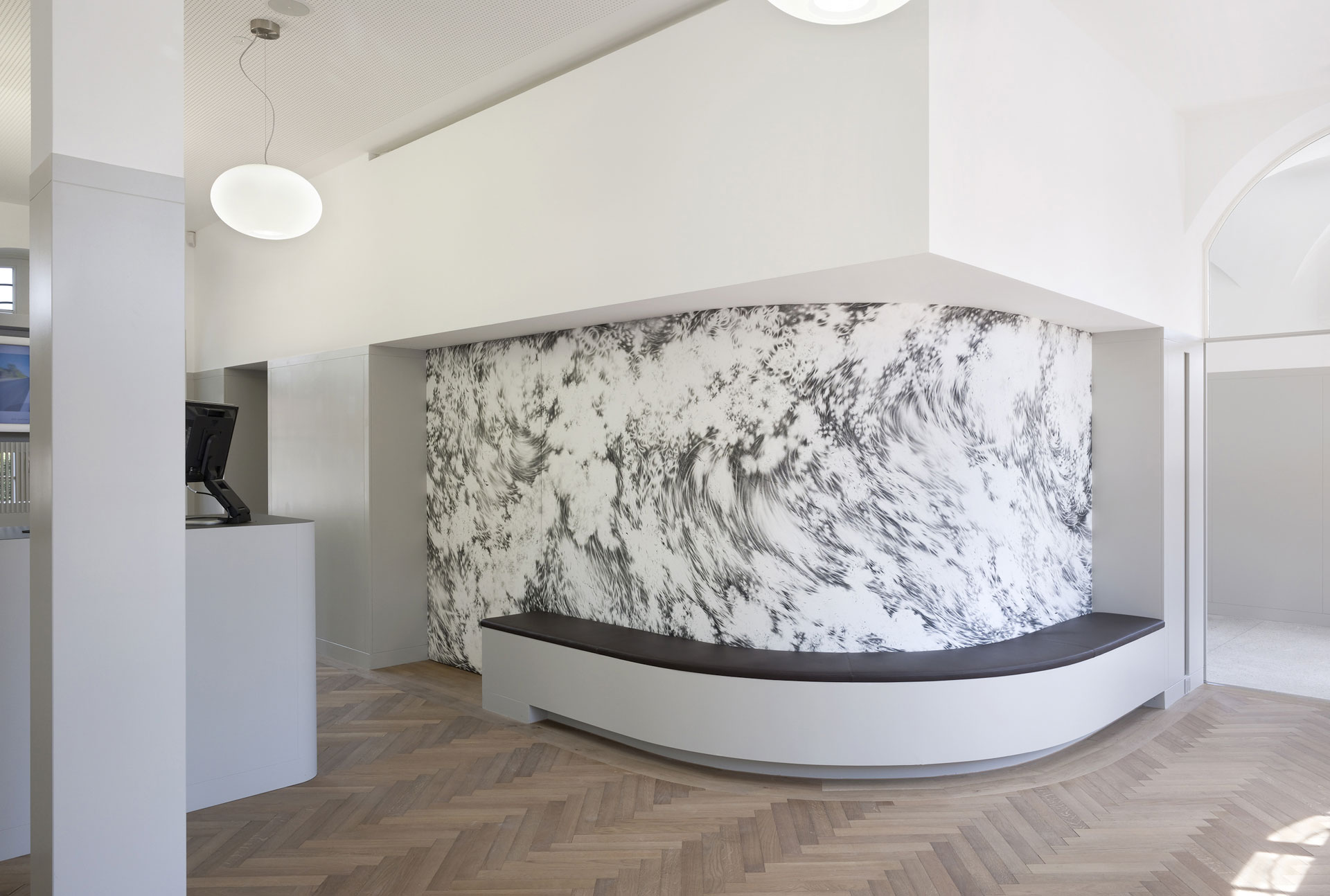Zur Realisierung einer einladenden, transparenten Bankfiliale im geschützten Massivbau wurde hier das klassische Gestaltungsprinzip von raumverbindenden Alignements der Öffnungen beibehalten und weiterentwickelt. Mit dem Einführen einer konstanten, die Räume verbindenden Horizontlinie, wurde das Prinzip der abgeschlossenen Kammern im Erdgeschoss überwunden. Das historisch verwurzelte Gestaltungselement des Brusttäfers entwickelt so in der dritten Dimension eine verbindende Offenheit.