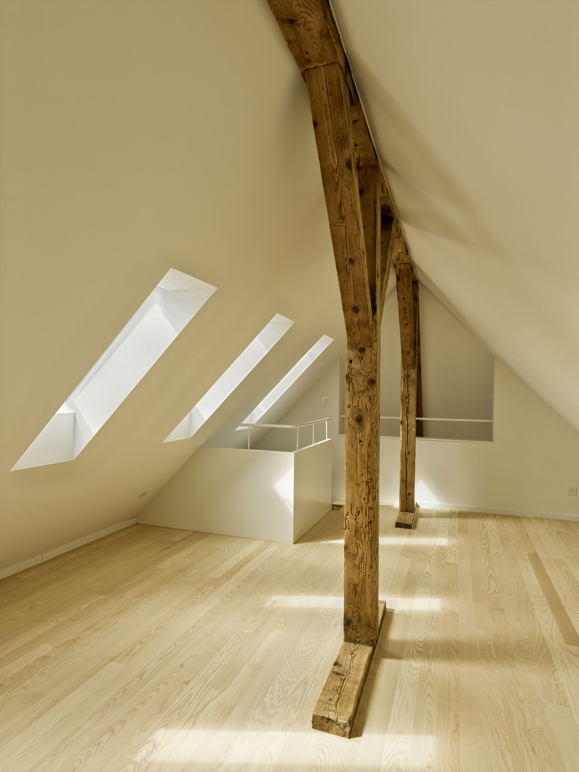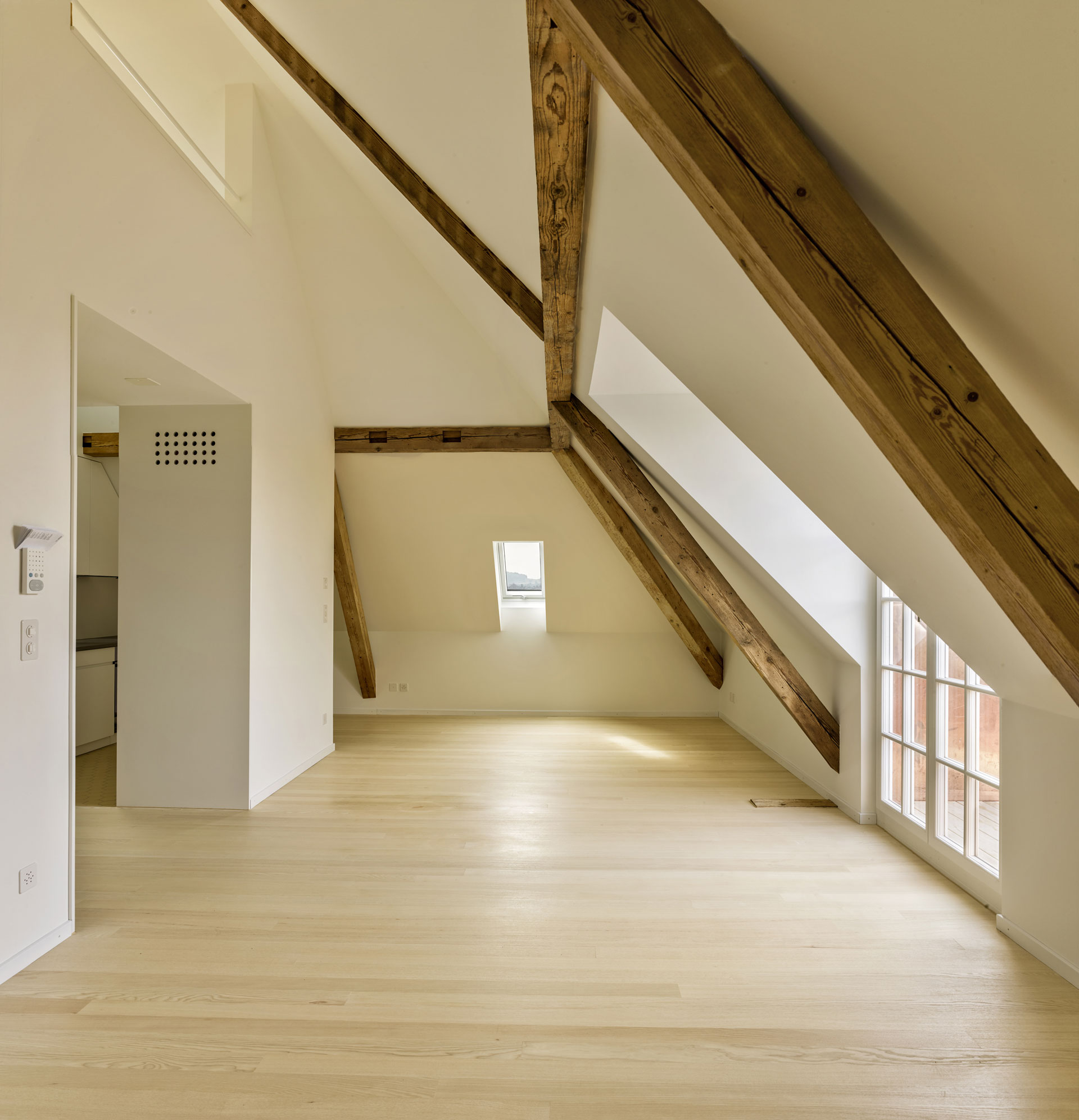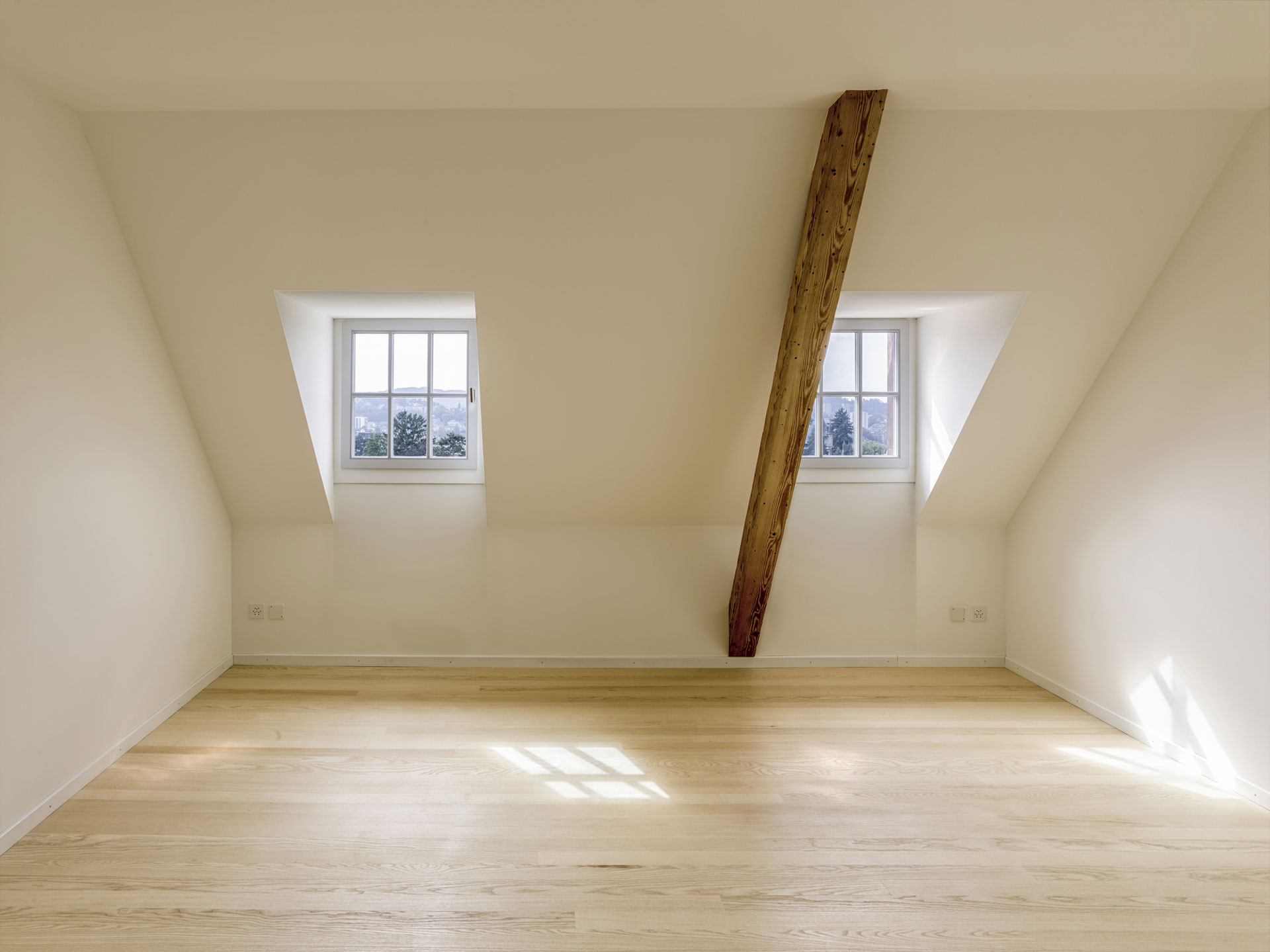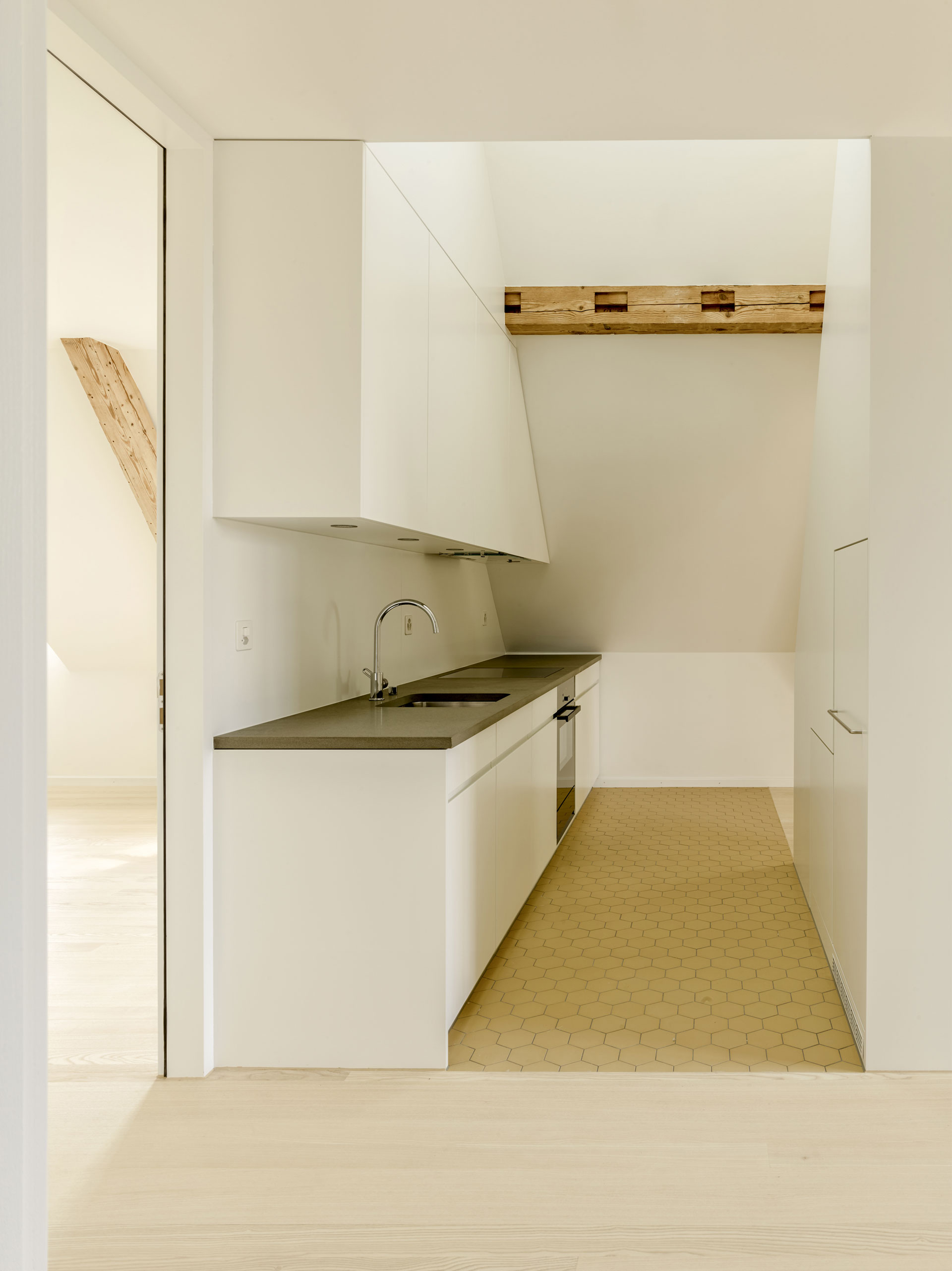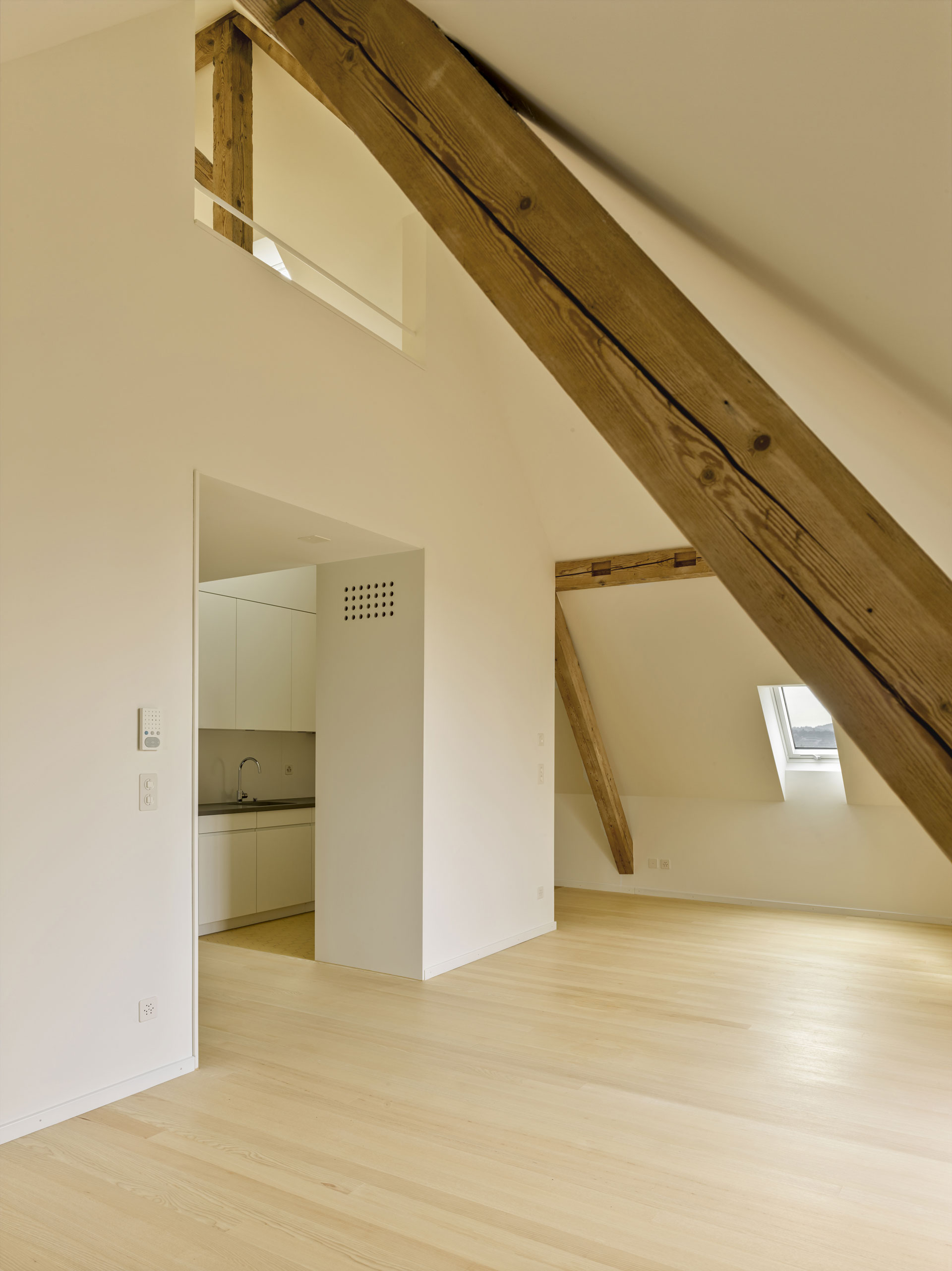 Die bestehenden Wohnungen werden sorgfältig restauriert und im Sanitärbereich zurückhaltend erneuert. Im Mansardtgeschoss wird das Mehrfamilienhaus mit einer neuen Dachwohnung erweitert. Hier nehmen die Materialien Bezug auf den Bestand der unteren Geschosse, formal werden situationsbedingt aber neue Wege beschritten.