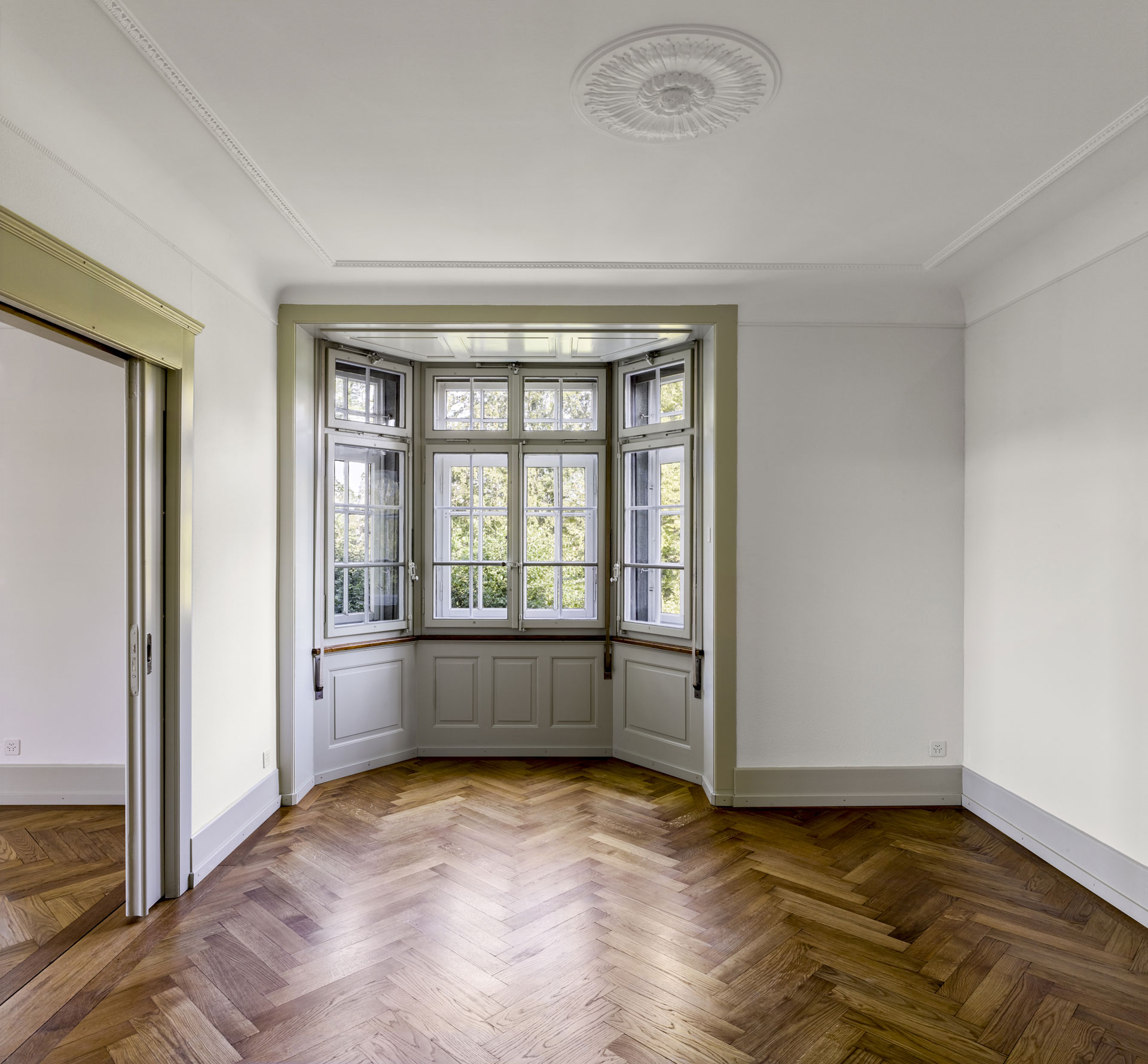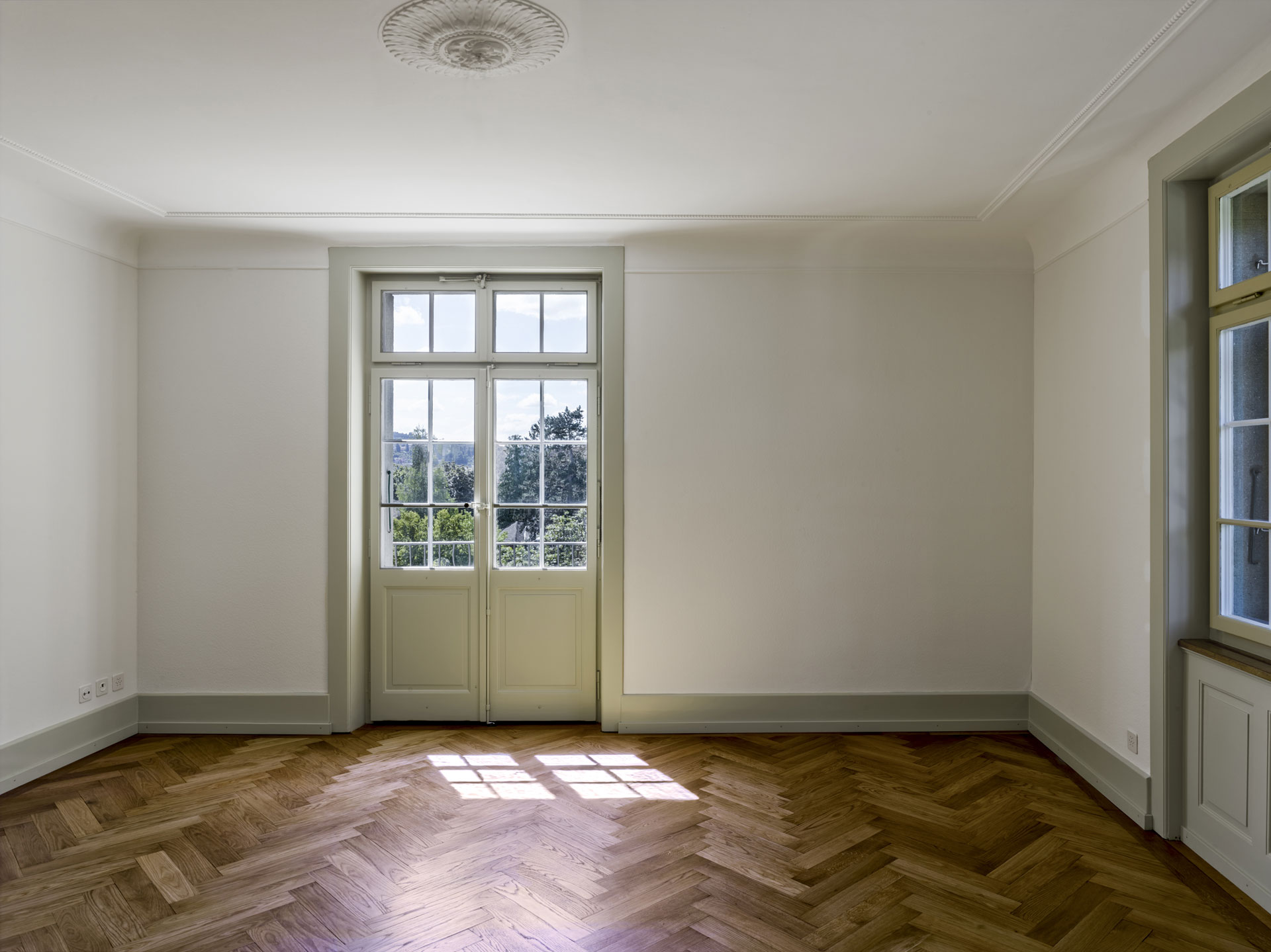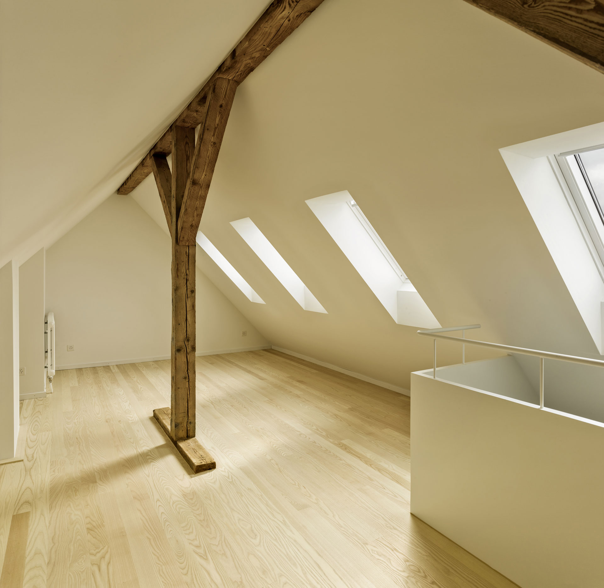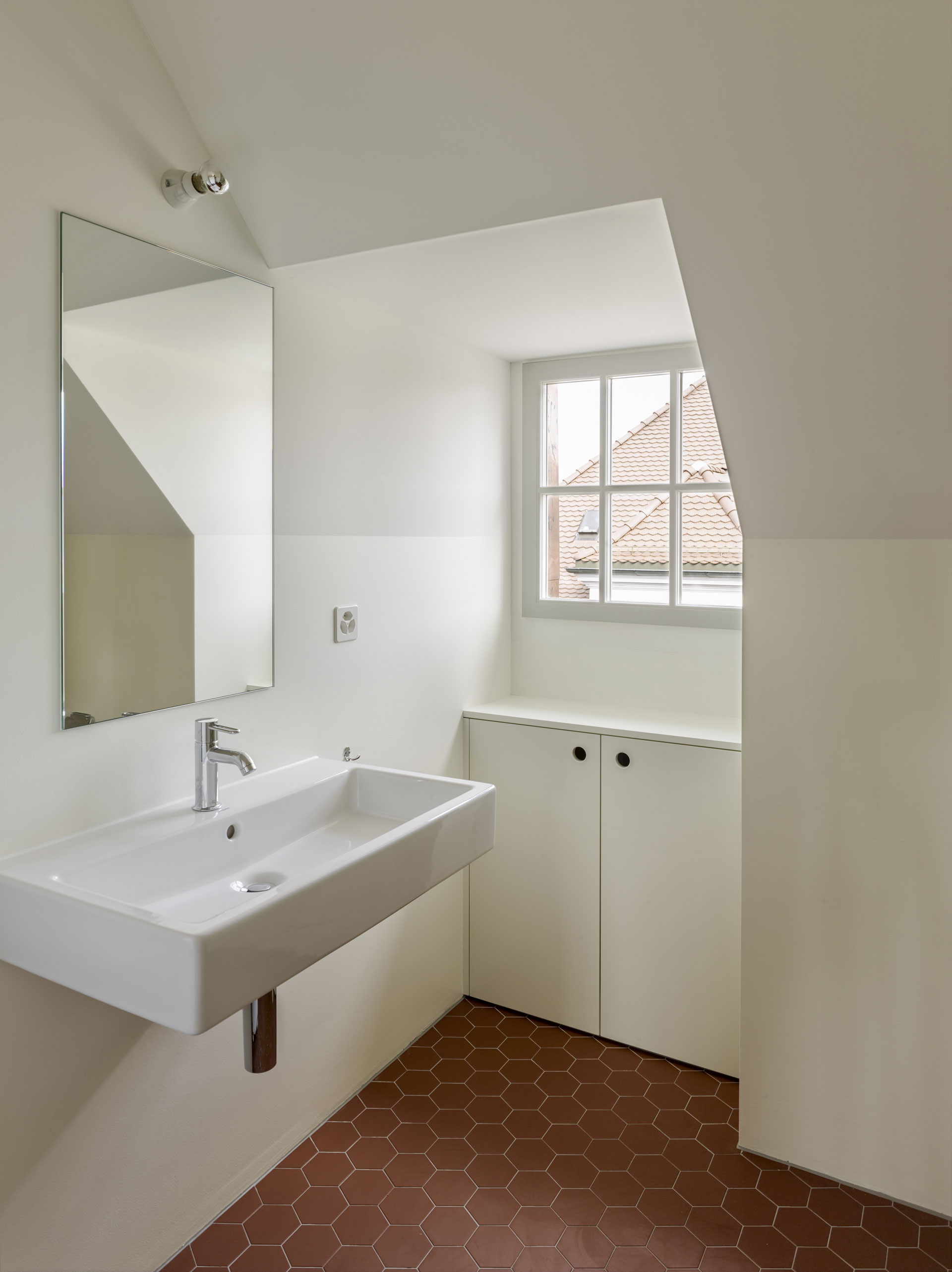 Die bestehenden Wohnungen werden sorgfältig restauriert und im Sanitärbereich zurückhaltend erneuert. Im Mansardtgeschoss wird das Mehrfamilienhaus mit einer neuen Dachwohnung erweitert. Hier nehmen die Materialien Bezug auf den Bestand der unteren Geschosse, formal werden situationsbedingt aber neue Wege beschritten.