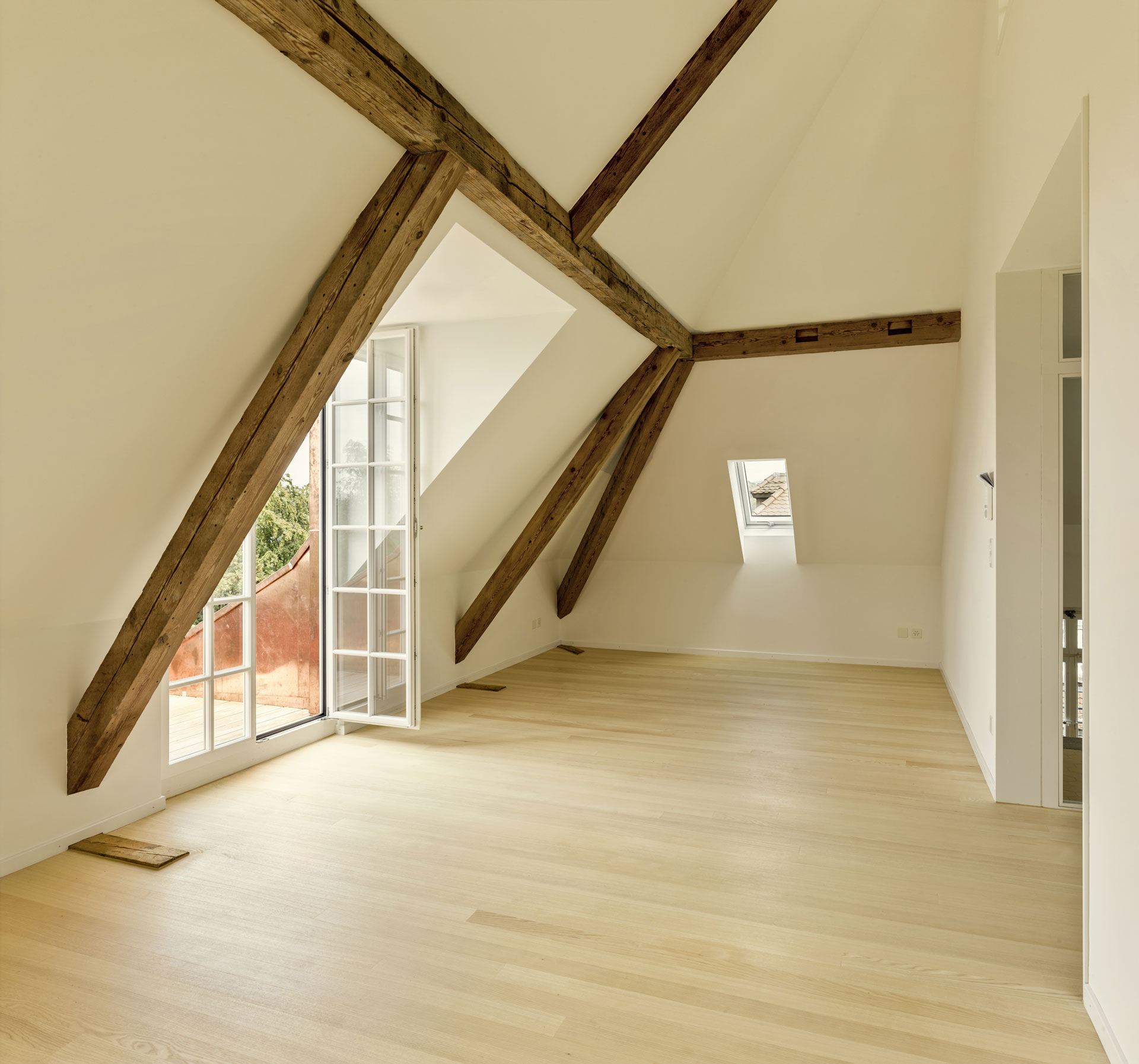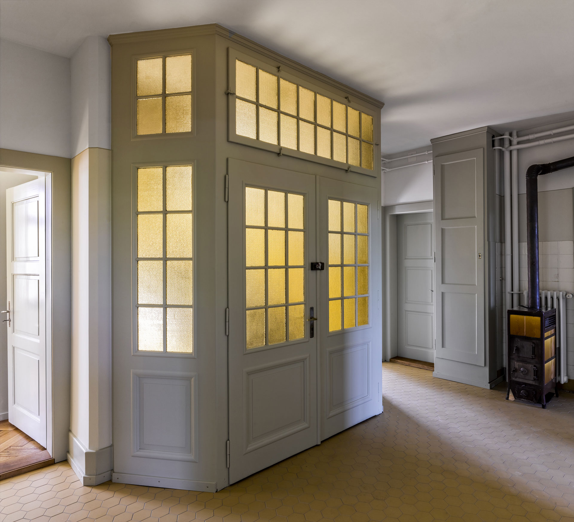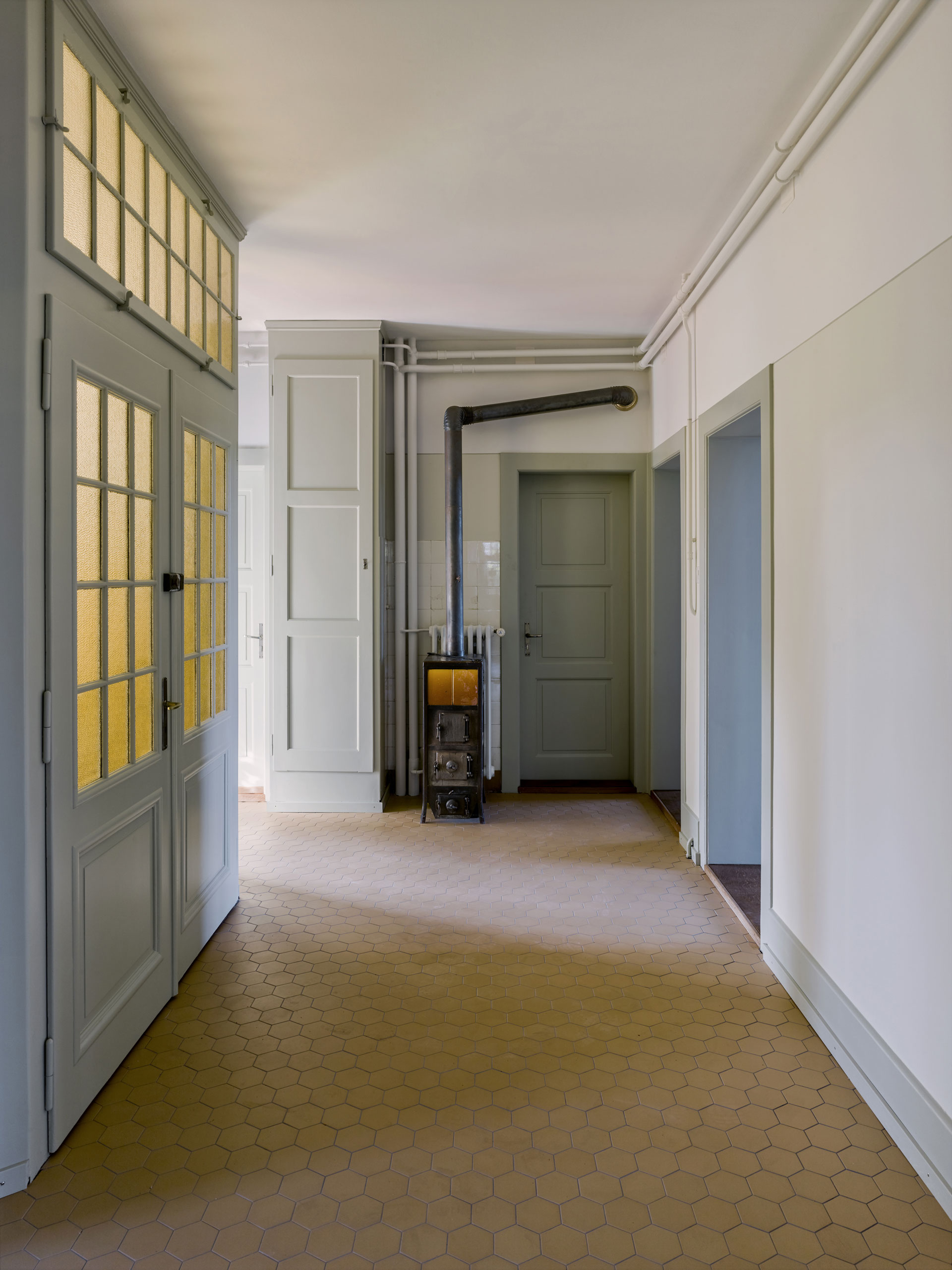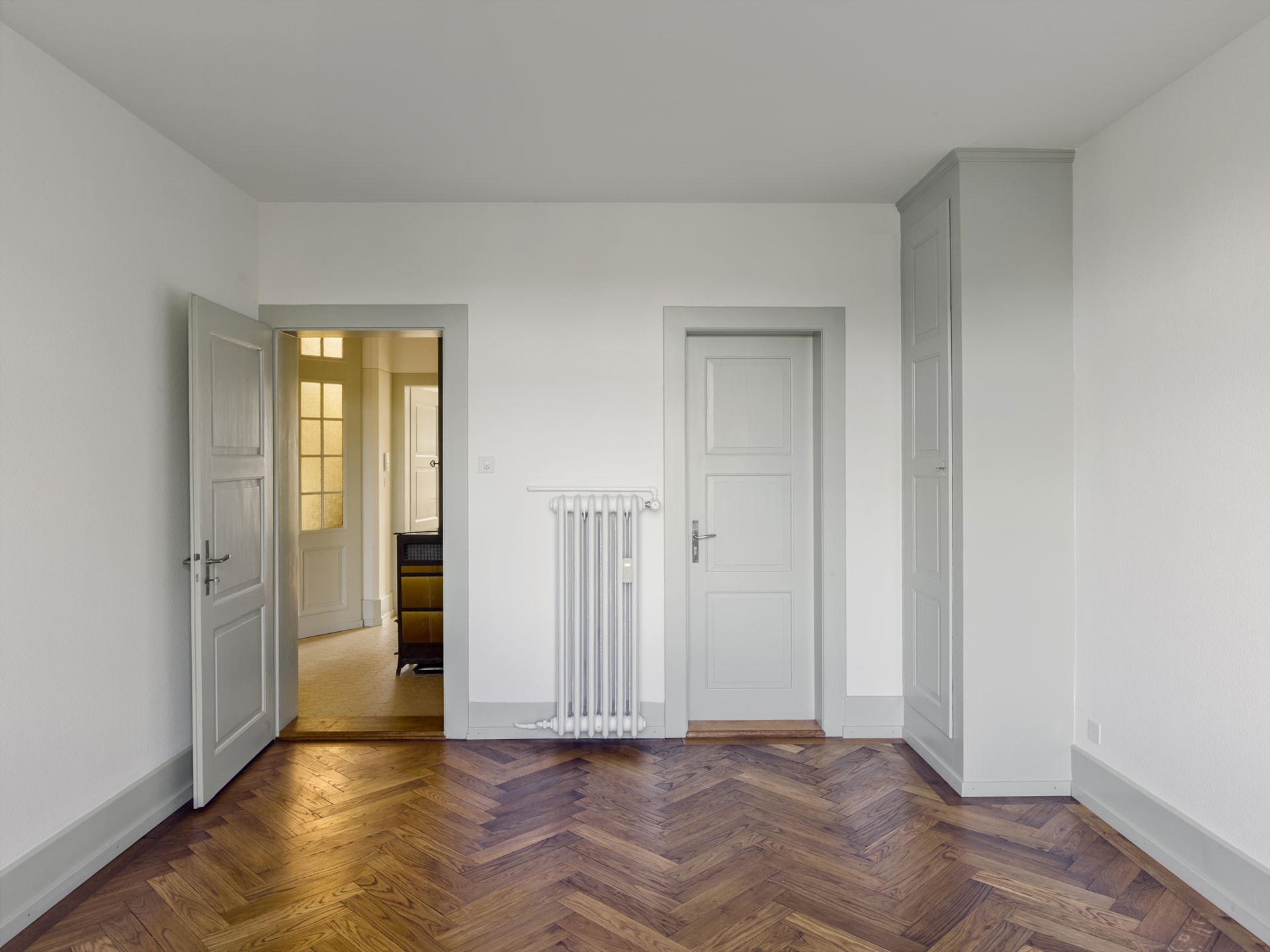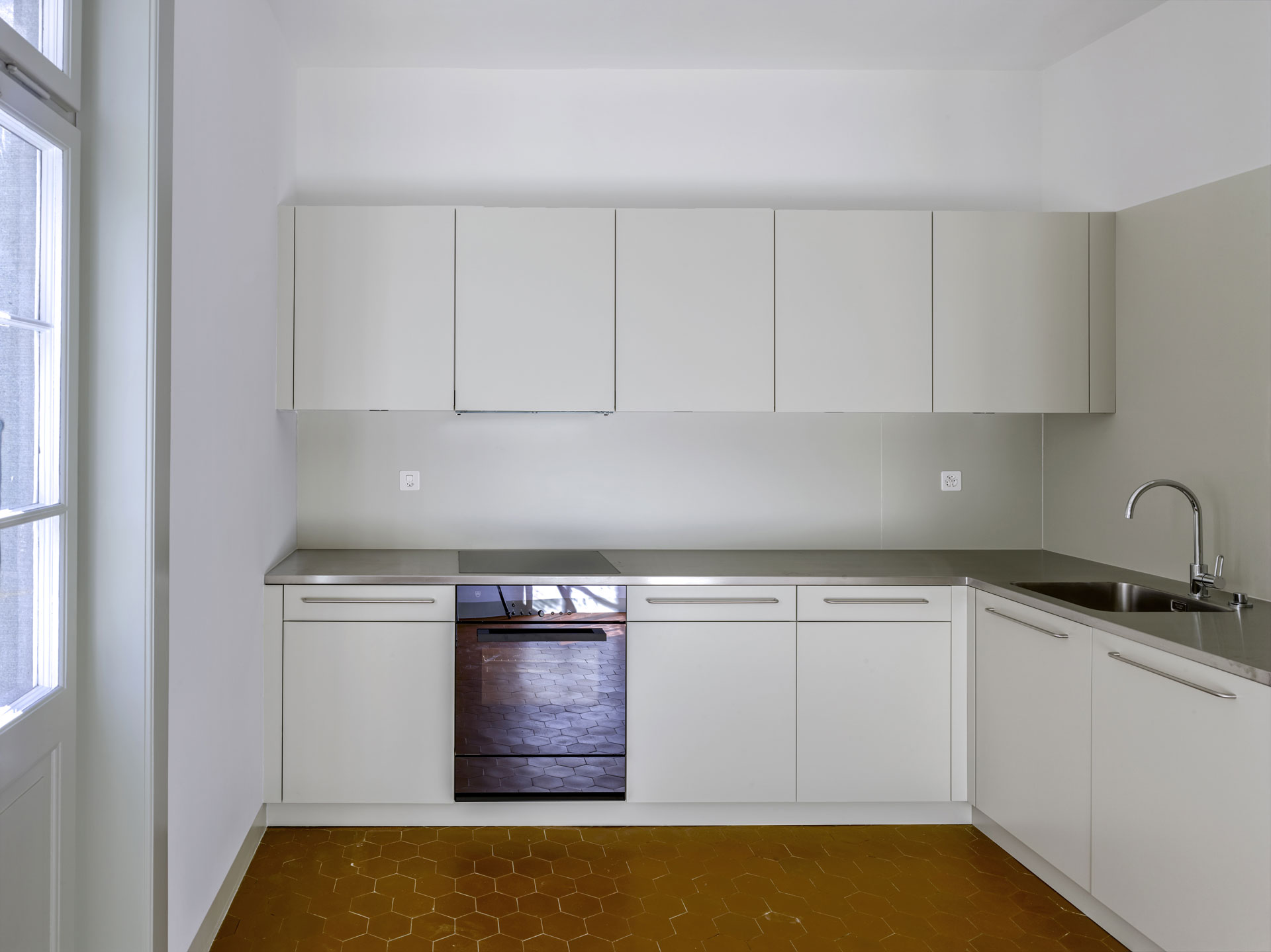 Die bestehenden Wohnungen werden sorgfältig restauriert und im Sanitärbereich zurückhaltend erneuert. Im Mansardtgeschoss wird das Mehrfamilienhaus mit einer neuen Dachwohnung erweitert. Hier nehmen die Materialien Bezug auf den Bestand der unteren Geschosse, formal werden situationsbedingt aber neue Wege beschritten.