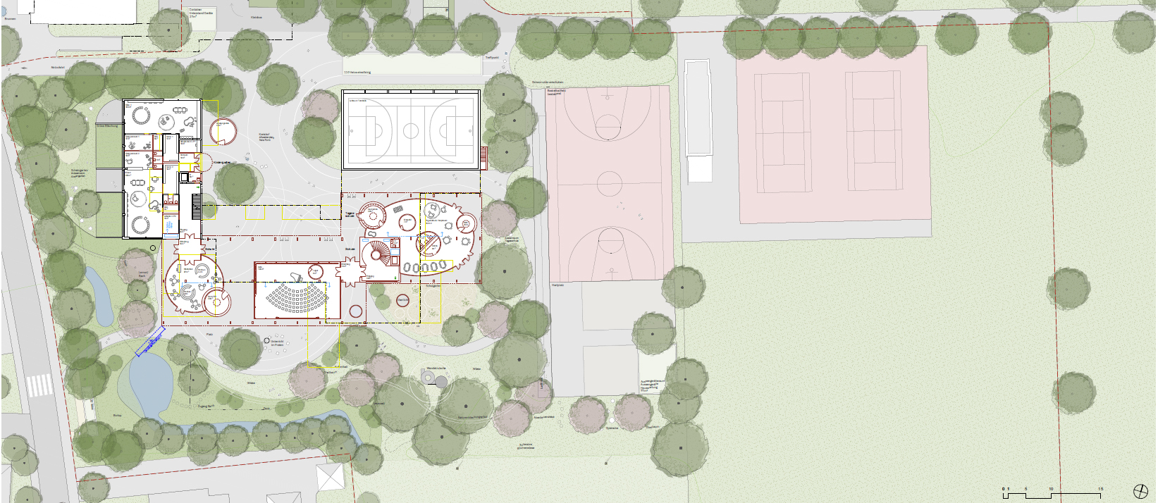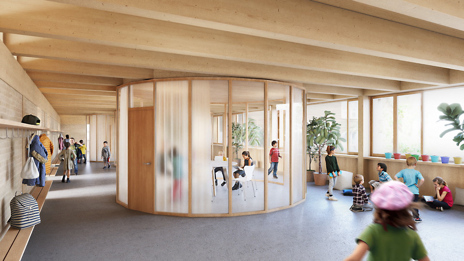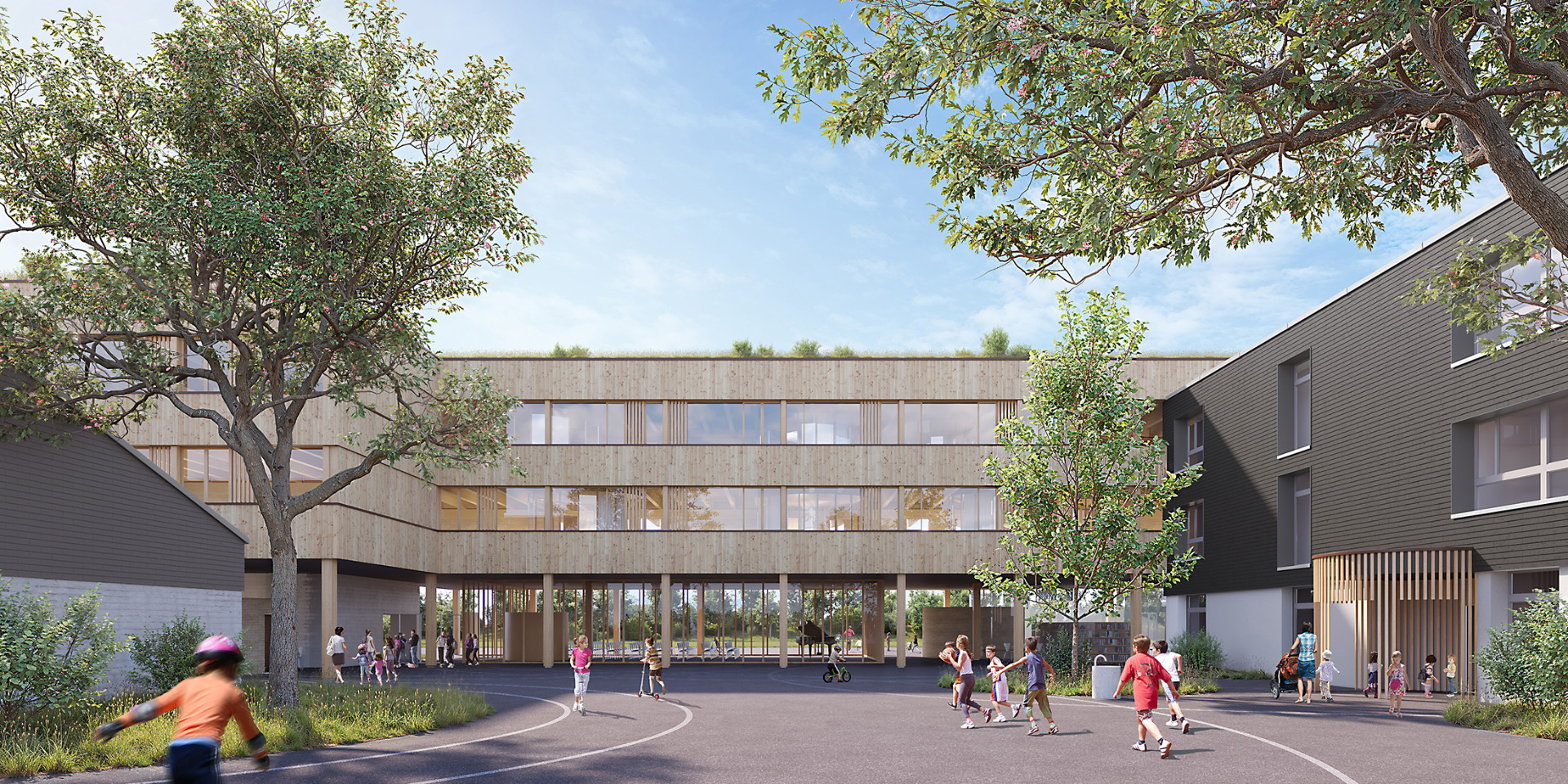 Das offene Erdgeschoss stärkt durch seine Durchlässigkeit die aussenräumlichen Verbindungen und verleiht der Schule eine klare Identität als vielfältige Lernlandschaft. Publikumsorientierte Nutzungen wie Aula und Bibliothek sind im Erdgeschoss angeordnet. Die runde Formsprache sowie die transparente Materialisierung fördern attraktive Durchwegungen und erzeugen eine positive Ausstrahlung. Innen- und Aussenräume unterstützen das pädagogische Konzept und schaffen eine einladende Atmosphäre. Der Abbruch der bestehenden Anlage wird durch den Erhalt und die gezielte Aufwertung der Grünräume gerechtfertigt. Kompakte Grundrisse in den Obergeschossen ermöglichen das offene Erdgeschoss und sichern eine gute ökonomische und ökologische Gesamtbilanz.