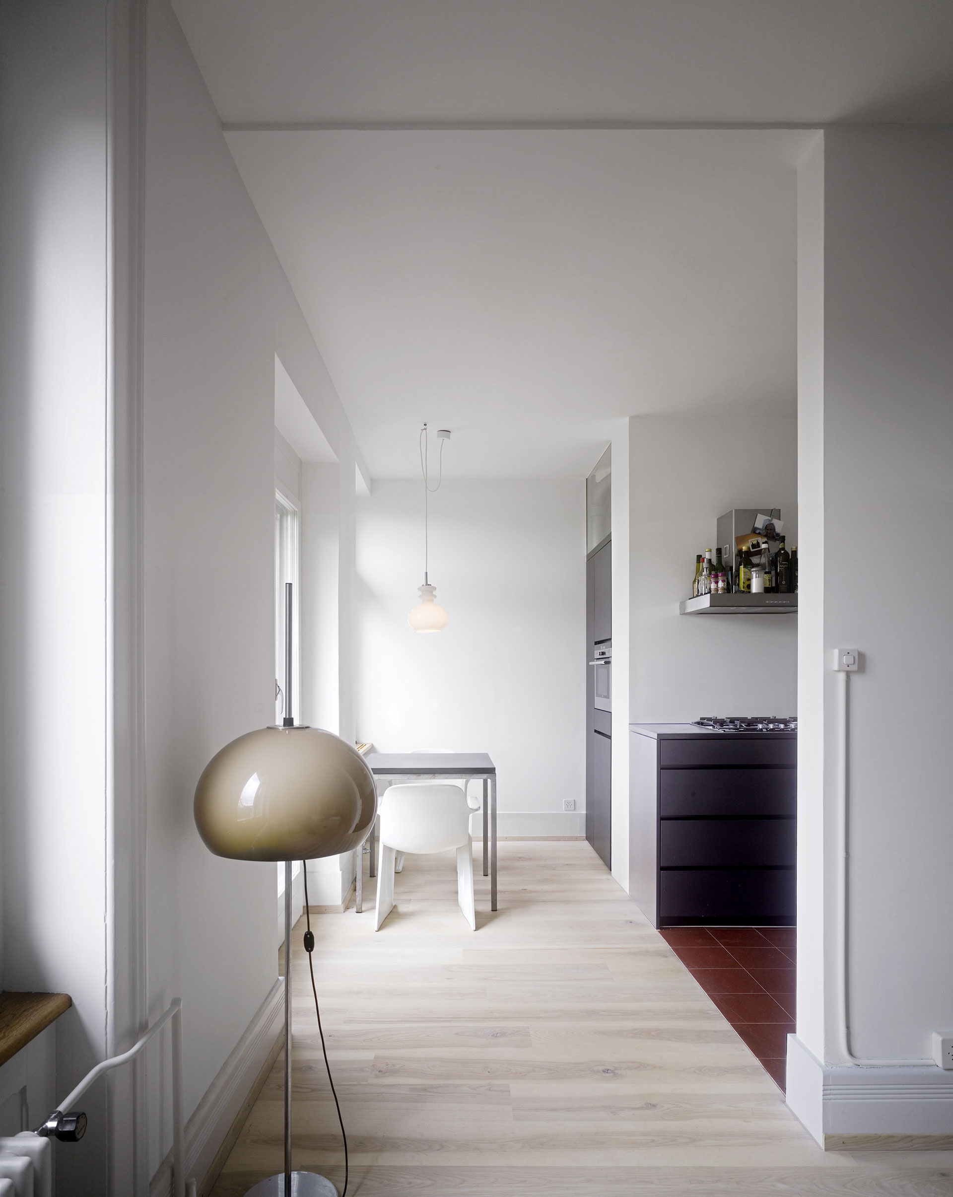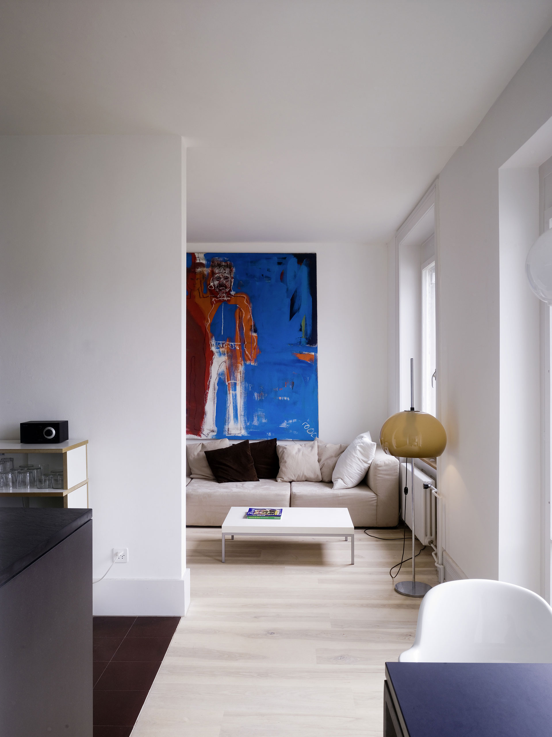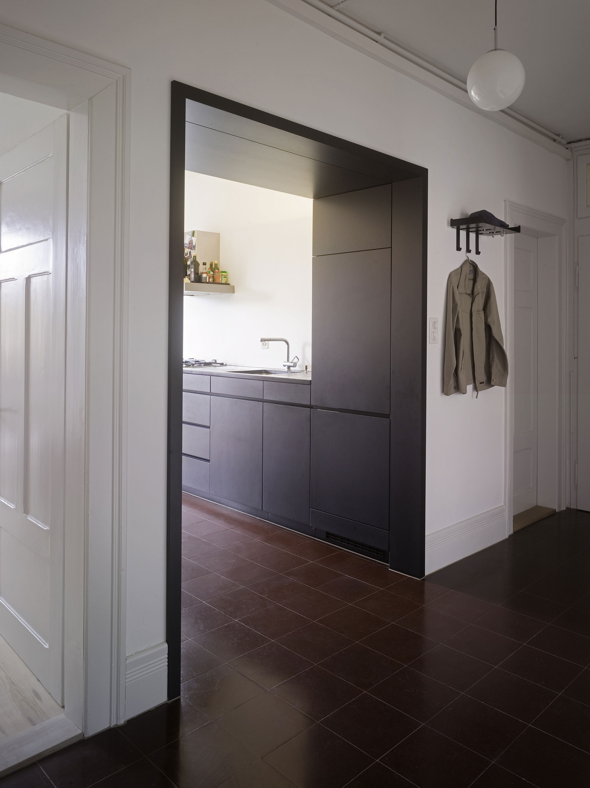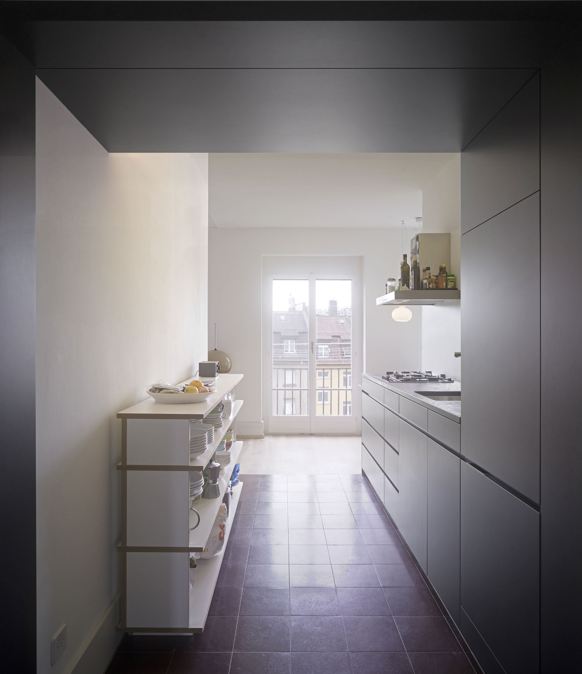 Die vorgefundene Wohnung aus dem 19. Jahrhundert ist mit ihrer Enfilade und ihrem geschickten Verstecken der Serviceräume zeittypisch geprägt. Drei präzise Ausbrüche erlauben eine Reaktion auf die aktuellen Wohnbedürfnisse ohne die bestehende Struktur zu zerstören. Die Südseite, neu als Hauptraum genutzt, erhält mit den beiden raumhohen Durchbrüchen von der Küche zum Reduit und zum südlichen Zimmer ihre gewünschte Wichtigkeit und wird, durch die Verbreiterung der Türe, zum offenen Zentrum der Wohnung.
