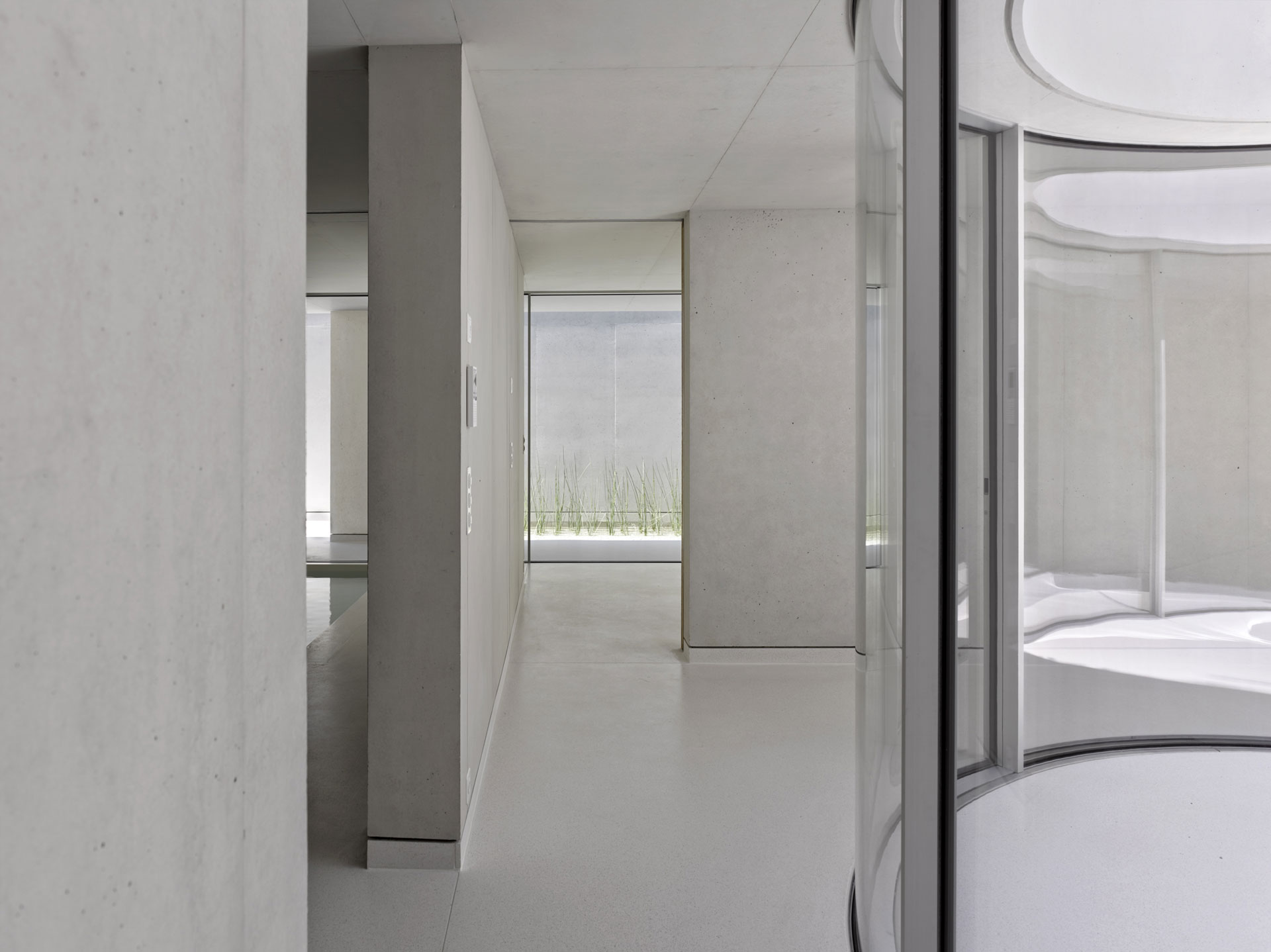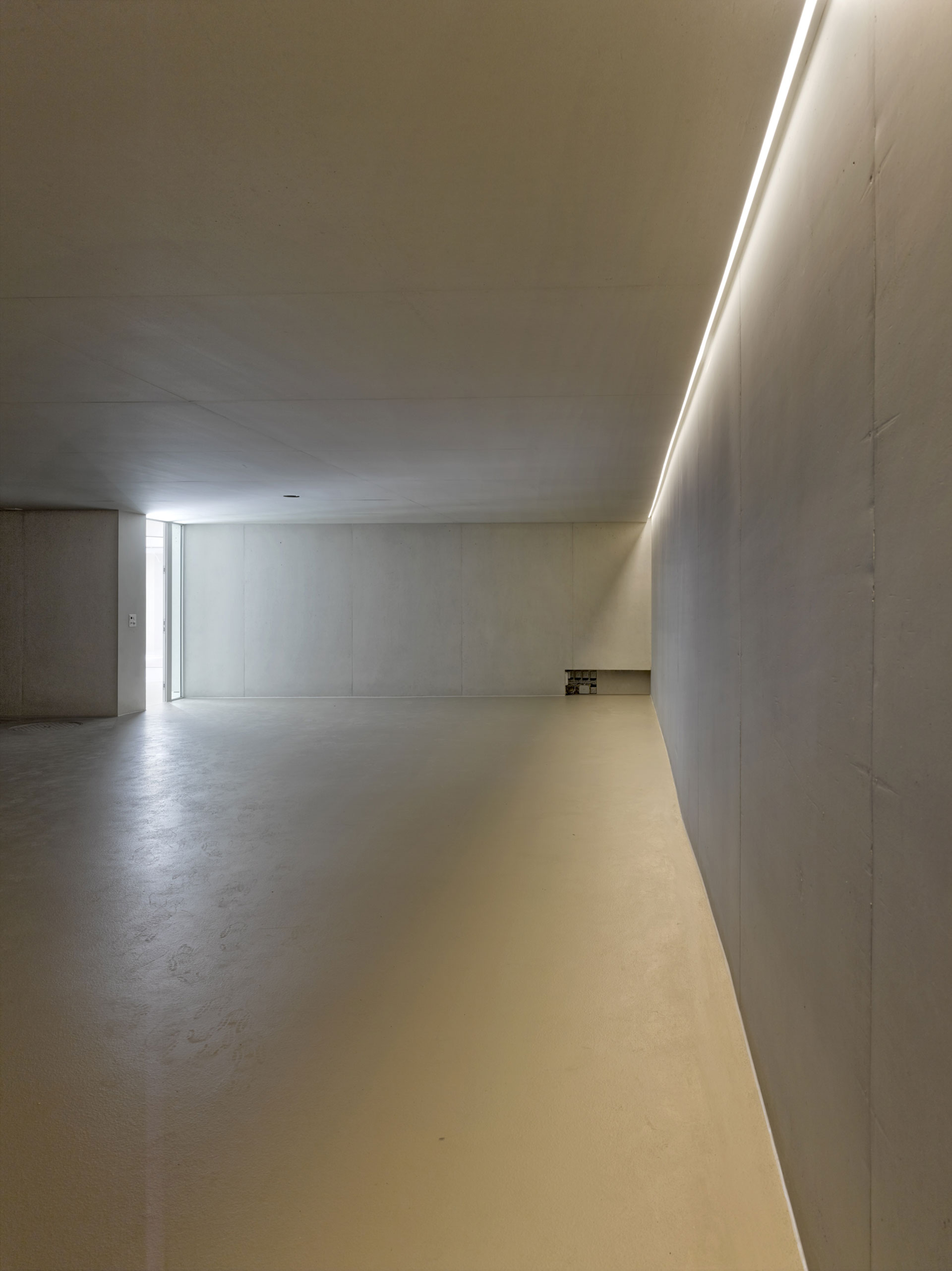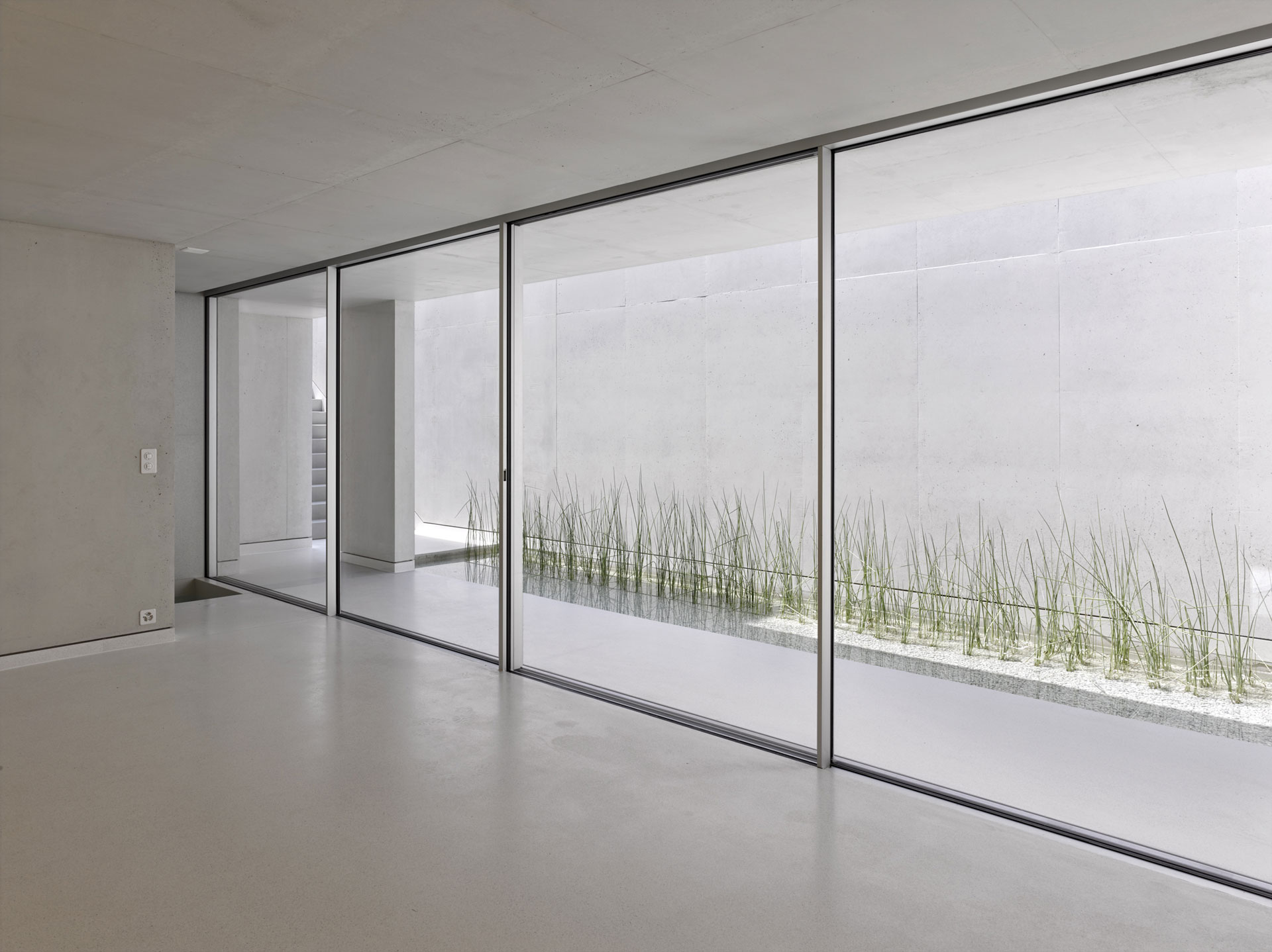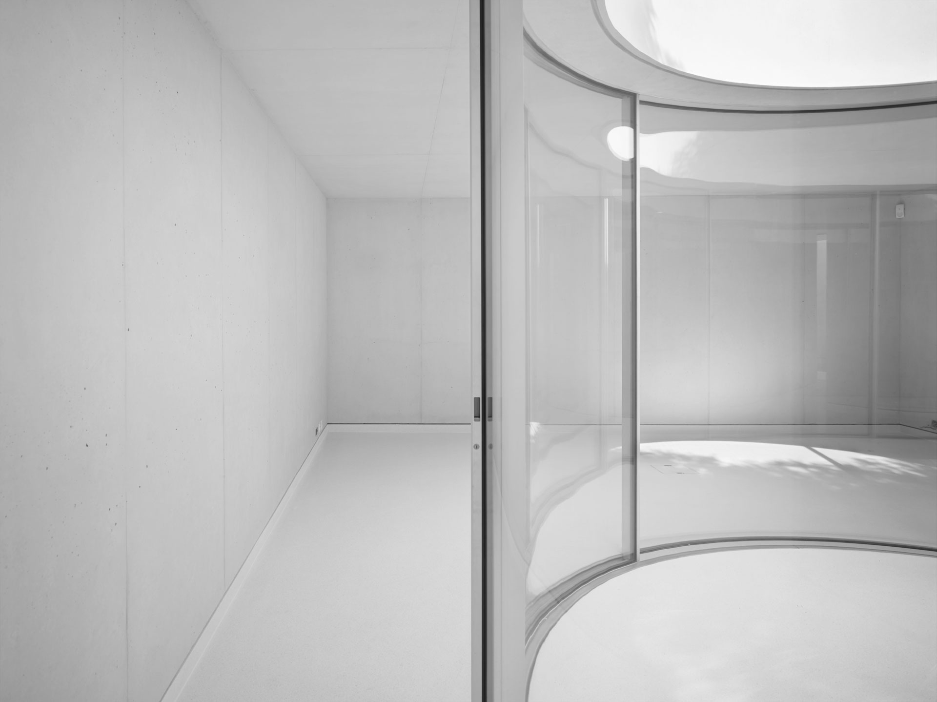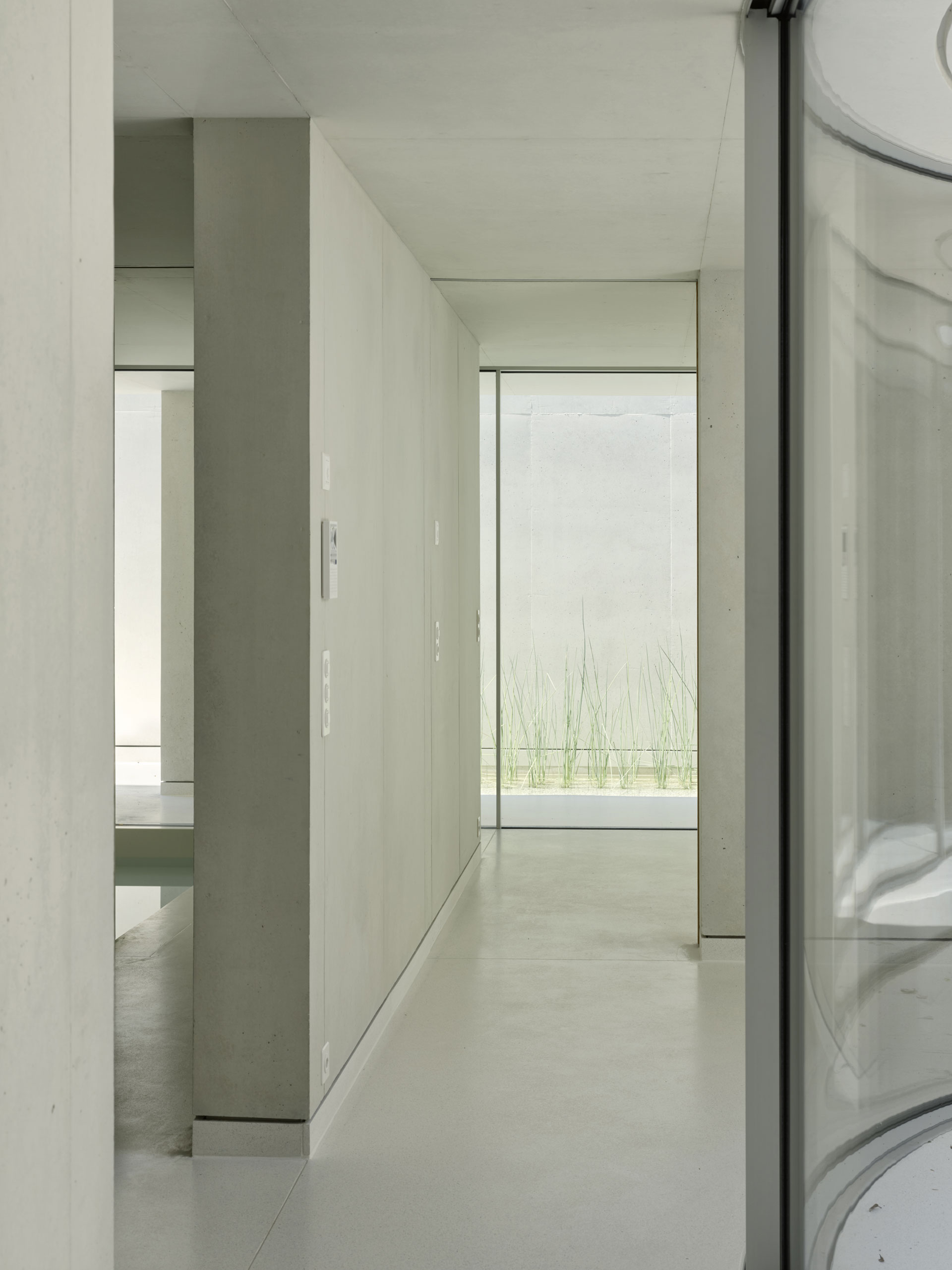 Der unterirdische Gästetrakt tangiert das bestehende Haus und seinen Garten kaum. Einzig das Impluvium, im bepflanzten Eingangsrondell versteckt, und der abgesenkte Gartenhof verbinden die neuen Räume mit dem Park und erzeugen im Innern spektakuläre Lichtstimmungen. Bezüge zu Werken unterschiedlichster Künstler verbinden den Bau auch auf kultureller Ebene mit seinem Umfeld, sei es zu den ʺsky-roomsʺ von James Turell, den Gartenpavillons von Dan Graham oder den Reflexionenspektakeln von Julio Le Parc.