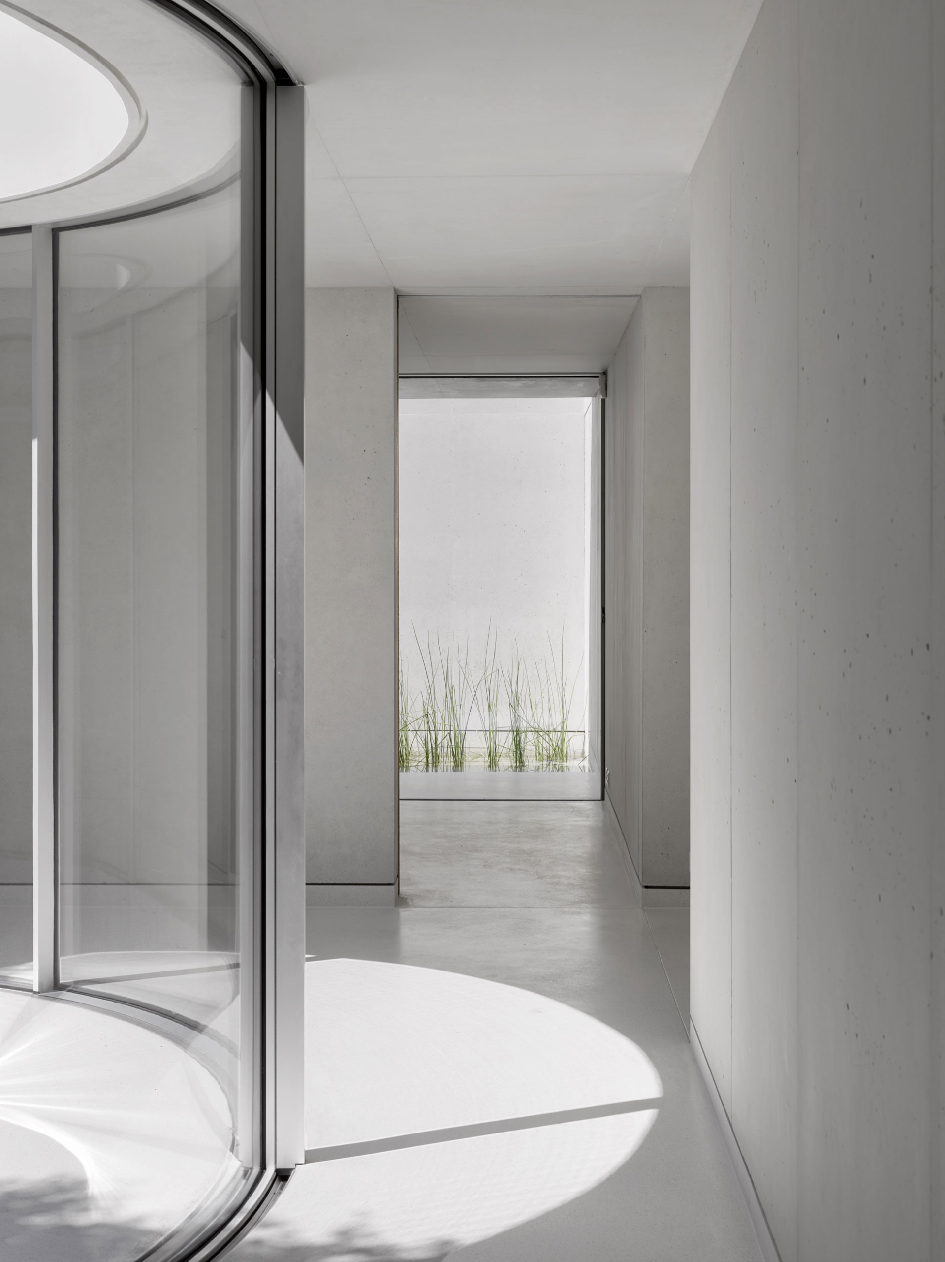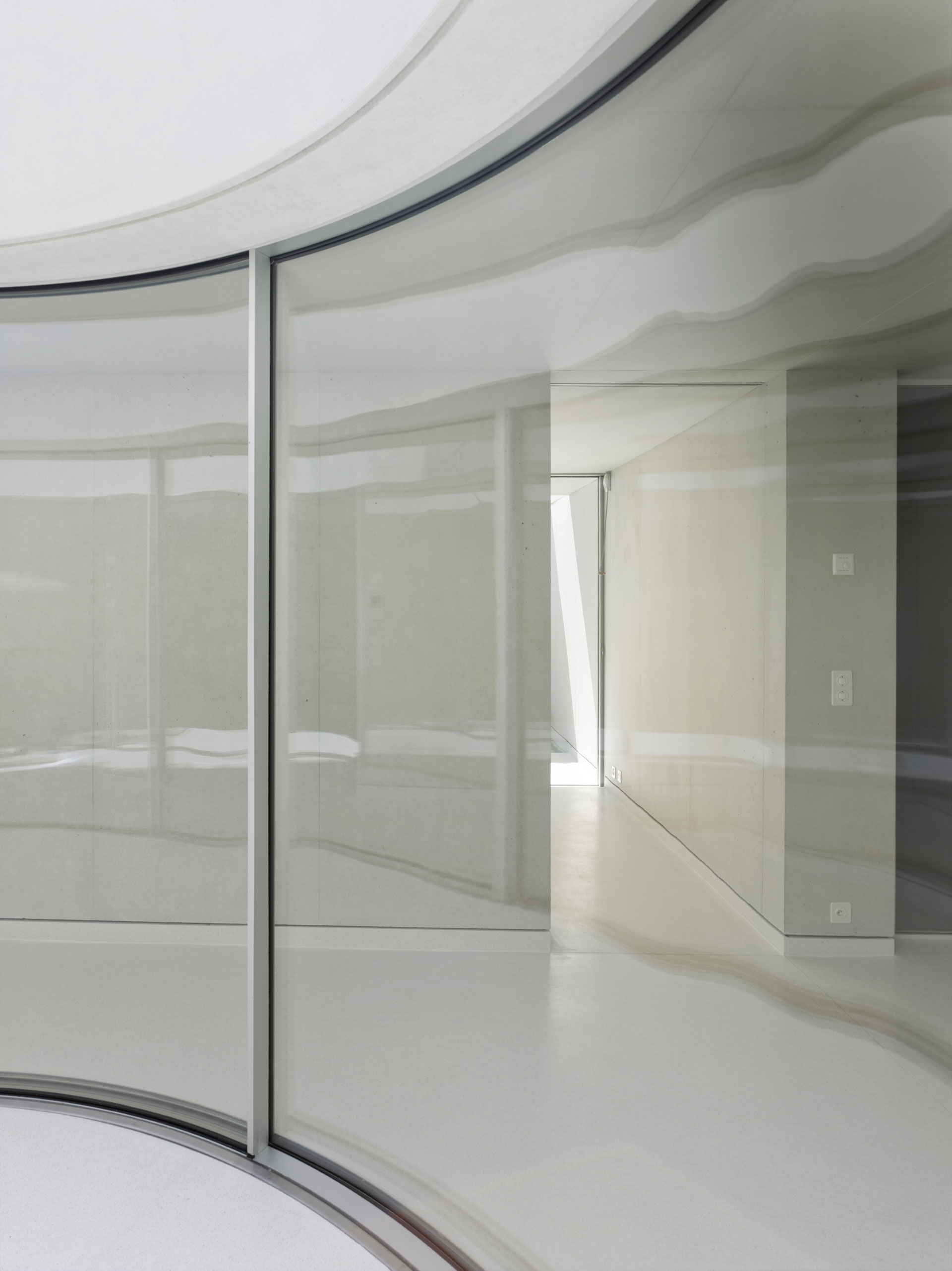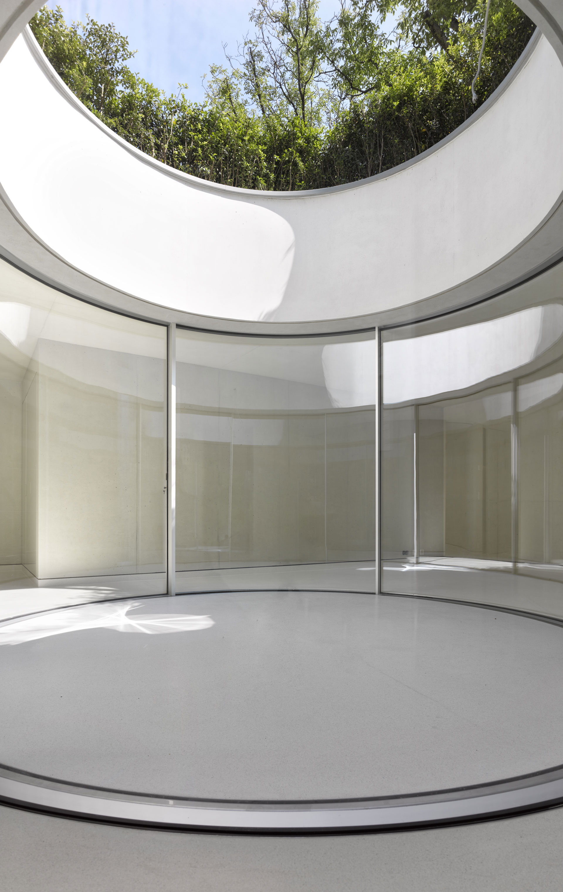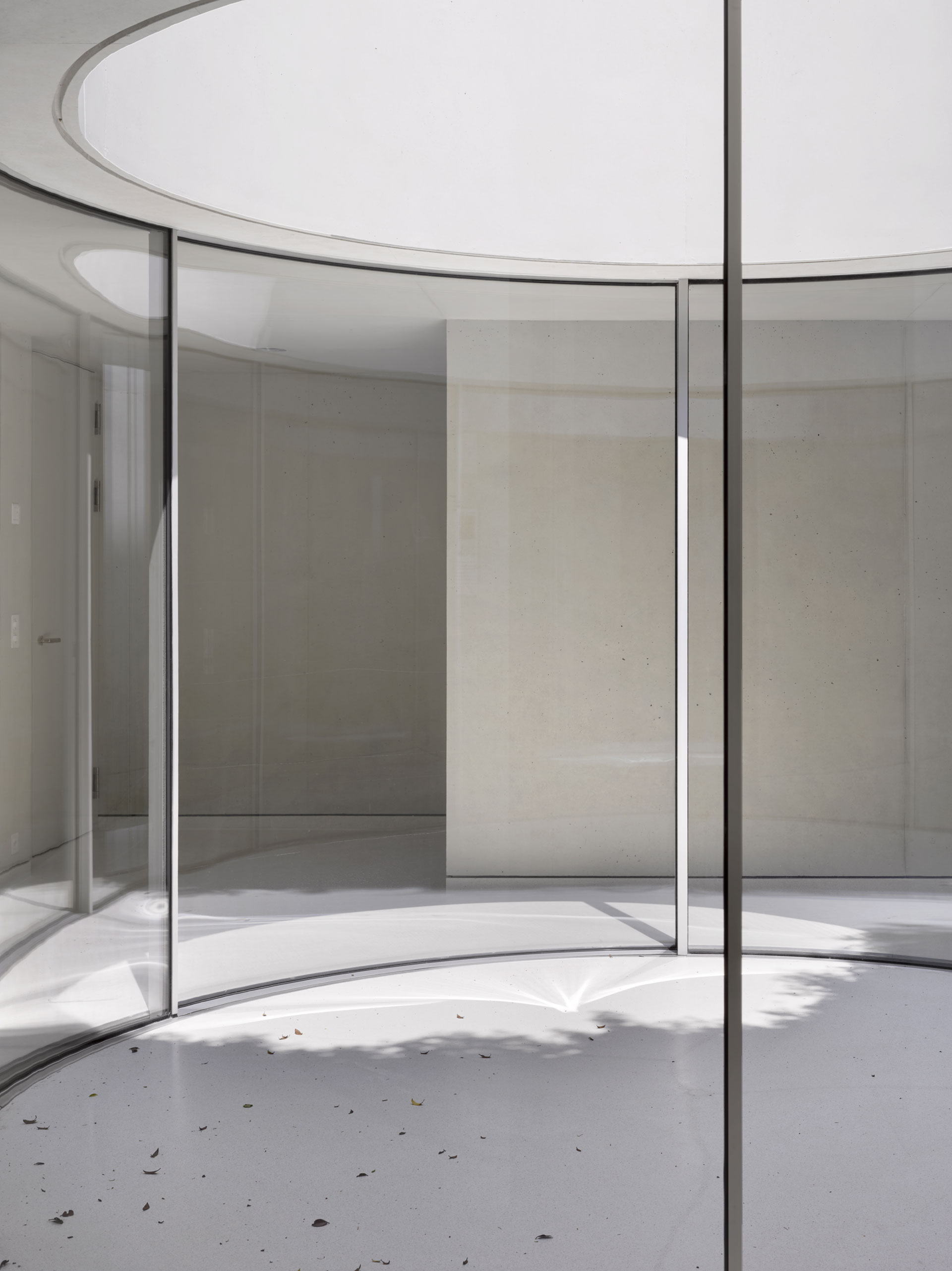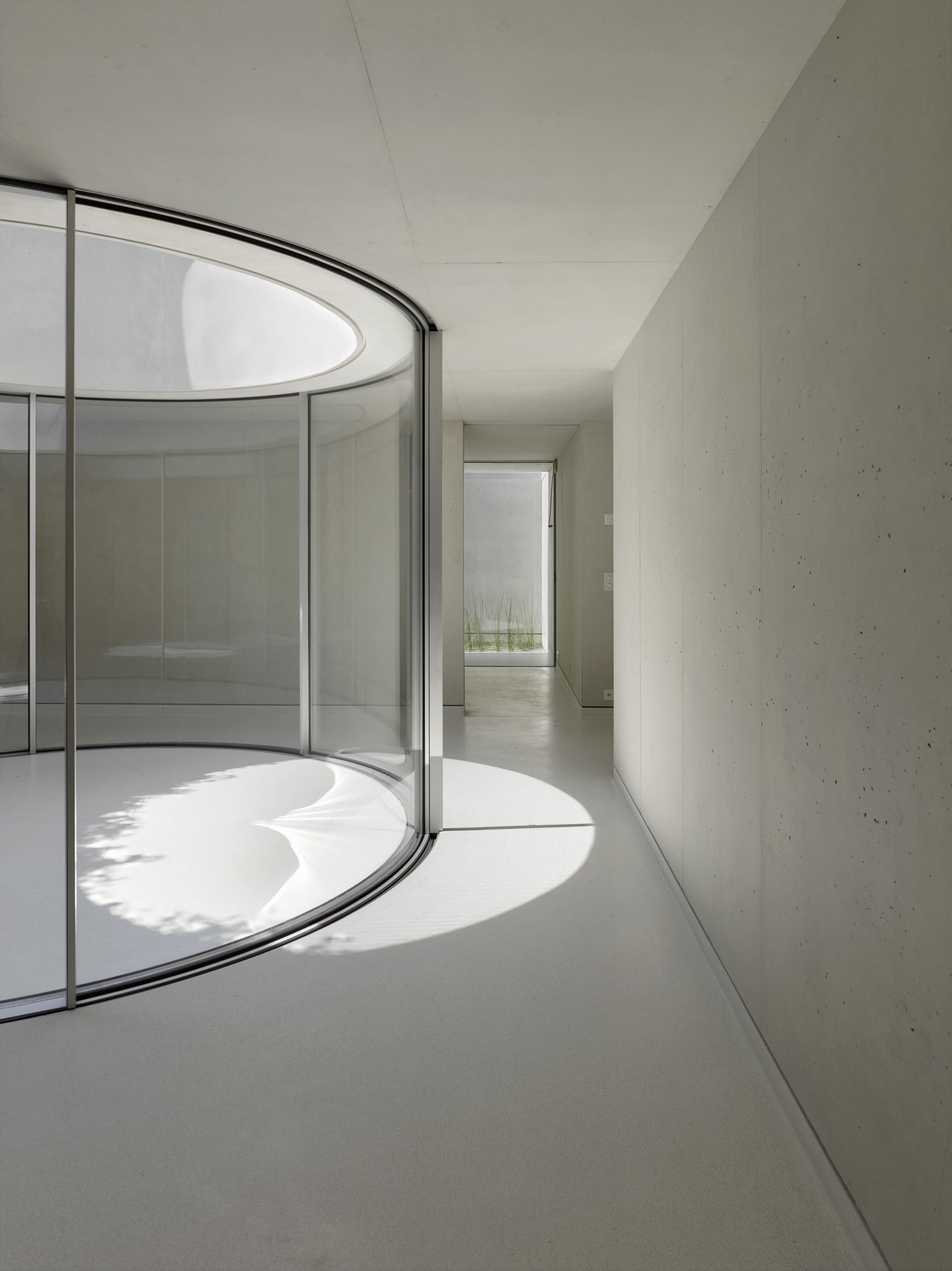 Der unterirdische Gästetrakt tangiert das bestehende Haus und seinen Garten kaum. Einzig das Impluvium, im bepflanzten Eingangsrondell versteckt, und der abgesenkte Gartenhof verbinden die neuen Räume mit dem Park und erzeugen im Innern spektakuläre Lichtstimmungen. Bezüge zu Werken unterschiedlichster Künstler verbinden den Bau auch auf kultureller Ebene mit seinem Umfeld, sei es zu den ʺsky-roomsʺ von James Turell, den Gartenpavillons von Dan Graham oder den Reflexionenspektakeln von Julio Le Parc.