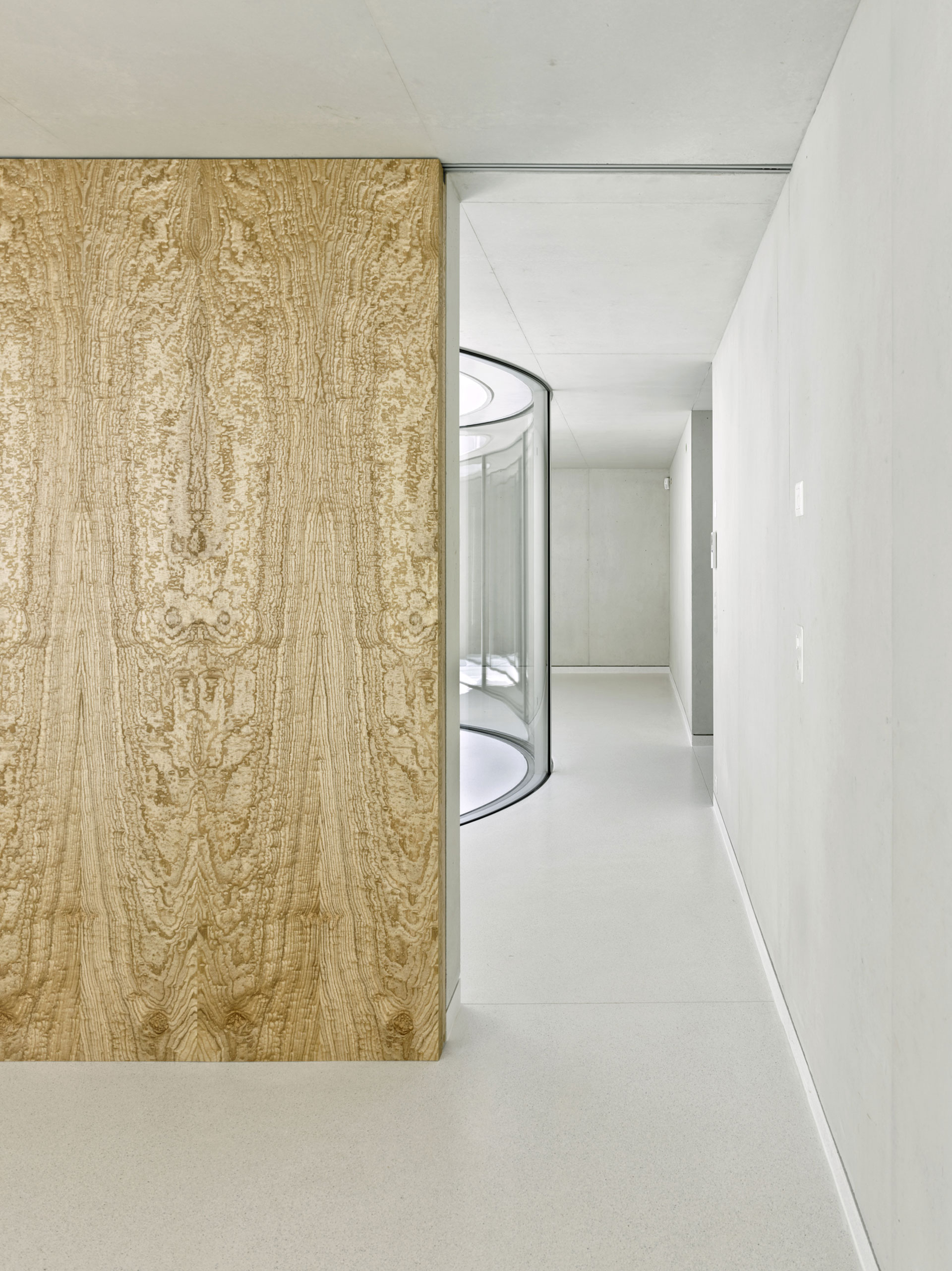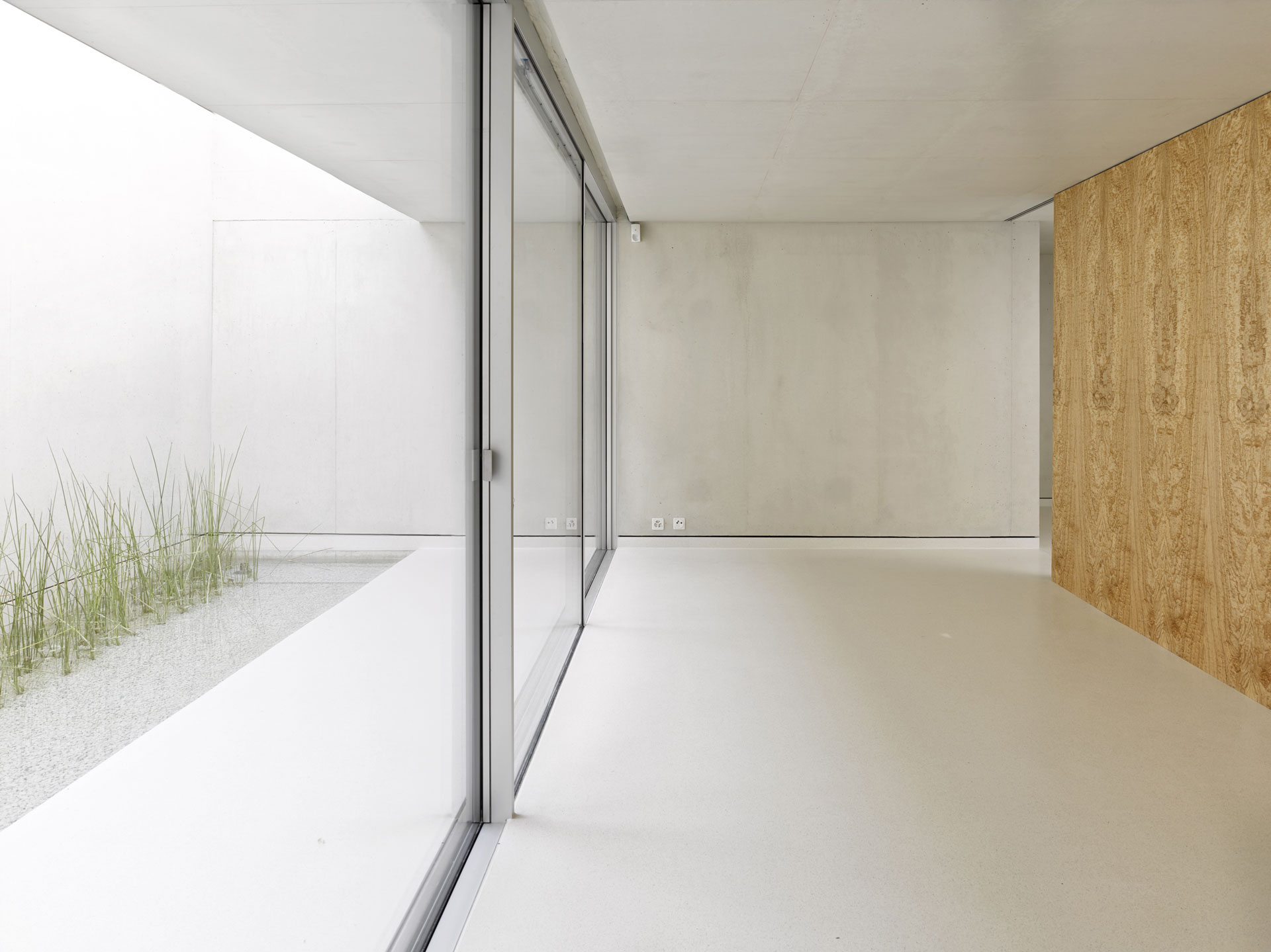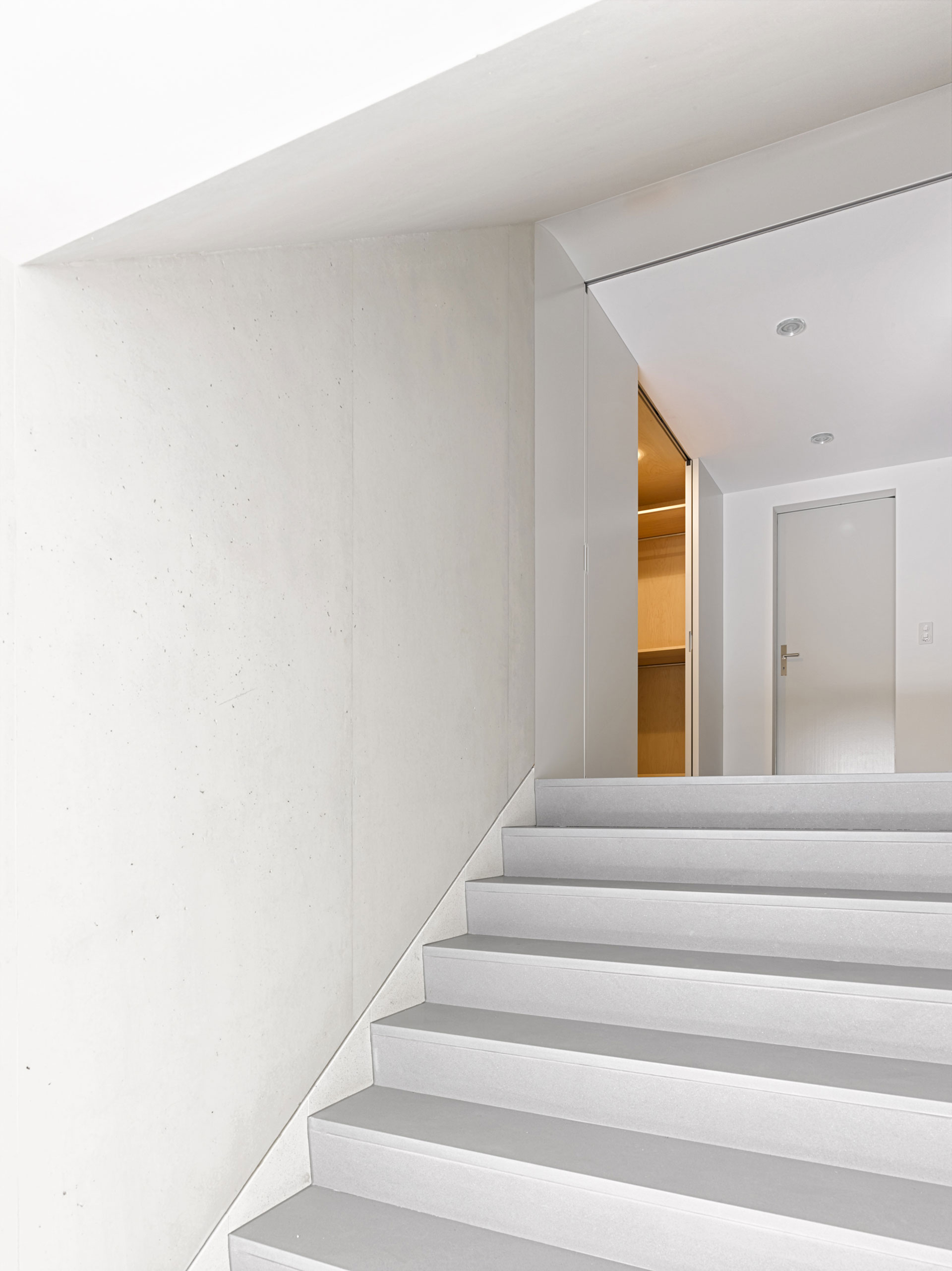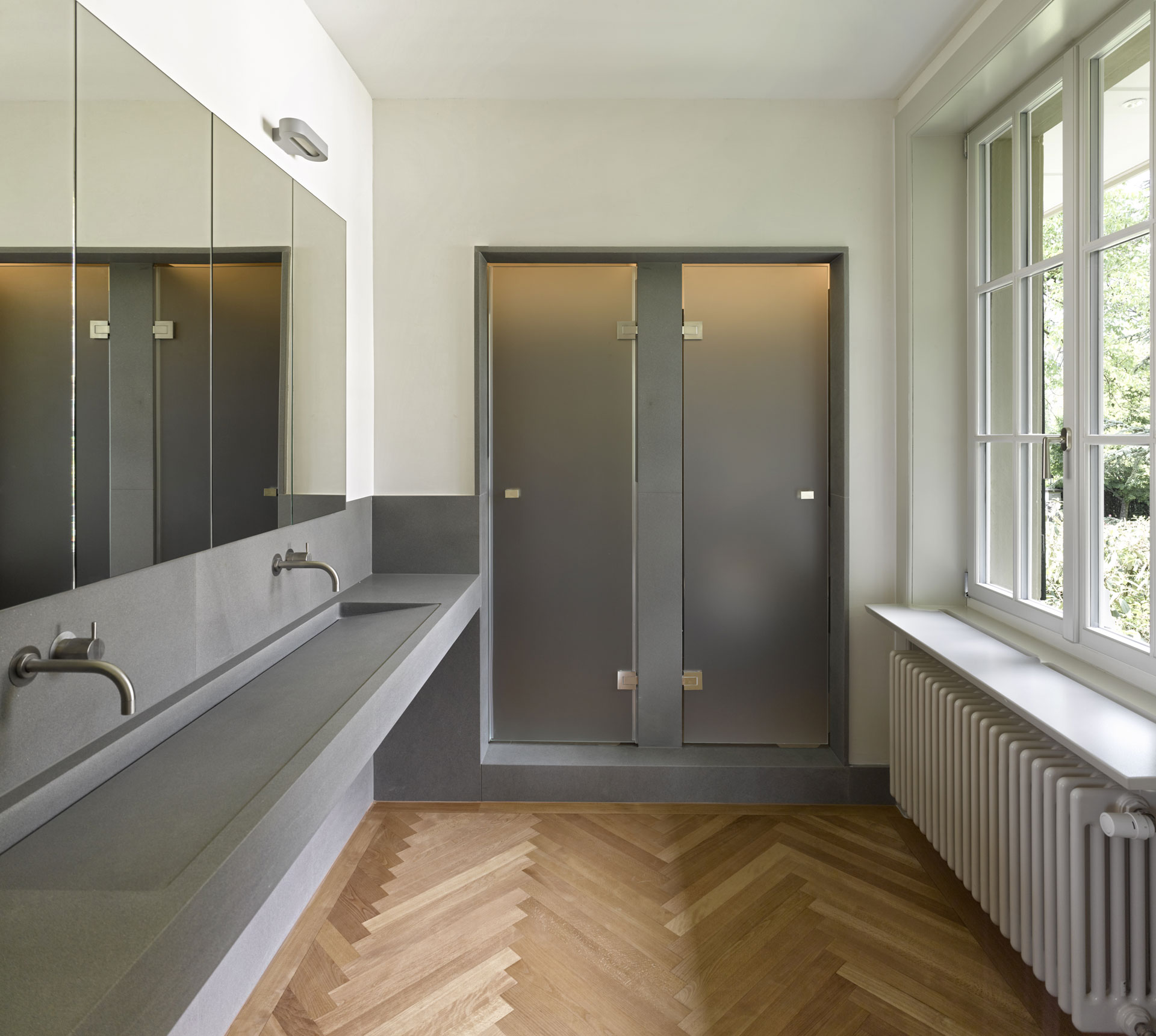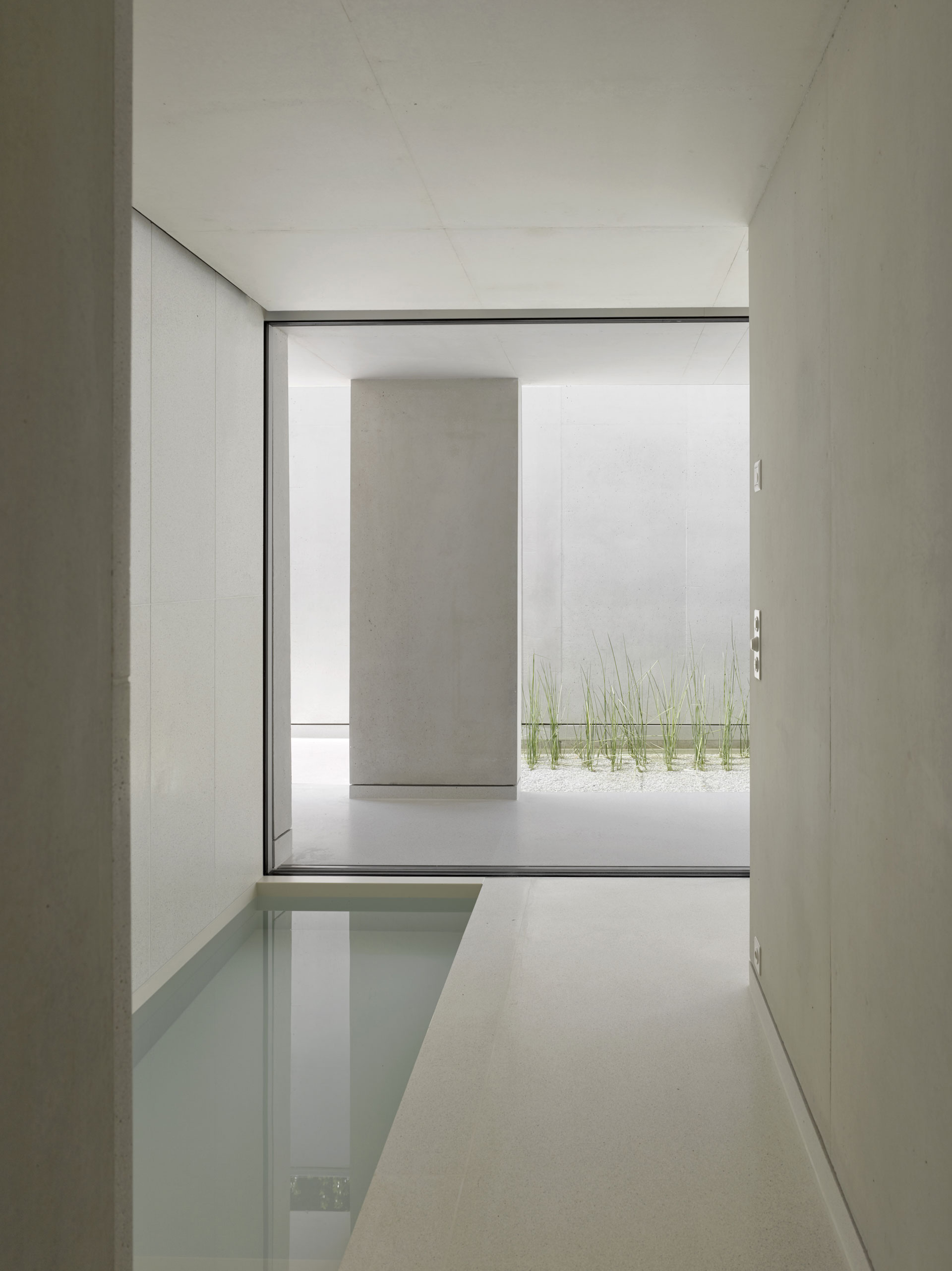 Der unterirdische Gästetrakt tangiert das bestehende Haus und seinen Garten kaum. Einzig das Impluvium, im bepflanzten Eingangsrondell versteckt, und der abgesenkte Gartenhof verbinden die neuen Räume mit dem Park und erzeugen im Innern spektakuläre Lichtstimmungen. Bezüge zu Werken unterschiedlichster Künstler verbinden den Bau auch auf kultureller Ebene mit seinem Umfeld, sei es zu den ʺsky-roomsʺ von James Turell, den Gartenpavillons von Dan Graham oder den Reflexionenspektakeln von Julio Le Parc.