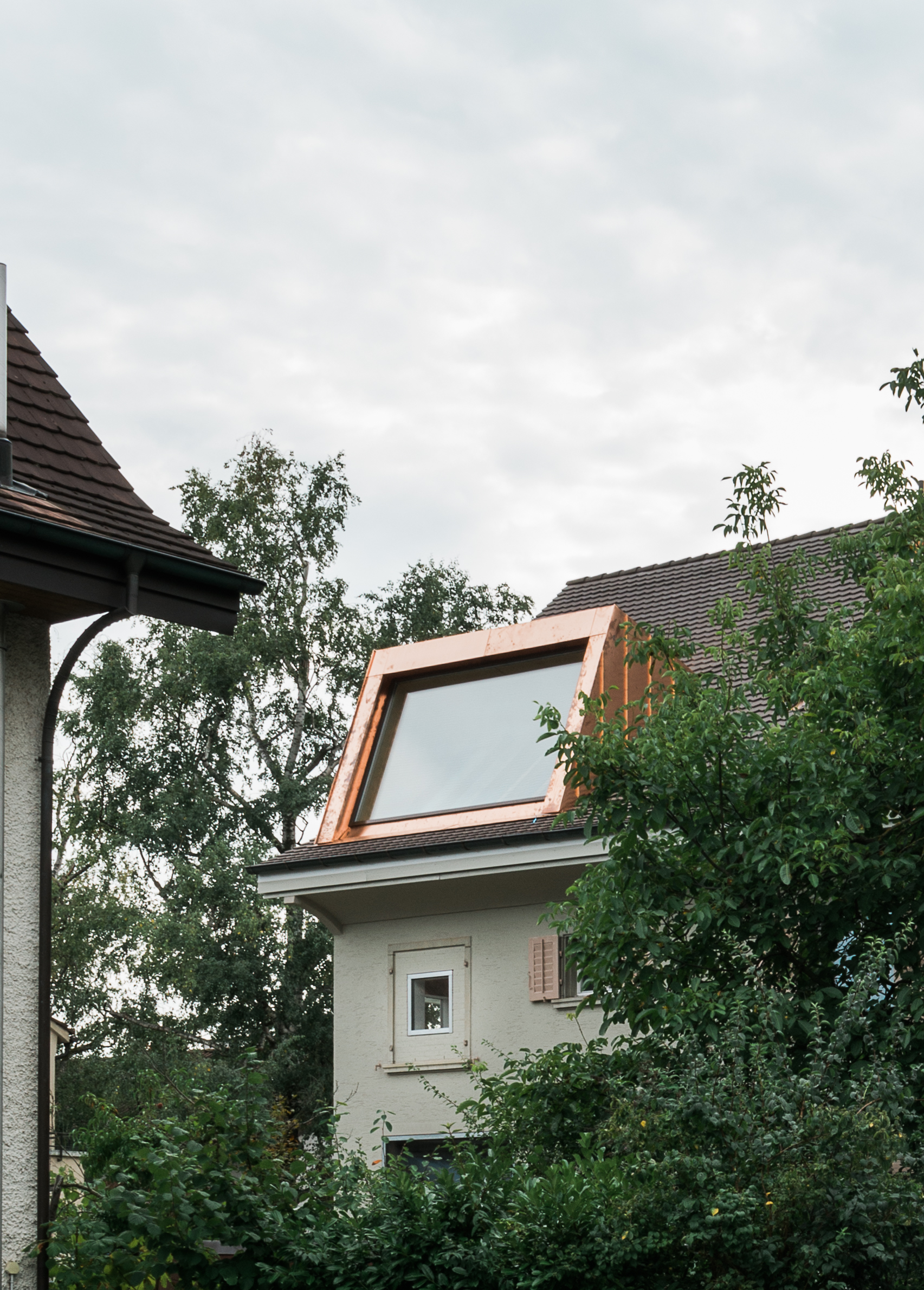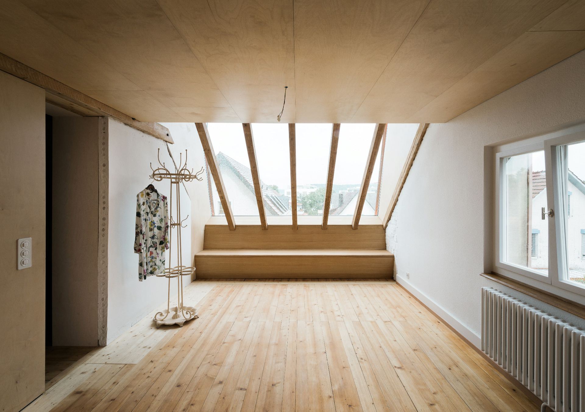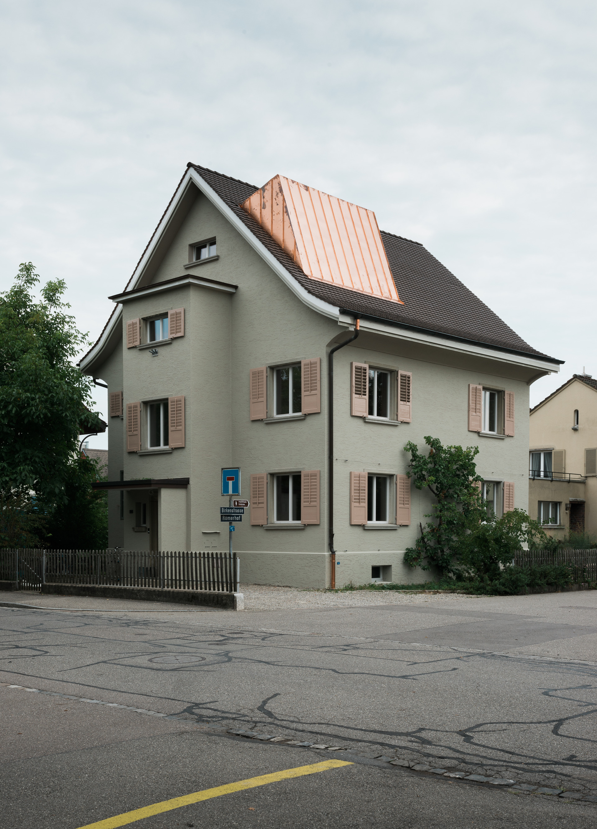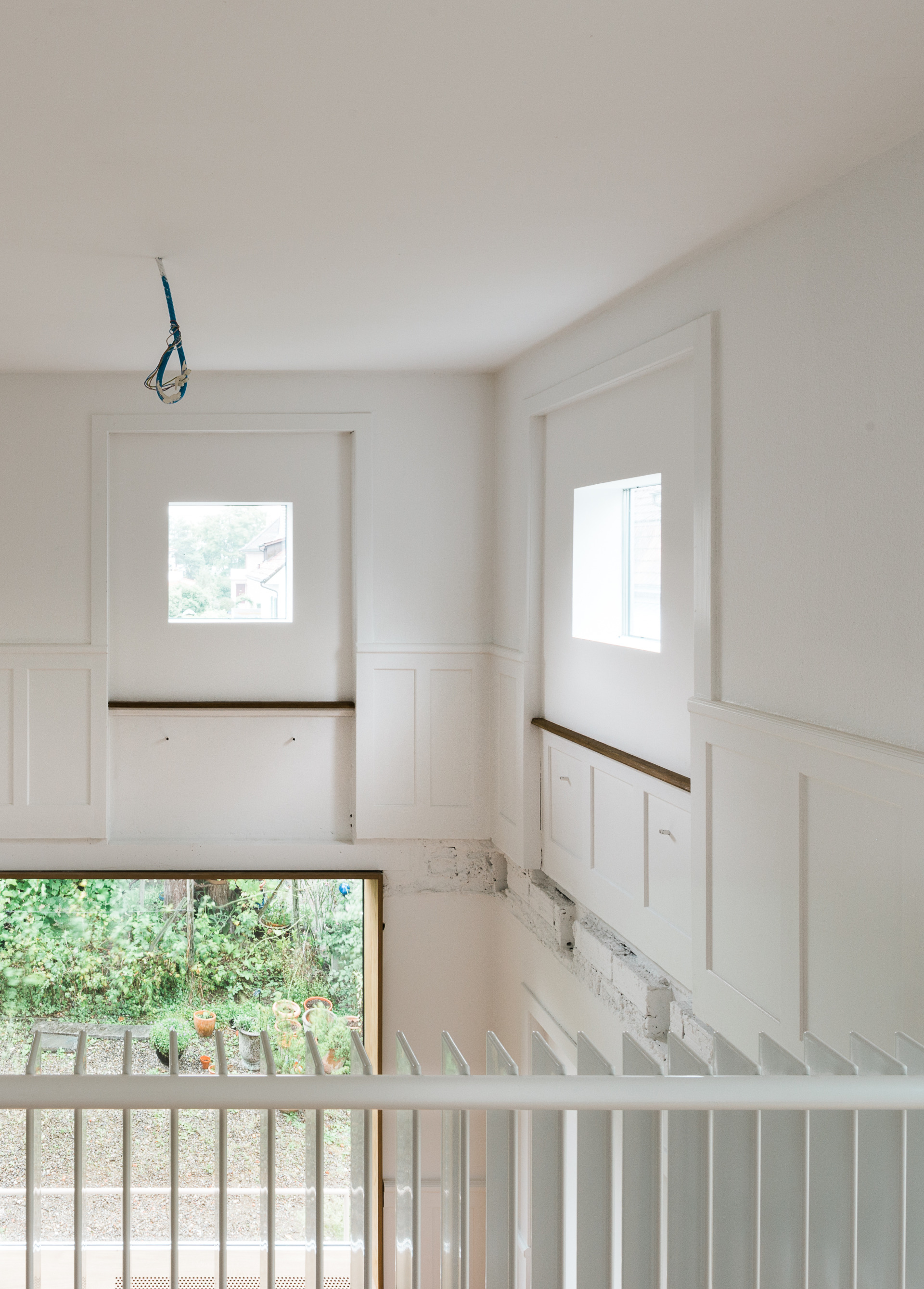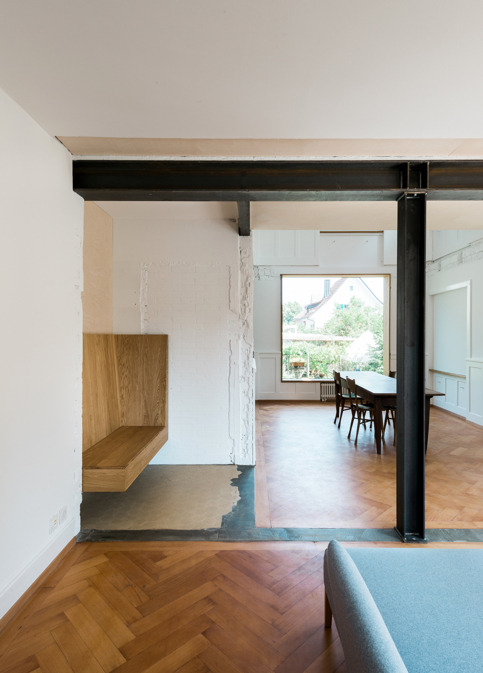 Das Wohnhaus aus den 1930er-Jahren mit zwei kleineren Geschosswohnungen wurde zu einem Einfamilienhaus umgenutzt. Vom Essbereich, dem neuen Zentrum des Hauses, erstreckt sich ein türloses Raumkontinuum über drei Geschosse. Feinjustierte Raumübergänge sowie vielfältige neue Sicht- und Aussenraumbezüge prägen die Atmosphäre. Die Mittel des Eingriffs sind Subtraktion durch präzise Schnitte, Abfangstrukturen aus Stahl wo nötig sowie punktuelle, raumbildende Sperrholzeinbauten. Dabei bleibt der Transformationsprozess sichtbar und ermöglicht ein gleichwertiges Nebeneinander von Bestand, Spuren der Transformation und neuen Elementen. Der identitätsstiftende, radikale Umgang mit dem Bestand zeigt sich so auf zwei Arten: In der Direktheit im Abbruch und der Kompromisslosigkeit im Erhalt.