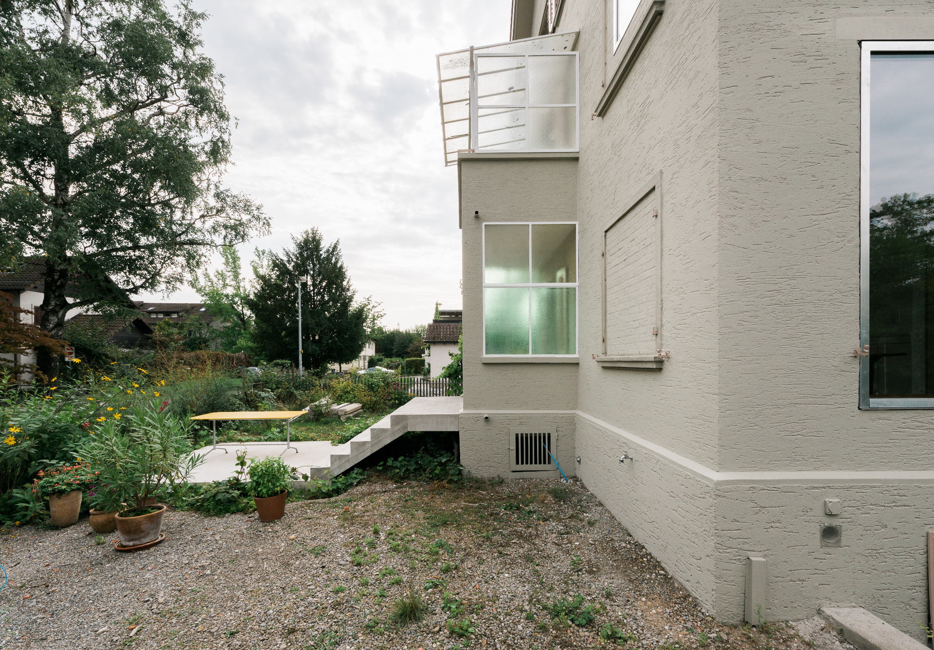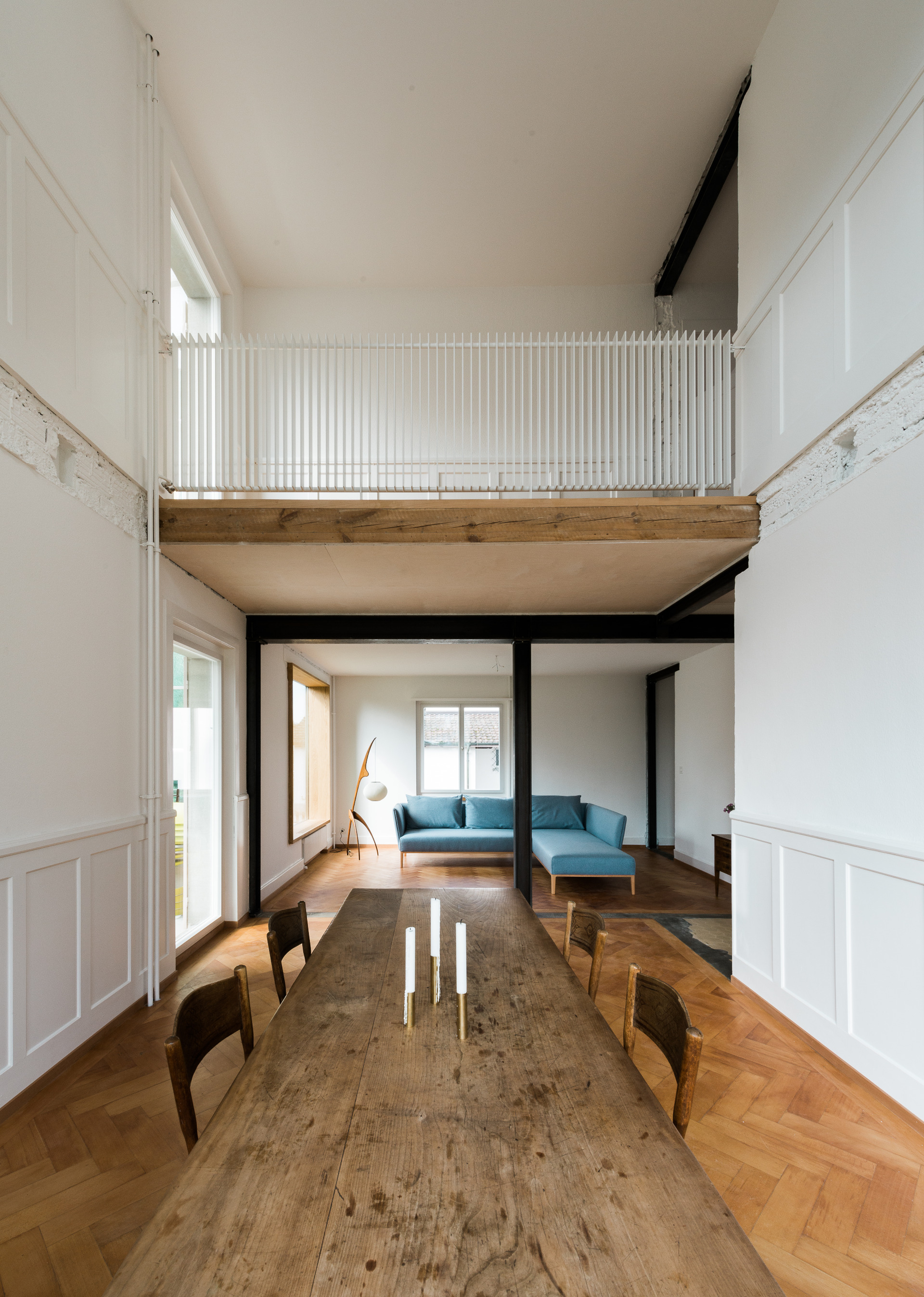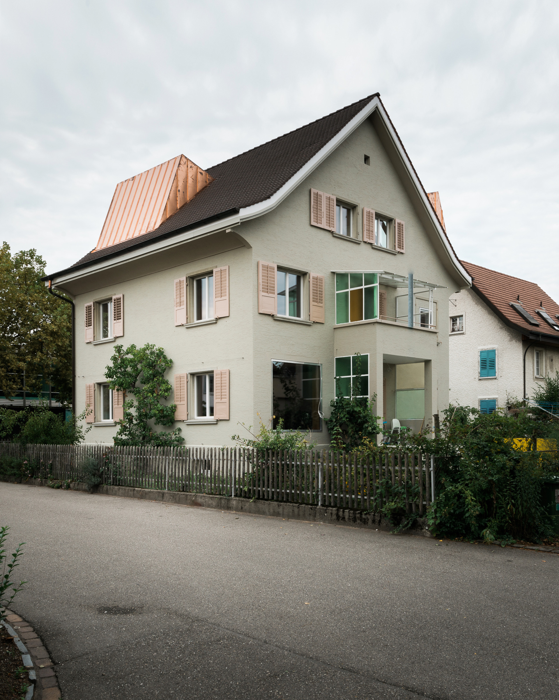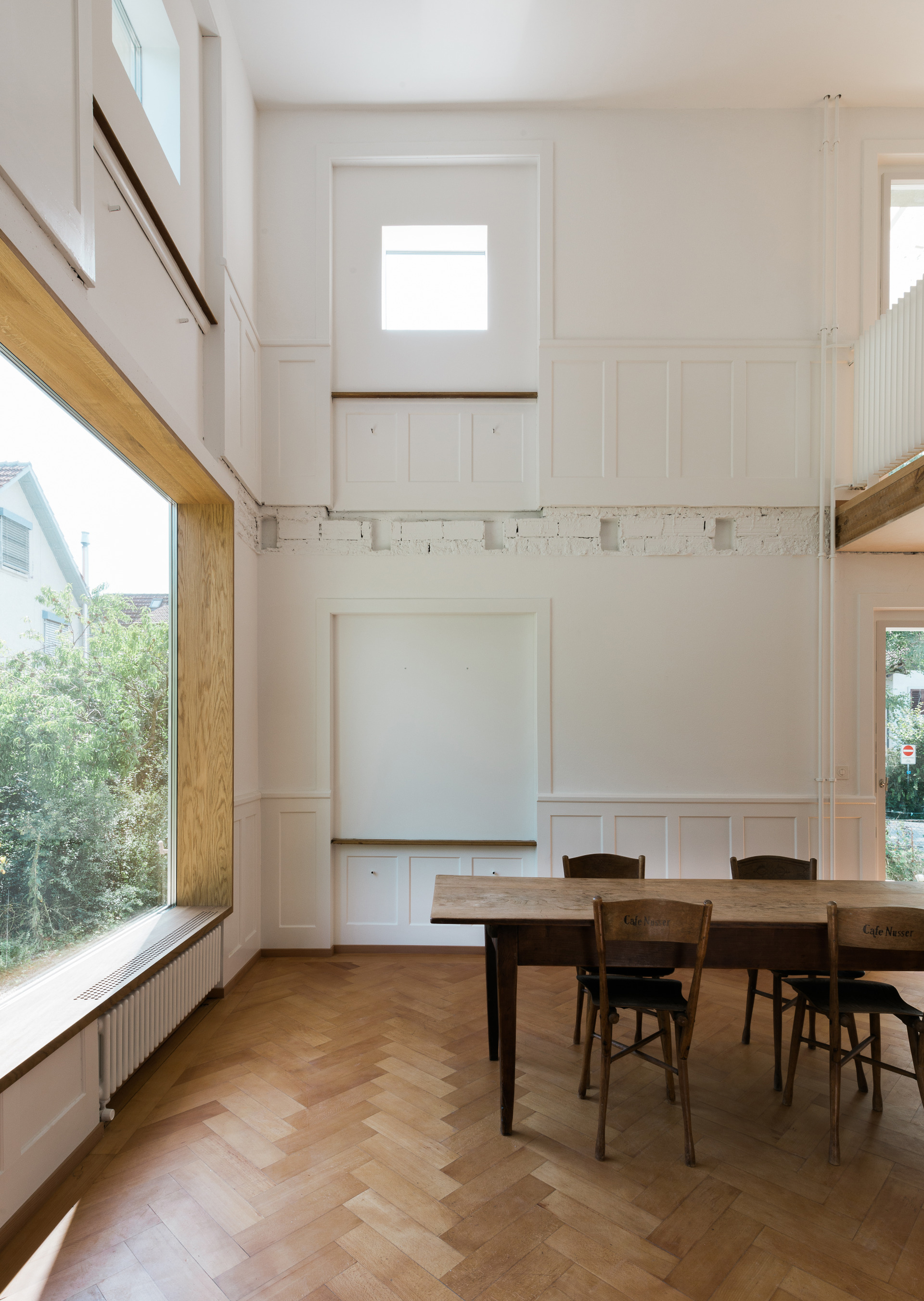 Das Wohnhaus aus den 1930er-Jahren mit zwei kleineren Geschosswohnungen wurde zu einem Einfamilienhaus umgenutzt. Vom Essbereich, dem neuen Zentrum des Hauses, erstreckt sich ein türloses Raumkontinuum über drei Geschosse. Feinjustierte Raumübergänge sowie vielfältige neue Sicht- und Aussenraumbezüge prägen die Atmosphäre. Die Mittel des Eingriffs sind Subtraktion durch präzise Schnitte, Abfangstrukturen aus Stahl wo nötig sowie punktuelle, raumbildende Sperrholzeinbauten. Dabei bleibt der Transformationsprozess sichtbar und ermöglicht ein gleichwertiges Nebeneinander von Bestand, Spuren der Transformation und neuen Elementen. Der identitätsstiftende, radikale Umgang mit dem Bestand zeigt sich so auf zwei Arten: In der Direktheit im Abbruch und der Kompromisslosigkeit im Erhalt.
