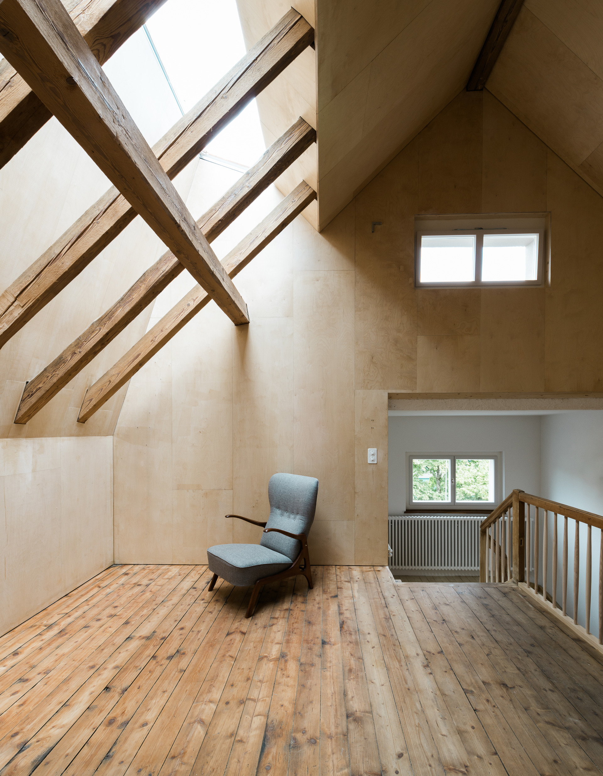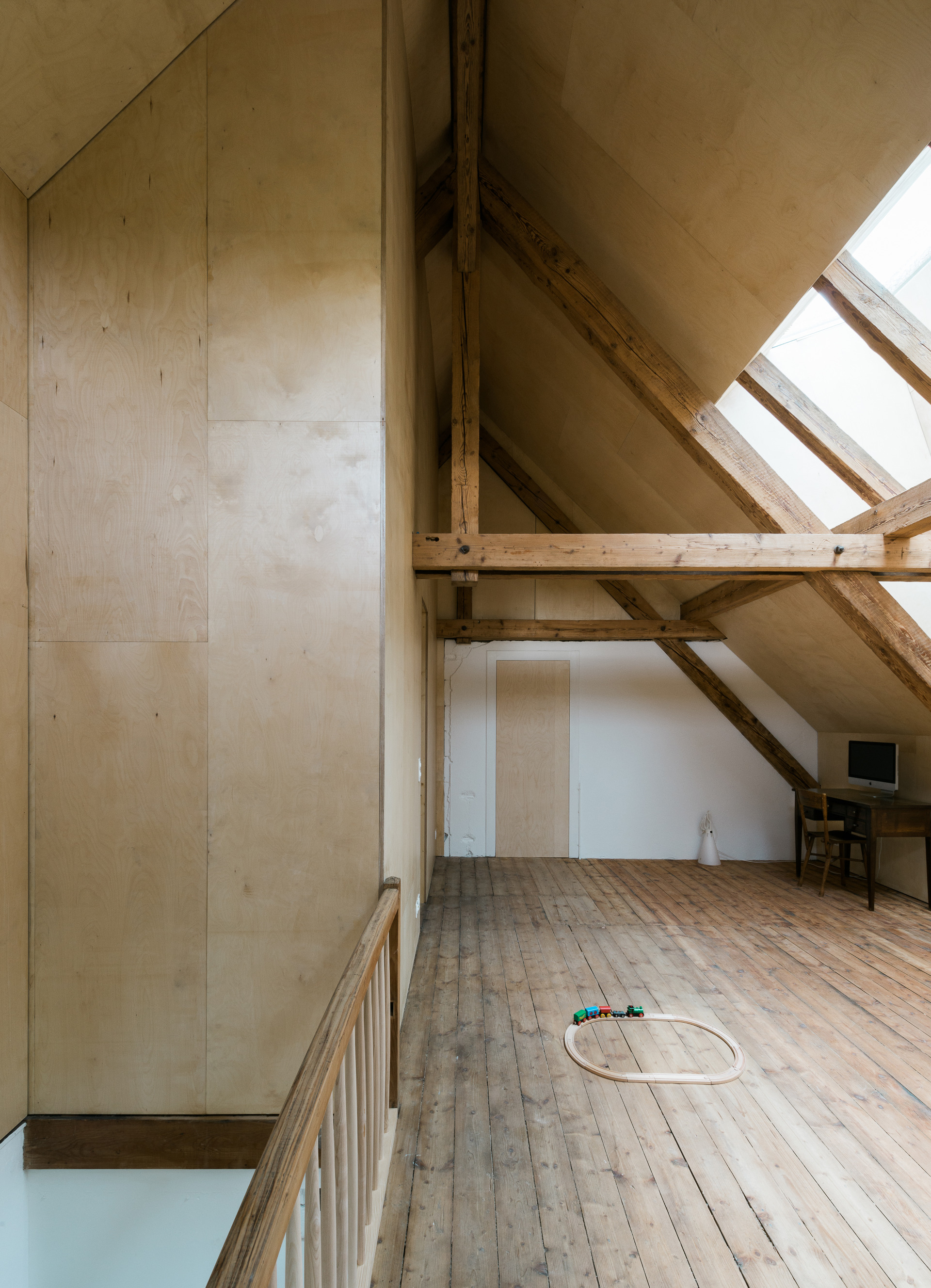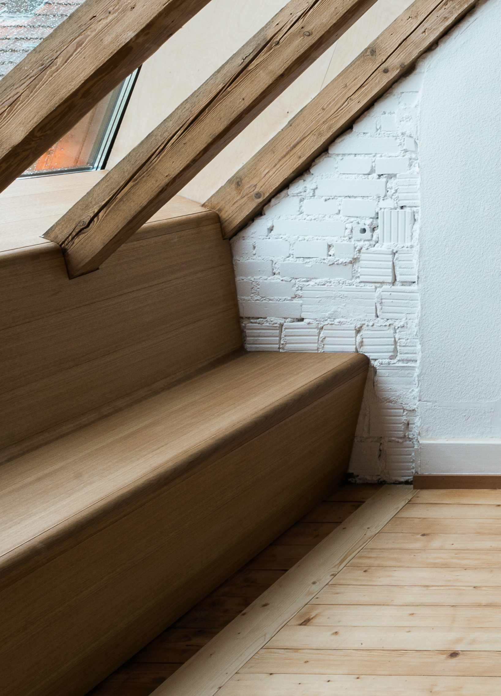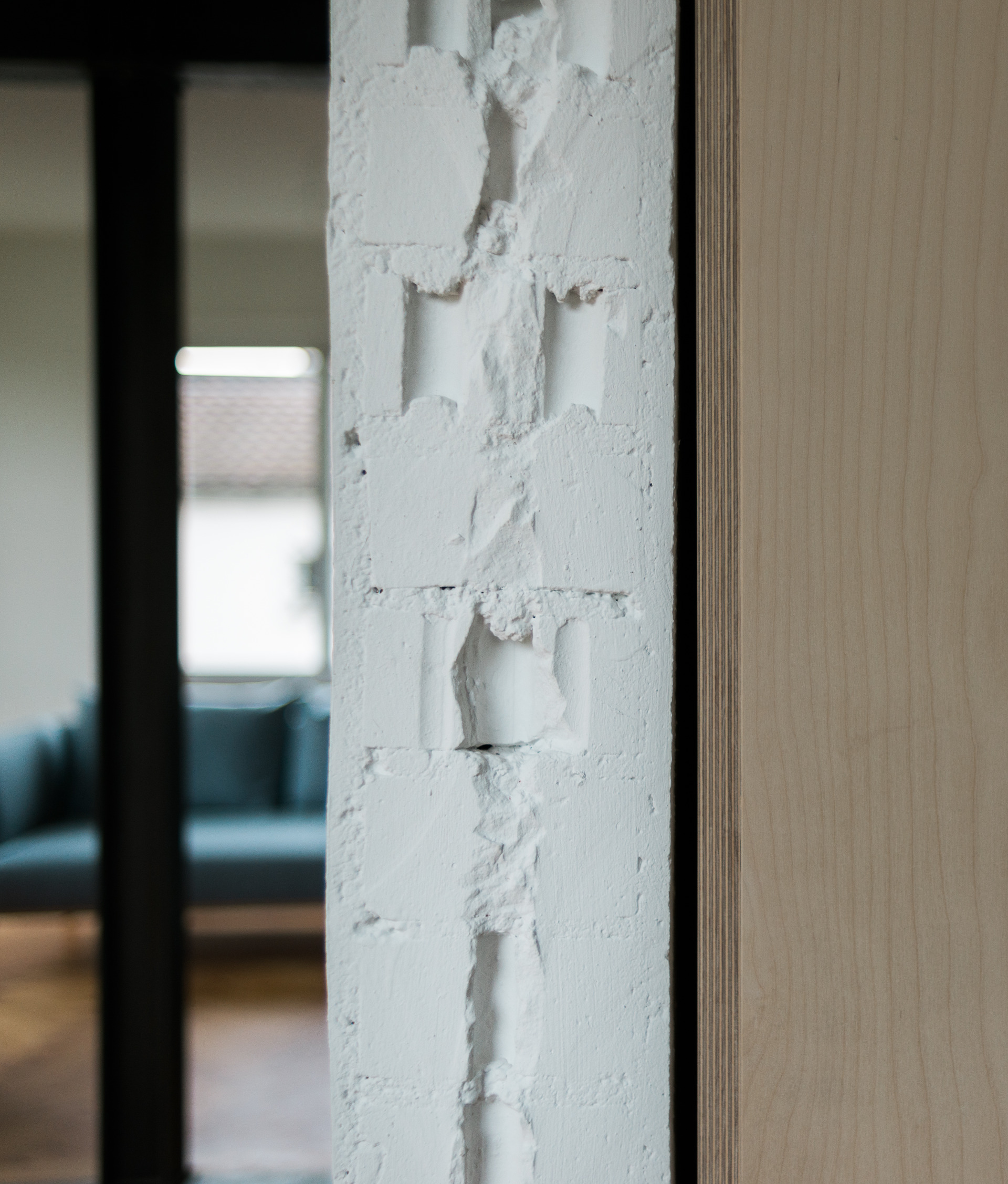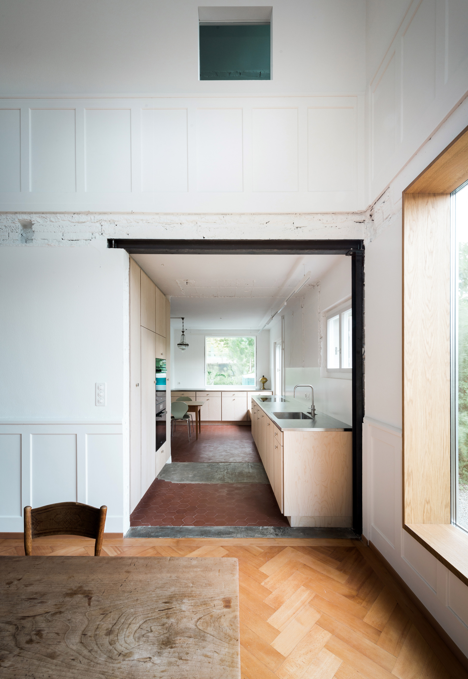 Das Wohnhaus aus den 1930er-Jahren mit zwei kleineren Geschosswohnungen wurde zu einem Einfamilienhaus umgenutzt. Vom Essbereich, dem neuen Zentrum des Hauses, erstreckt sich ein türloses Raumkontinuum über drei Geschosse. Feinjustierte Raumübergänge sowie vielfältige neue Sicht- und Aussenraumbezüge prägen die Atmosphäre. Die Mittel des Eingriffs sind Subtraktion durch präzise Schnitte, Abfangstrukturen aus Stahl wo nötig sowie punktuelle, raumbildende Sperrholzeinbauten. Dabei bleibt der Transformationsprozess sichtbar und ermöglicht ein gleichwertiges Nebeneinander von Bestand, Spuren der Transformation und neuen Elementen. Der identitätsstiftende, radikale Umgang mit dem Bestand zeigt sich so auf zwei Arten: In der Direktheit im Abbruch und der Kompromisslosigkeit im Erhalt.