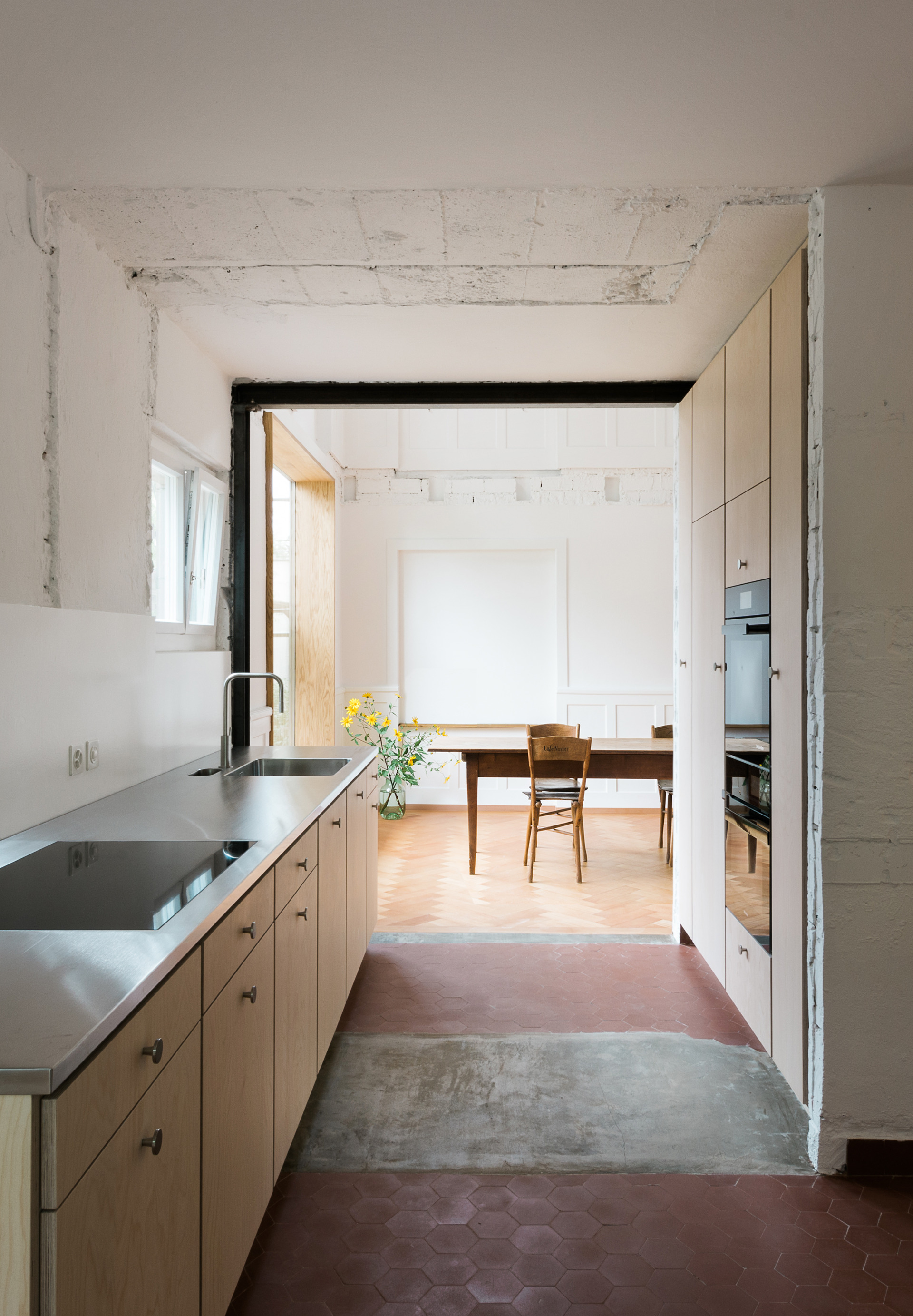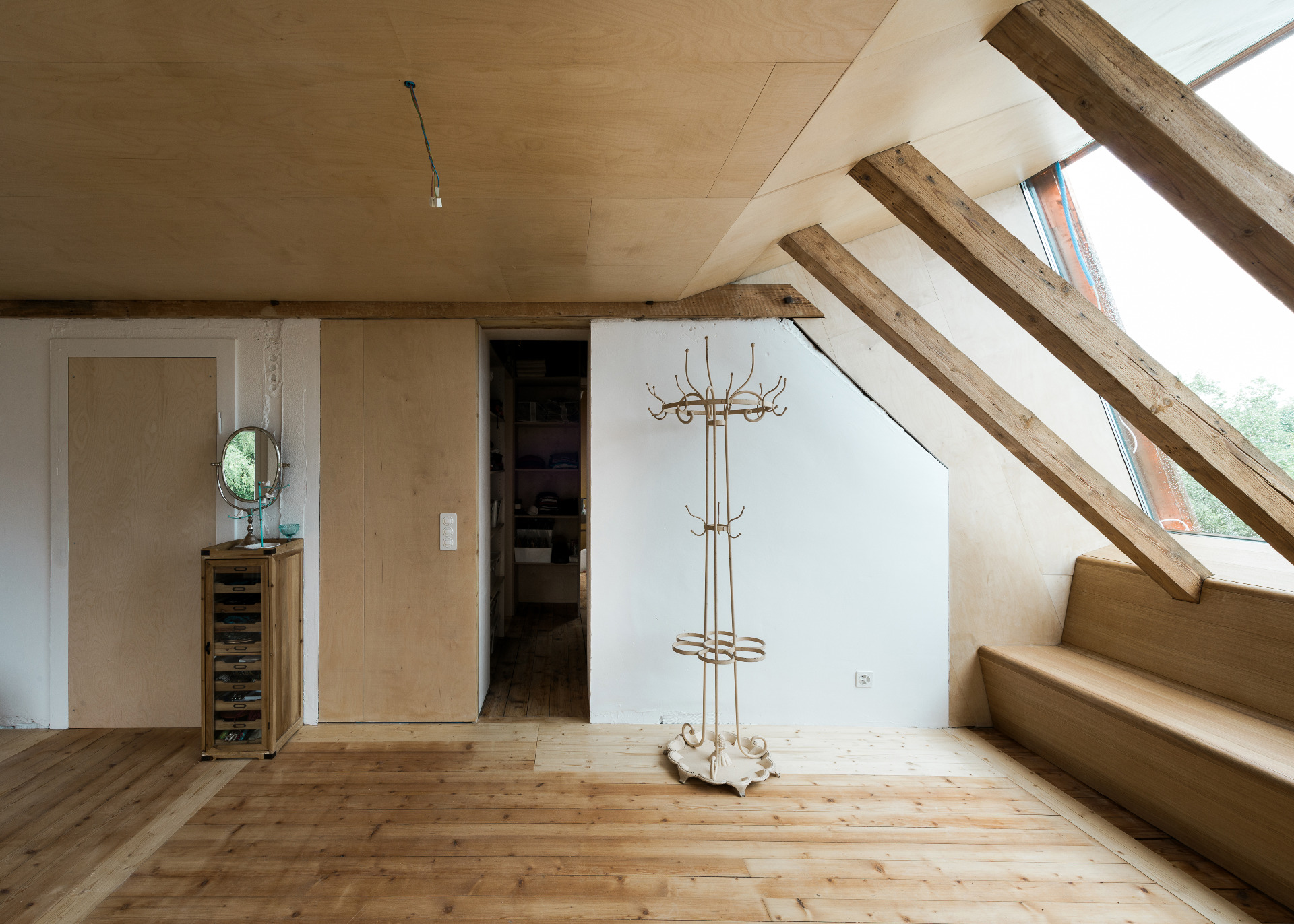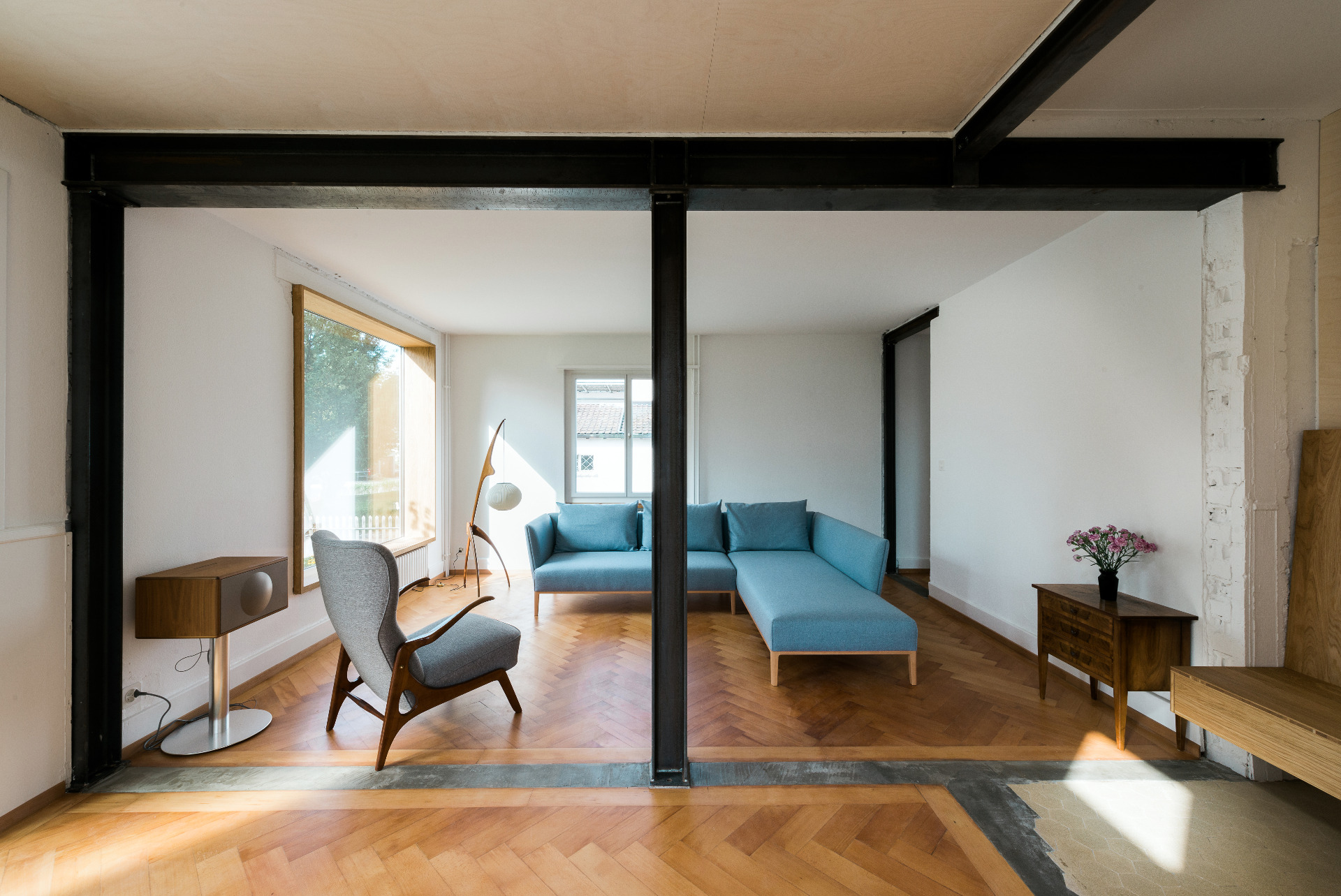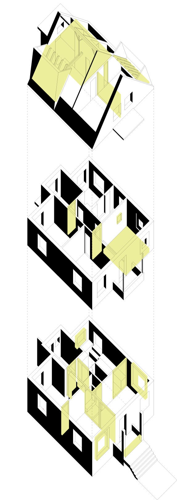 Das Wohnhaus aus den 1930er-Jahren mit zwei kleineren Geschosswohnungen wurde zu einem Einfamilienhaus umgenutzt. Vom Essbereich, dem neuen Zentrum des Hauses, erstreckt sich ein türloses Raumkontinuum über drei Geschosse. Feinjustierte Raumübergänge sowie vielfältige neue Sicht- und Aussenraumbezüge prägen die Atmosphäre. Die Mittel des Eingriffs sind Subtraktion durch präzise Schnitte, Abfangstrukturen aus Stahl wo nötig sowie punktuelle, raumbildende Sperrholzeinbauten. Dabei bleibt der Transformationsprozess sichtbar und ermöglicht ein gleichwertiges Nebeneinander von Bestand, Spuren der Transformation und neuen Elementen. Der identitätsstiftende, radikale Umgang mit dem Bestand zeigt sich so auf zwei Arten: In der Direktheit im Abbruch und der Kompromisslosigkeit im Erhalt.